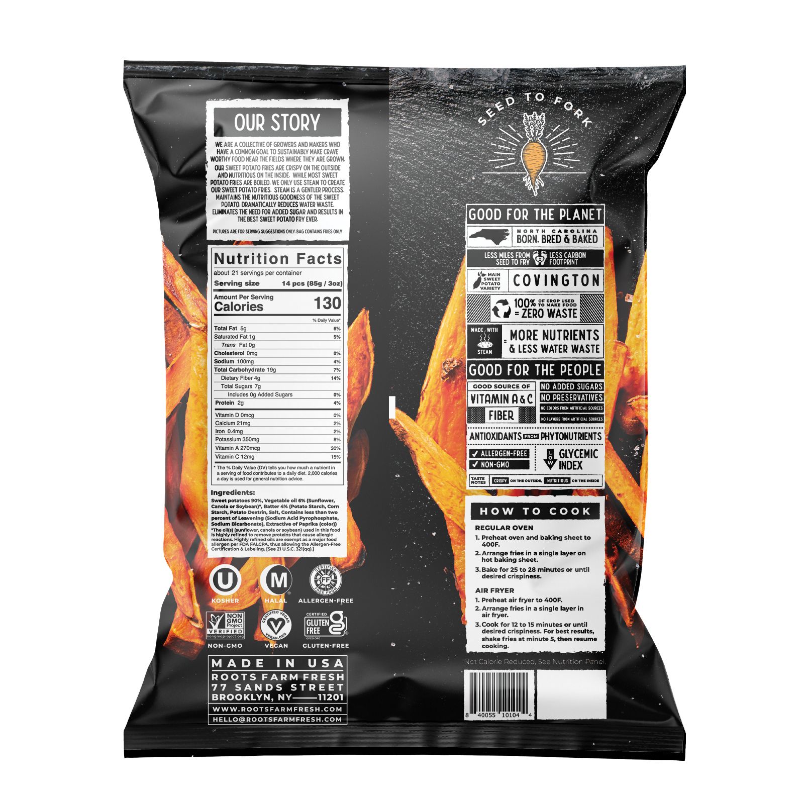 Roots Farm Fresh Sweet Potato Fries are the cleanest and crispiest on Planet Earth. While most fries are boiled, these sweet potato fries are steamed which keeps them crispy on the outside and nutritious on the inside. Roots Farm makes their products near where the farmers grow their ingredients, and they work diligently to use all parts of the sweet potato to minimize any food waste. One way they do this is by using upcycled sweet potatoes. Upcycled are the potatoes that are considered "ugly" or "misshapen" and would have otherwise been left in the field to rot. Each fry is certified as gluten-free, non-GMO, vegan, allergen-free, kosher and halal. Roots Farms products are good sources of vitamin A and C and fiber. Roots products do not contain any preservatives, added sugar, artificial colors or artificial flavors.