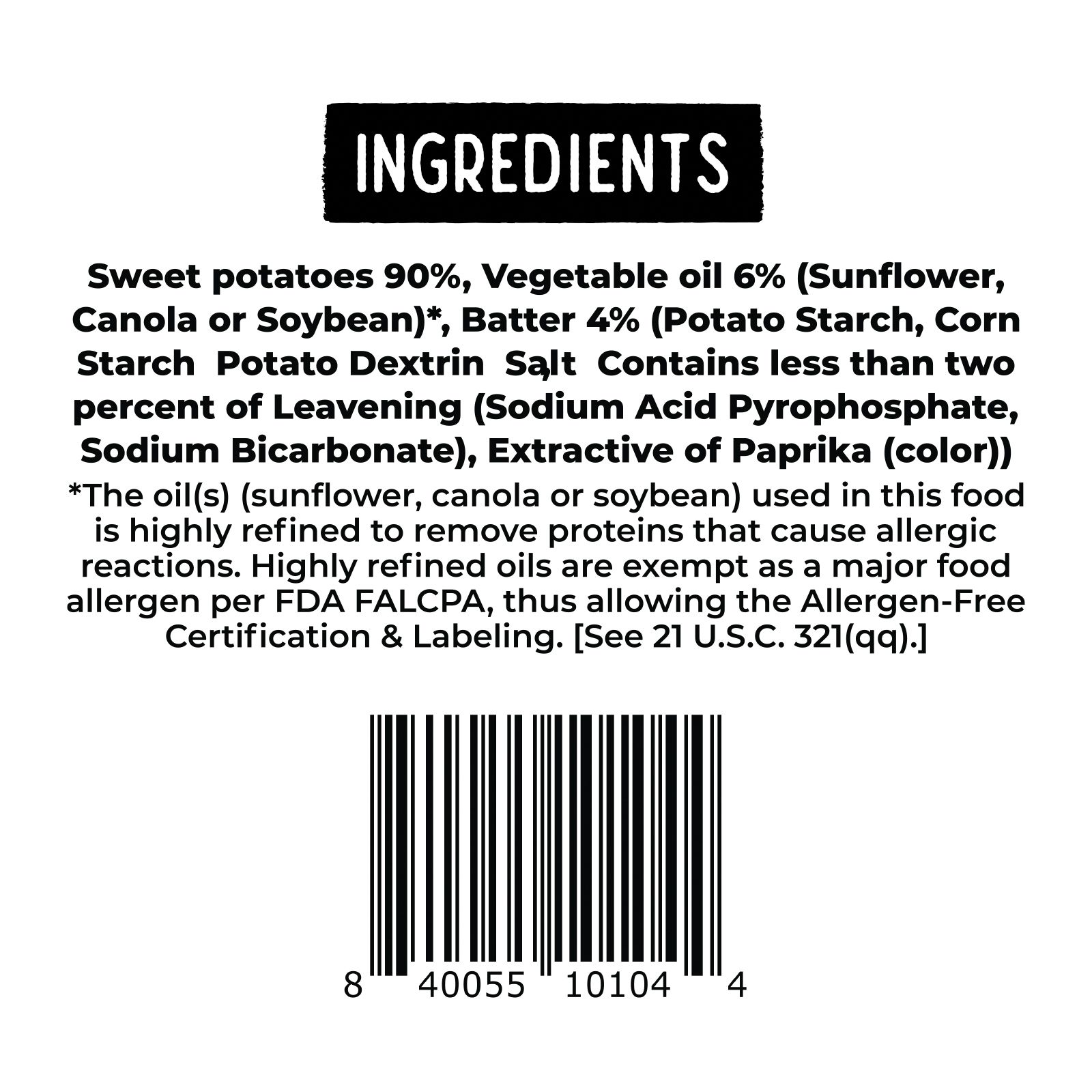 Ingredients: Sweet Potatoes 90%, Vegetable Oil 6% (Sunflower Or Soybean)*, Batter 4% (Potato Starch, Rice Flour, Corn Starch, Salt, Dextrin, Contains Less Than Two Percent Of Leavening (Sodium Acid Pyrophosphate, Sodium Bicarbonate), Extractive Of Paprika (Color)) * The Oil(s) (Sunflower, Canola Or Soybean) Used In This Food Is Highly Refined To Remove Proteins That Cause Allergic Reactions. Highly Refined Oils Are Exempt As A Major Food Allergen Per FDA FALCPA, Thus Allowing The Allergen-free Certification & Labeling. [See 21 U.S.C. 321(qq).]