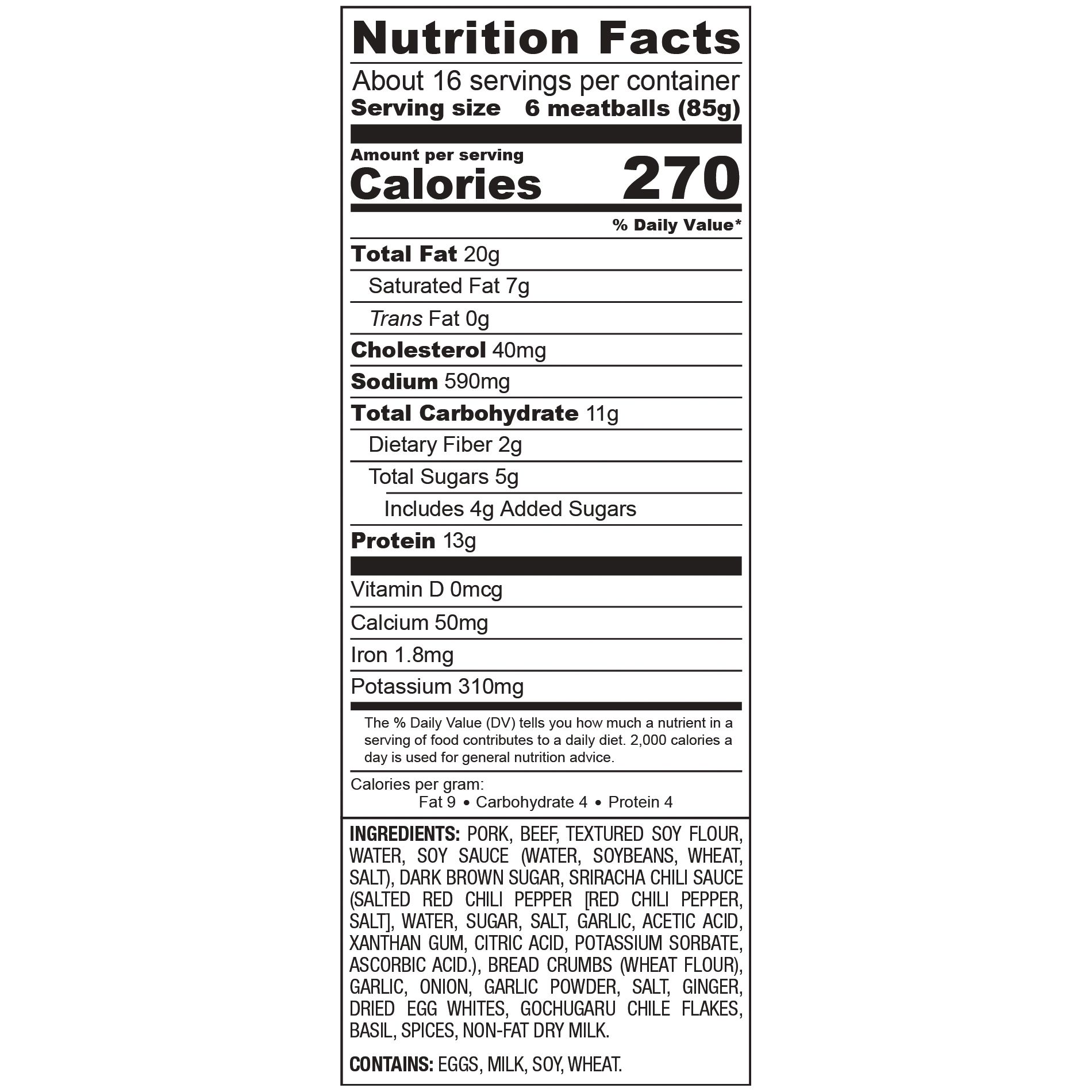 Ingredients: Pork, Beef, Textured Soy Flour, Water, Soy Sauce (Water, Soybeans, Wheat, Salt), Dark Brown Sugar, Sriracha Chili Sauce (Salted Red Chili Pepper [Red Chili Pepper, Salt], Water, Sugar, Salt, Garlic, Acetic Acid, Xanthan Gum, Citric Acid, Potassium Sorbate, Ascorbic Acid), Bread Crumbs (Wheat Flour), Garlic, Onion, Garlic Powder, Salt, Ginger, Dried Egg Whites, Gochugaru Chile Flakes, Basil, Spices, Non-fat Dry Milk.