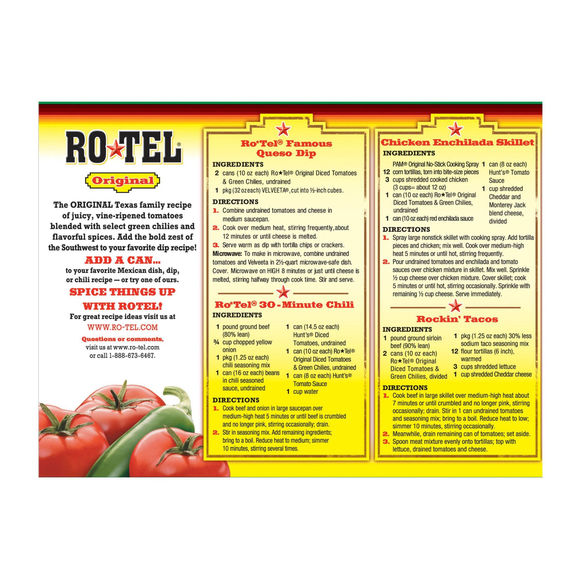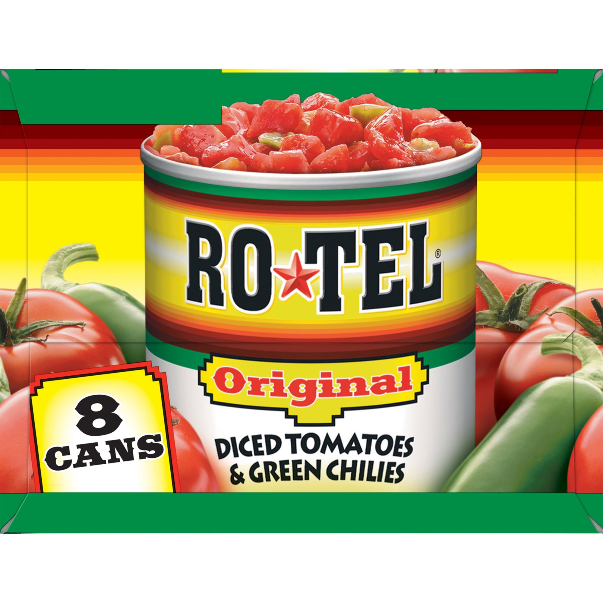 Diced tomatoes and green chilies Original recipe Adds a spicy kick to any dish Great for making salsa, burritos, or queso dips Includes eight pack of 10-oz. Rotel Diced Tomatoes and Green Chilies cans