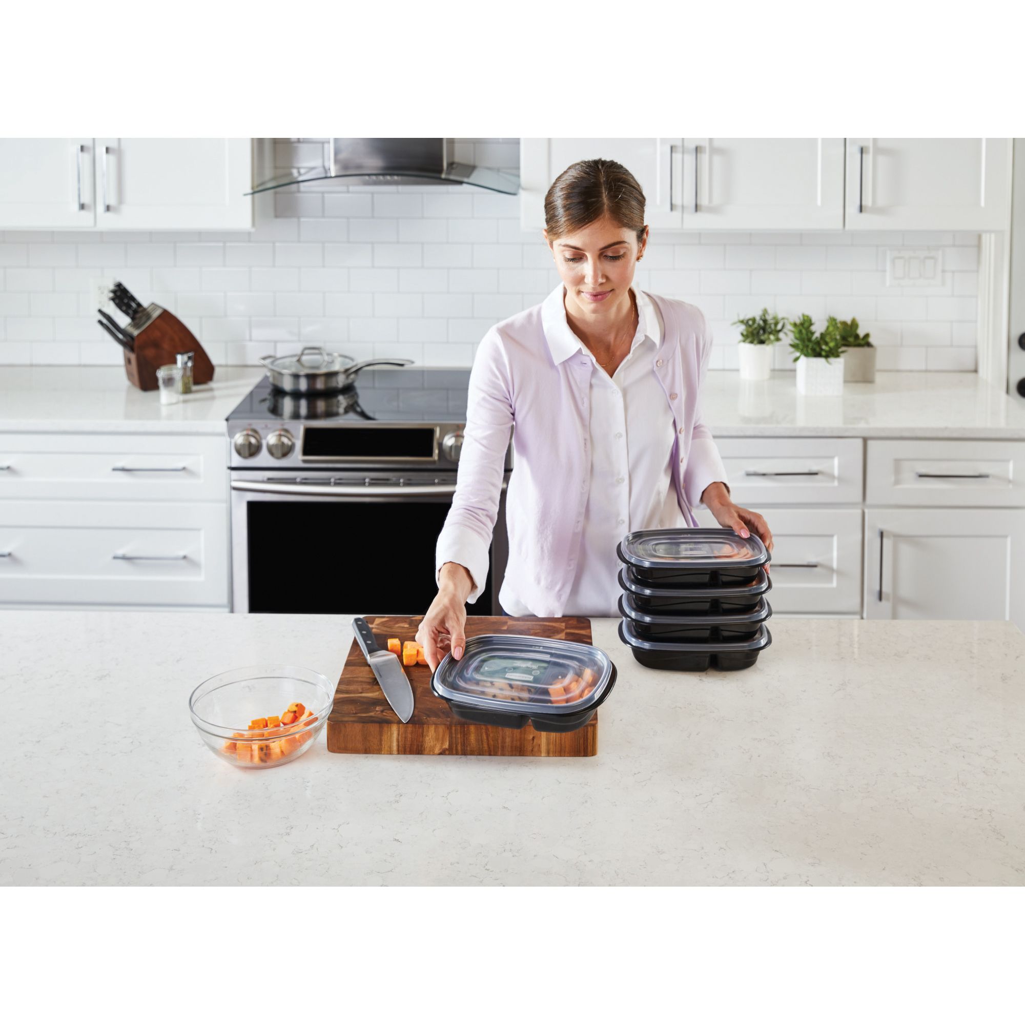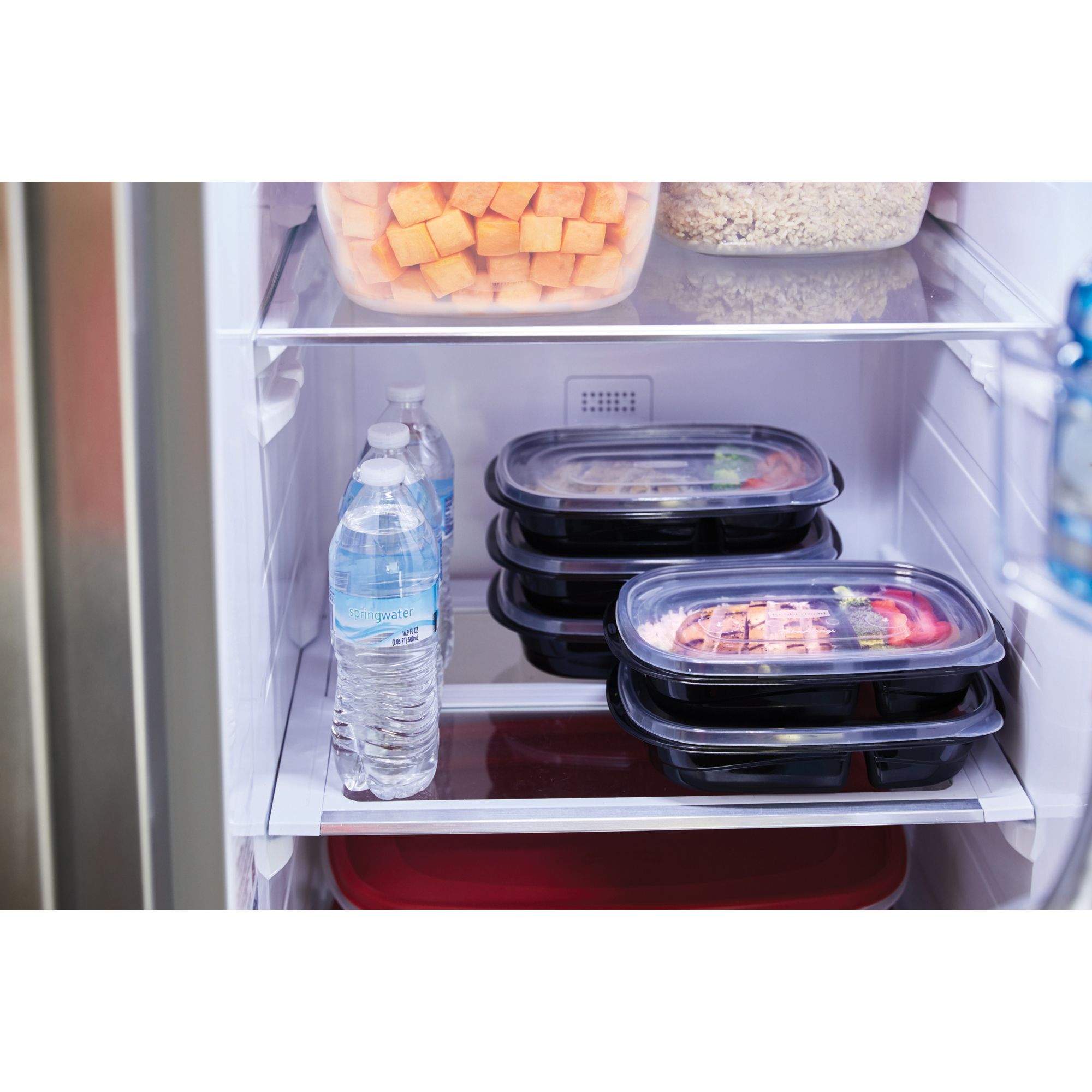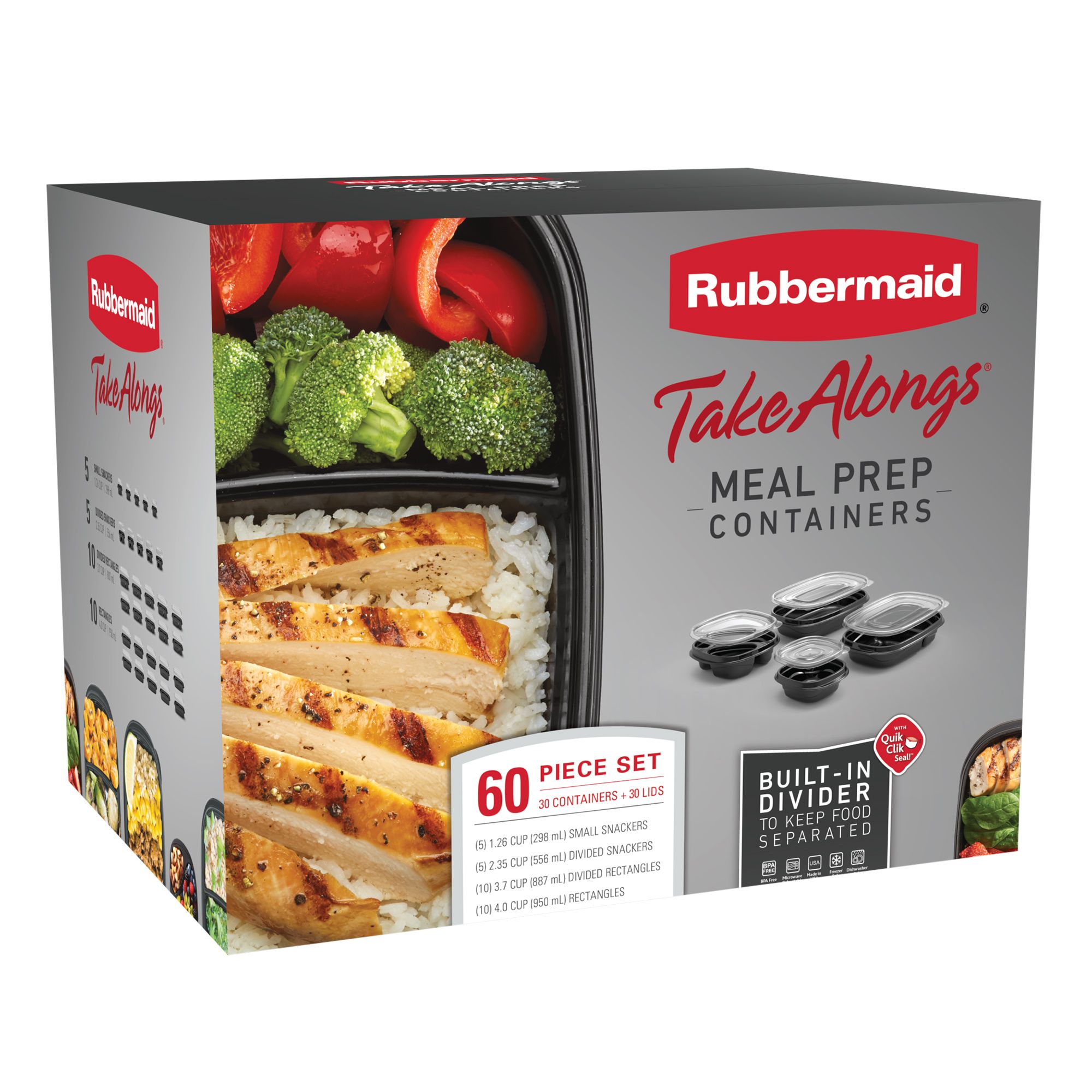 Rubbermaid TakeAlongs divided meal prep containers are ideal for preparing and storing meals in advance, as well as for lunches, leftovers, and more. Built-in, bento-box style dividers keep foods separated until you're ready to eat. Quik Clik Seal lids audibly snap tight to the base so you know they're securely closed. Ridged lids allow containers to securely stack on top of each other in the fridge or freezer, and containers nest when not in use for space-efficient storage.