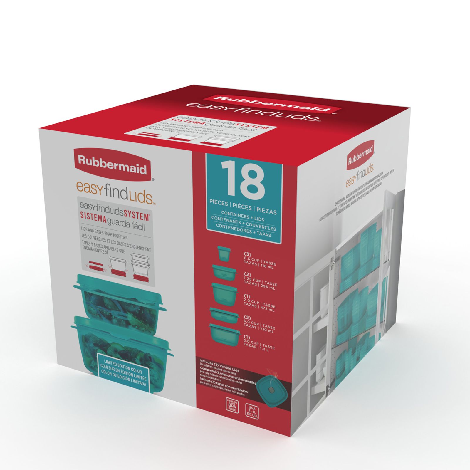 Find the right lid, right now. This 18-Pc. food storage container set features the Rubbermaid Easy Find Lid system: the lids snap onto the container bases as well as other same-size lids so that the right lid is always at your fingertips. These graduated-size containers nest together to give you more space in the fridge or cupboard.
