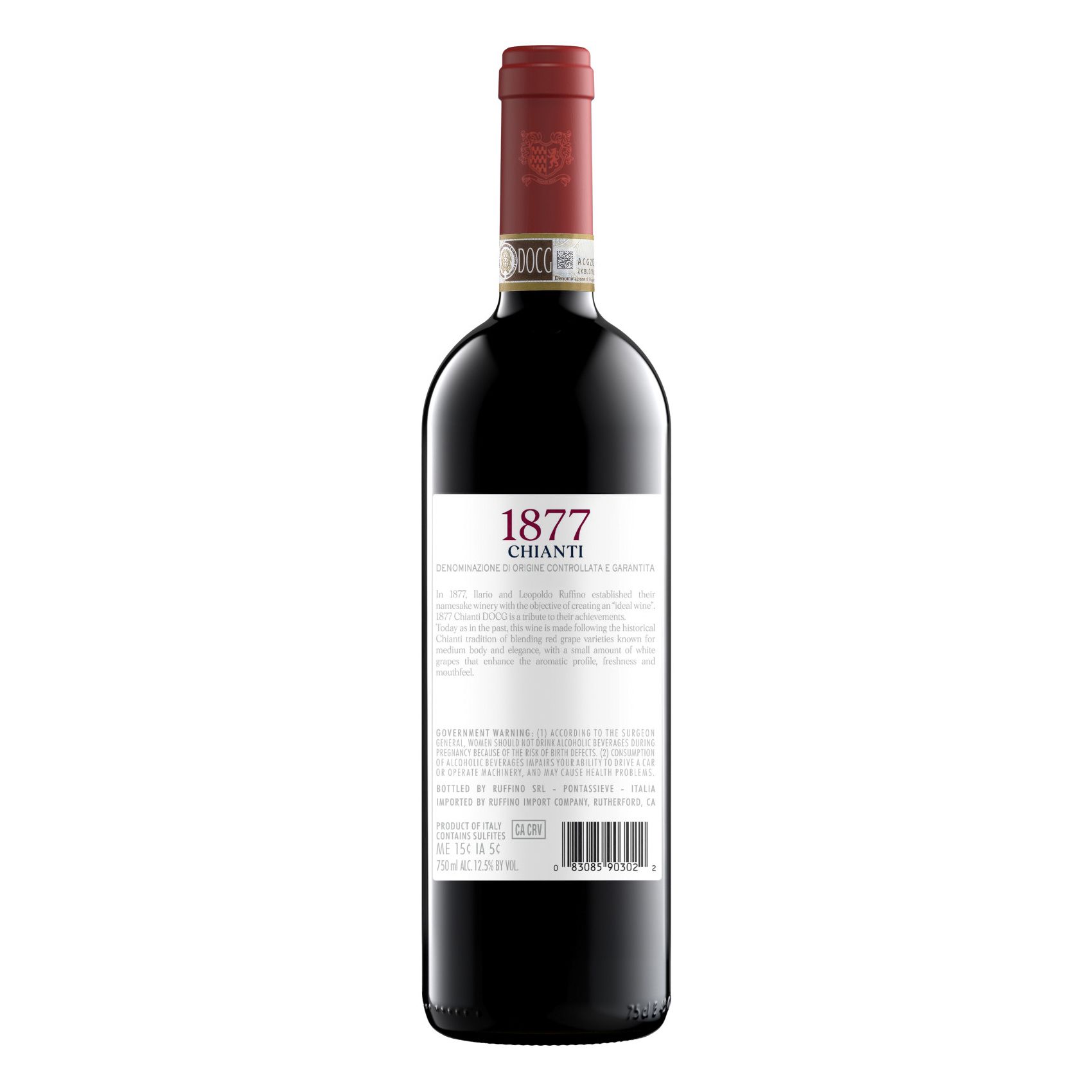 One 750ml bottle of Ruffino 1877 Chianti DOCG Red Wine, containing five 5 fl. oz. glasses of wine