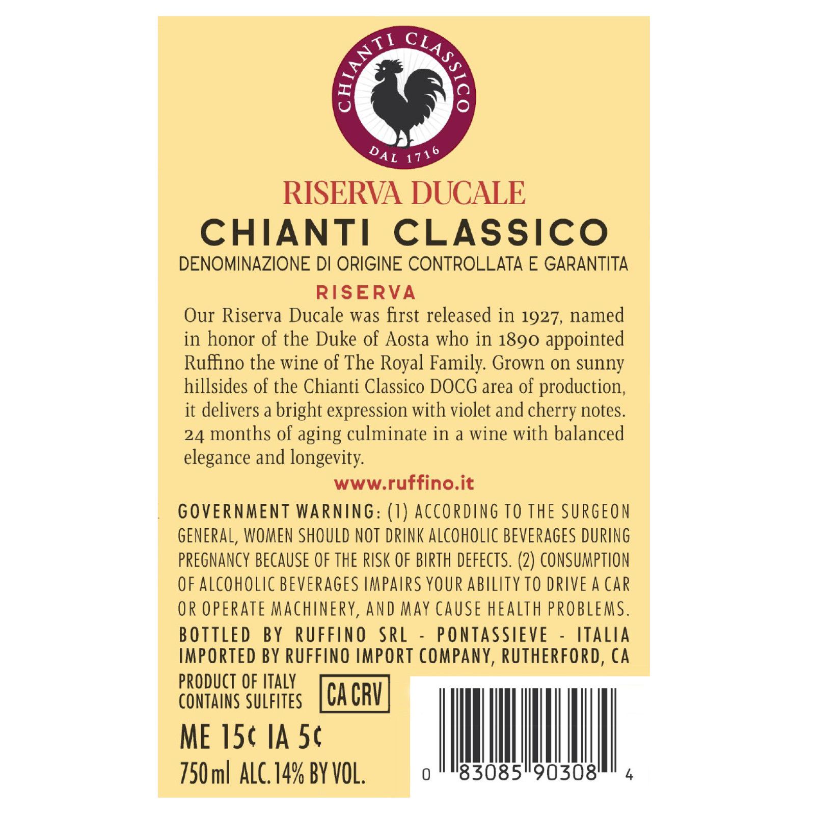 Includes one 750ml bottle of Ruffino Riserva Ducale Chianti Classico Red Blend Wine, containing five 5 fl. oz. glasses of wine