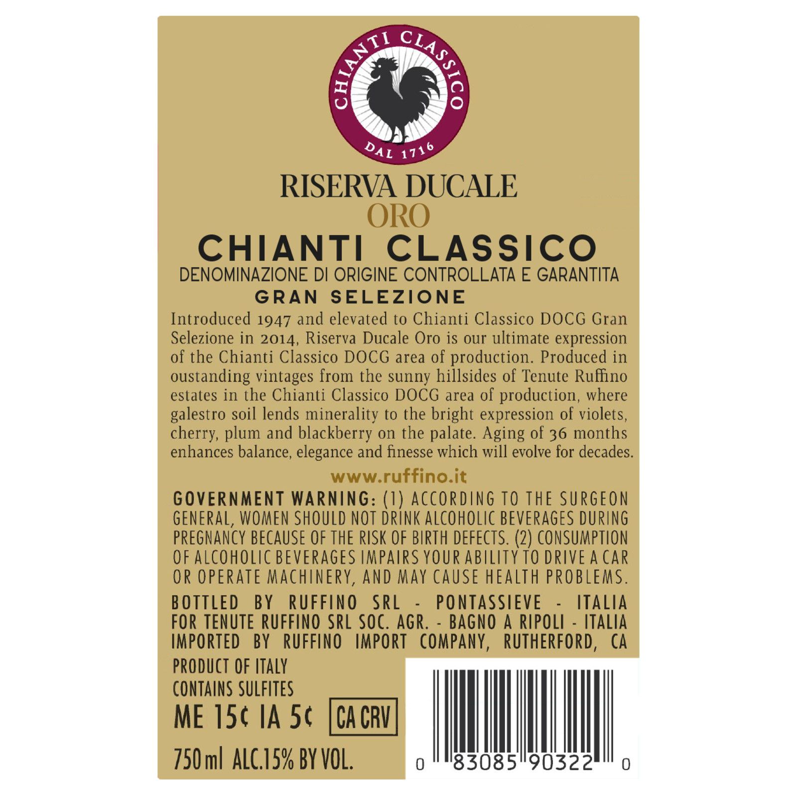 Ruffino Riserva Ducale Oro Chianti Classico Red Wine is a fine wine blend that is the ultimate expression of the Chianti Classico winemaking region. The first vintage of Riserva Ducale Oro dates back to 1947. This full-bodied Chianti wine opens with intense aromas of cherry, plum, and violet, with hints of eucalyptus, chocolate, and black pepper. The finish reveals pleasing sensations of tobacco and hints of plum and balsamic notes. Riserva Ducale Oro is made with carefully selected grapes that are fermented and macerated in stainless steel vats. The wine is then aged for 12 months in concrete vats, followed by 12 more months in second-use barrels, and finally 12 additional months in large Slavonian oak casks. This bottled wine will age gracefully for decades. For the best flavor, store at room temperature, and then serve slightly chilled. Share this fine Chianti wine bottle with friends or enjoy a glass of wine on its own. Please enjoy our wines responsibly. 2025 Ruffino Import Company, Rutherford, CA.