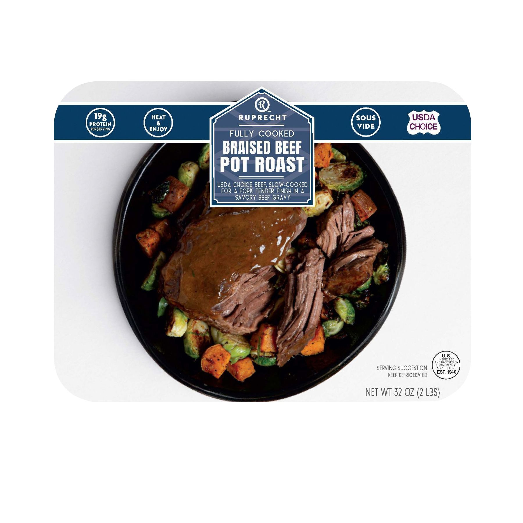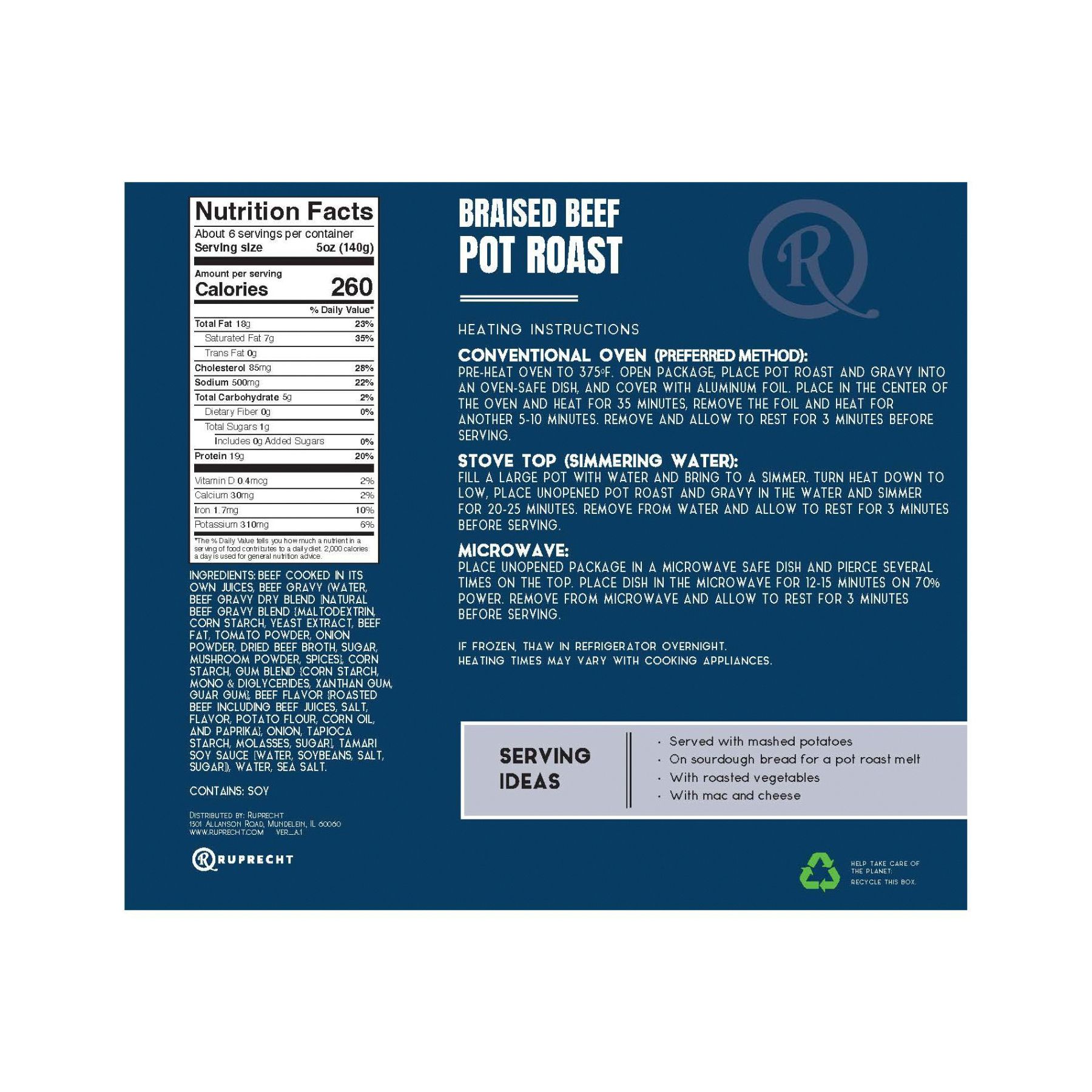 USDA Choice Beef slow cooked until fork-tender in a homestyle gravy. This fully cooked entree is ready to eat - no prep work needed! Ruprecht's Pot Roast is tender and ready to pull to make multiple portions. Pair it easily with mashed potatoes or a thick slice of bread to soak up the gravy. Provide a balanced meal by adding roasted vegetables such as brussel sprouts or carrots. Just heat and eat - dinner is ready in 12 minutes.
