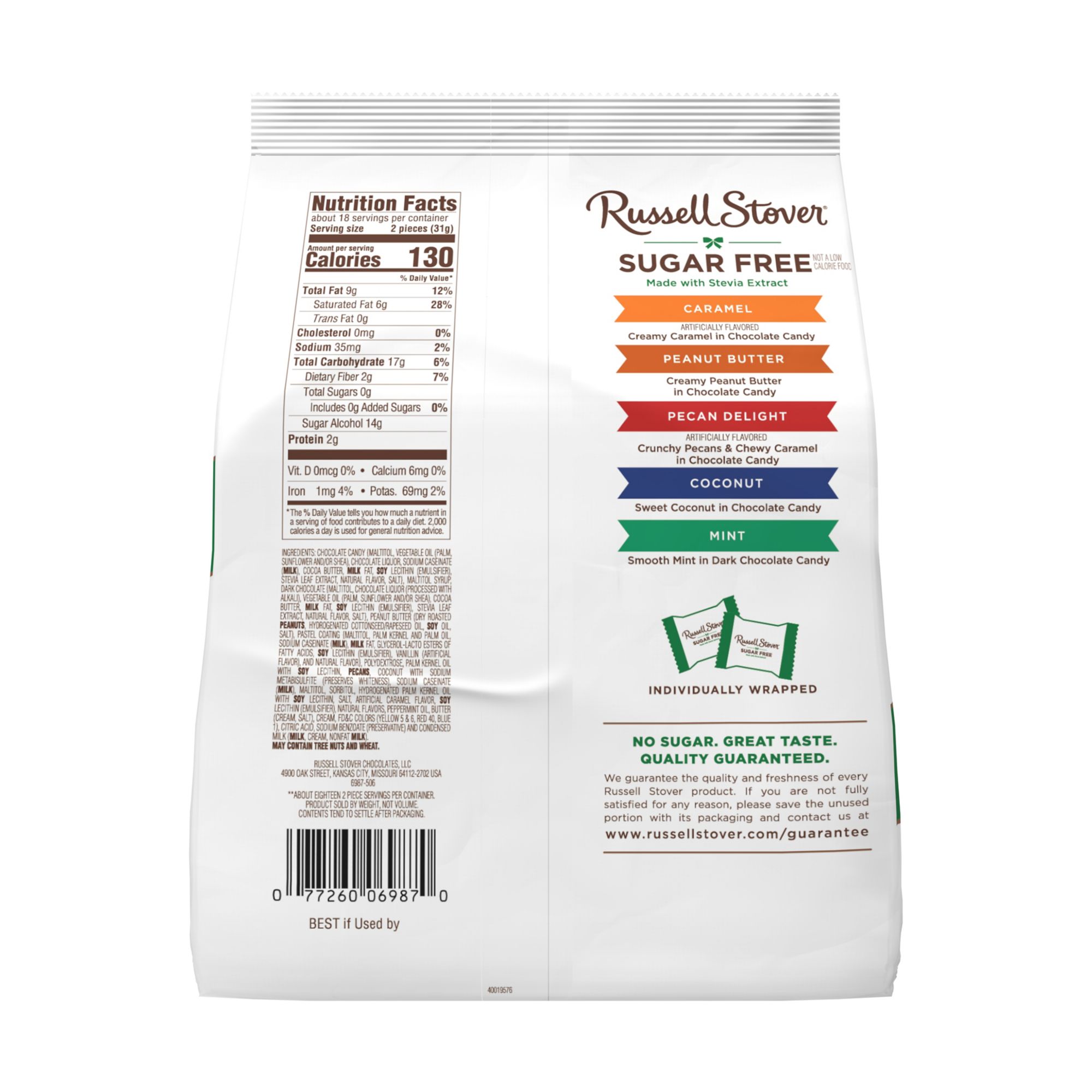 19.9 oz bag contains about 37 individually wrapped pieces of 5 sugar free candy favorites: Mint Patty in dark chocolate and Caramel, Peanut Butter Cup, Pecan Delight and Coconut in chocolate candy