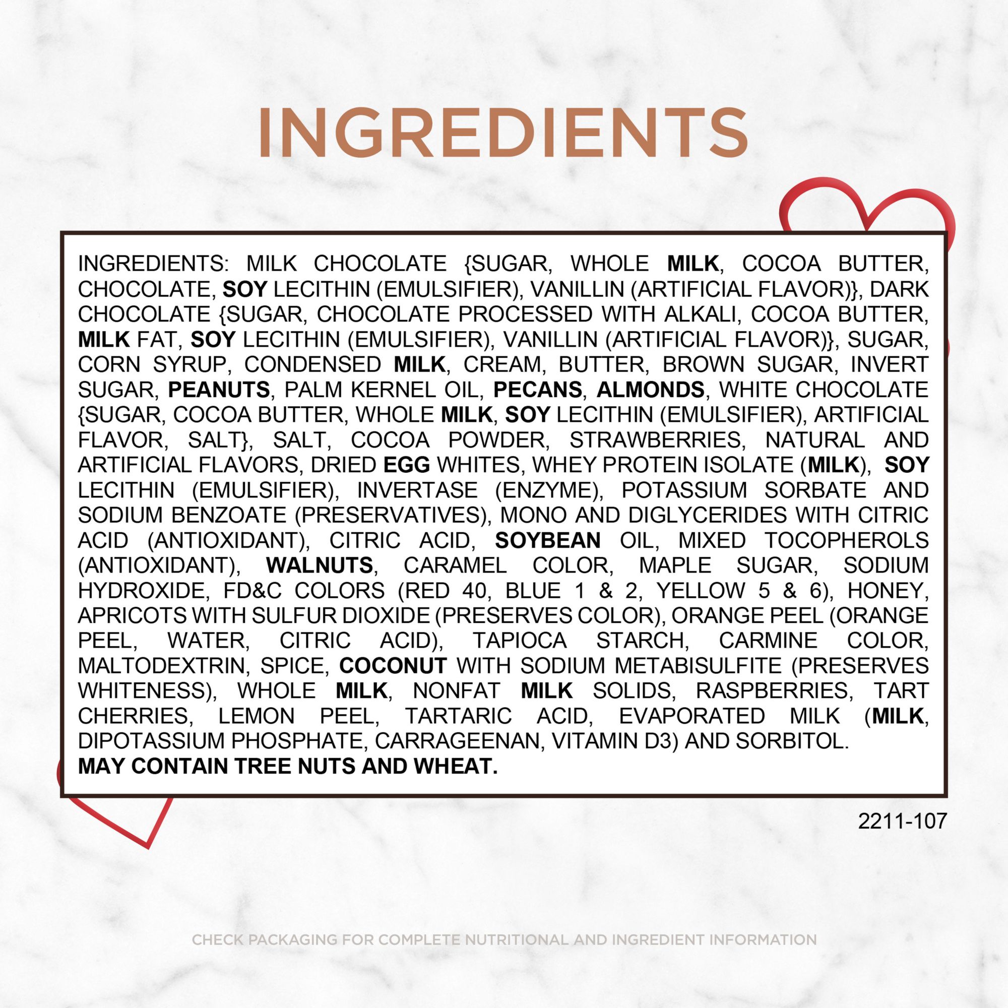 Ingredients: Milk Chocolate {Sugar, Whole Milk, Cocoa Butter, Chocolate, Soy Lecithin (Emulsifier), Vanillin (Artificial Flavor)}, Dark Chocolate {Sugar, Chocolate Processed With Alkali, Cocoa Butter, Milk Fat, Soy Lecithin (Emulsifier), Vanillin (Artificial Flavor)}, Sugar, Corn Syrup, Condensed Milk, Cream, Brown Sugar, Butter, Invert Sugar, Peanuts, Palm Kernel Oil, Pecans, Almonds, White Chocolate {Sugar, Cocoa Butter, Whole Milk, Soy Lecithin (Emulsifier), Artificial Flavor, Salt}, Salt, Cocoa Powder, Strawberries, Natural And Artificial Flavors, Dried Egg Whites, Soy Lecithin (Emulsifier), Invertase (Enzyme), Potassium Sorbate And Sodium Benzoate (Preservatives), Mono And Diglycerides With Citric Acid (Antioxidant), Citric Acid, Soybean Oil, Mixed Tocopherols (Antioxidant), Fd&c Colors (Red 40, Yellow 5 & 6, Blue 1 & 2), Honey, Walnuts, Tapioca Starch, Maple Sugar, Caramel Color, Sodium Hydroxide, Spice, Sorbitol, Apricots With Sulfur Dioxide (Preserves Color), Orange Peel (Orange Peel, Water, Citric Acid), Carmine Color, Maltodextrin, Raspberries, Coconut With Sodium Metabisulfite (Preserves Whiteness), Whole Milk, Nonfat Milk Solids, Cherries {Cherries, Corn Syrup, High Fructose Corn Syrup, Water, Sugar, Citric Acid, Sodium Benzoate And Potassium Sorbate (Preservatives), Natural Flavor, Fd&c Red 40, Sulfur Dioxide (Preserves Color)}, Raisins (Raisins, Sunflower Oil), Lemon Peel And Evaporated Milk (Milk, Dipotassium Phosphate, Carrageenan, Vitamin D3).