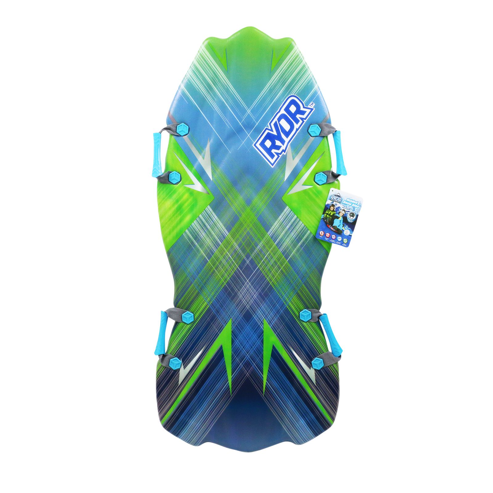 Color is exclusive Molded snow sled Contoured deck for one or two persons Super lightweight Fast parabolic tracking system Two sets of contoured handle grips Bright bold green and blue colors Cool pattern designs Great family outdoor winter fun Includes green and blue molded snow sled