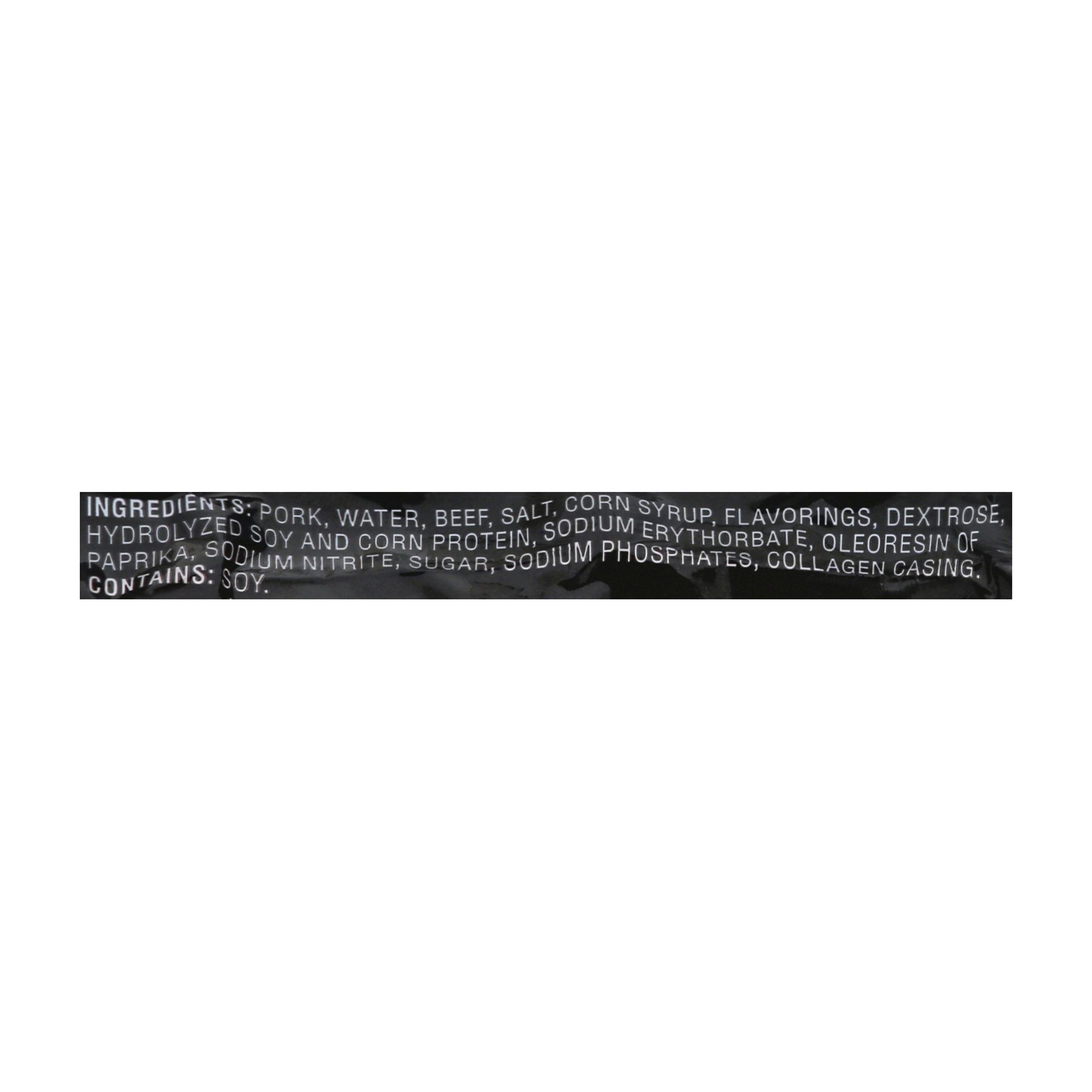 Ingredients: Pork, Water, Beef, Salt, Corn Syrup, Flavorings, Dextrose, Hydrolyzed Soy and Corn Protein, Sodium Erythorbate, Oleoresin of Paprika, Sodium Nitrite, Sugar, Sodium Phosphate, Collagen casing.