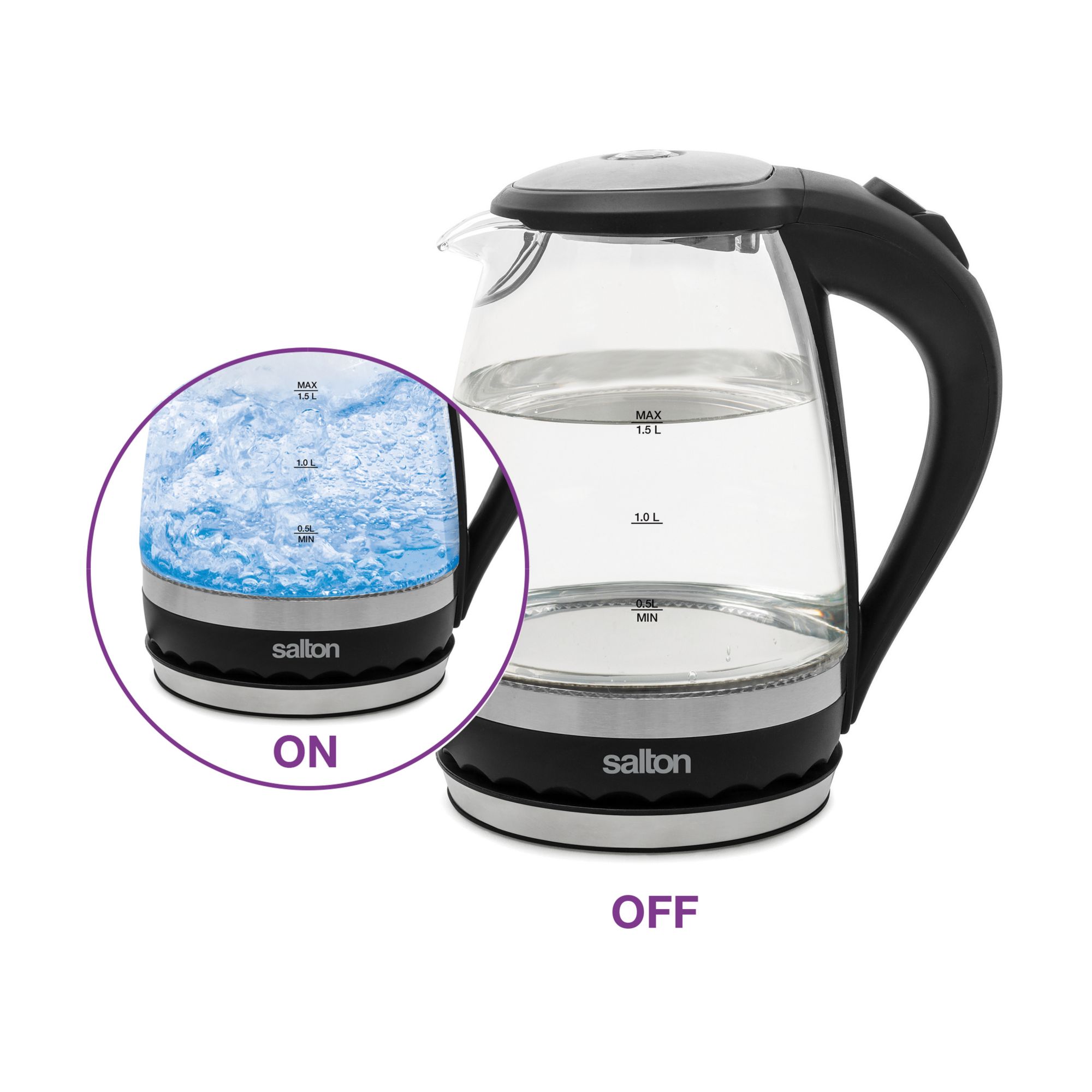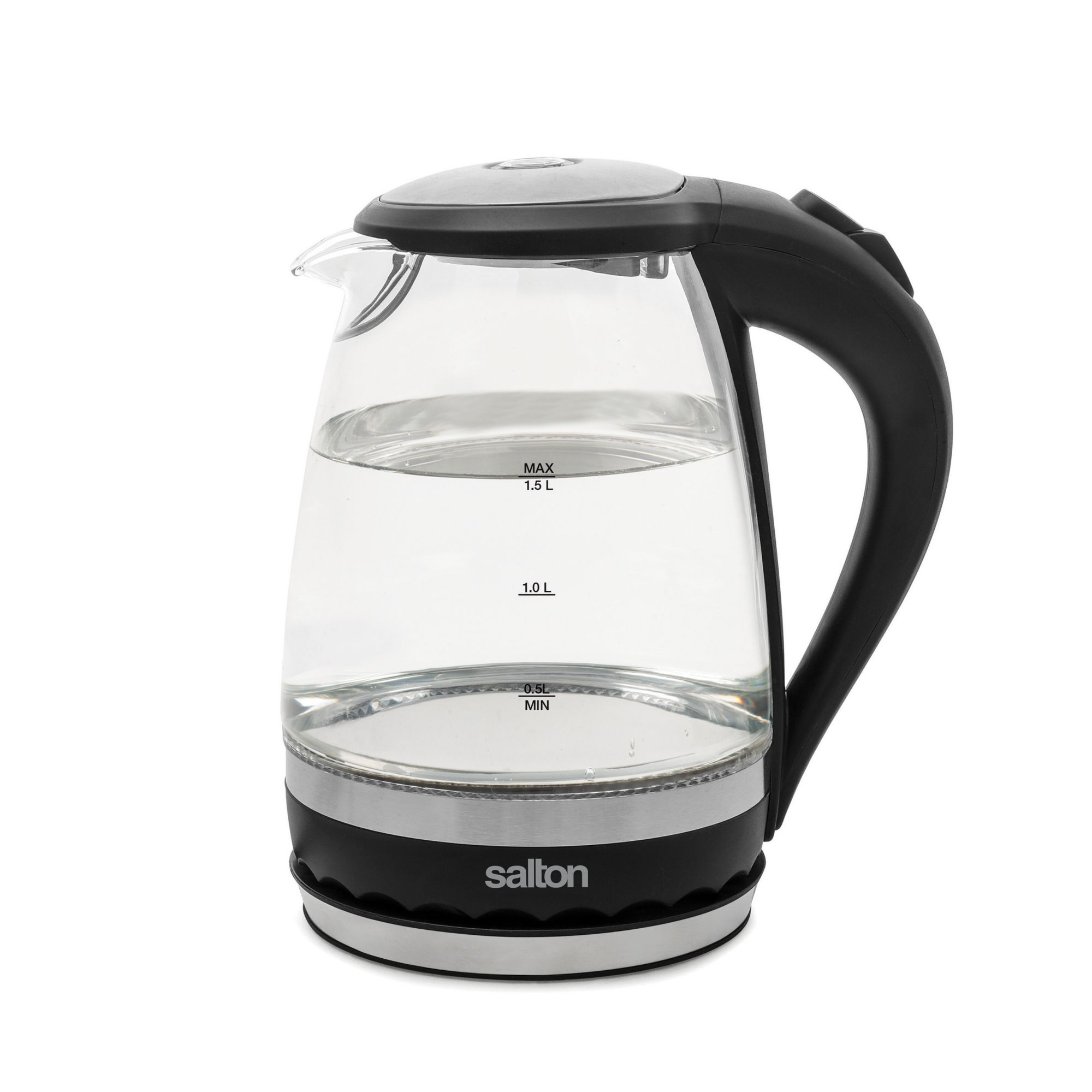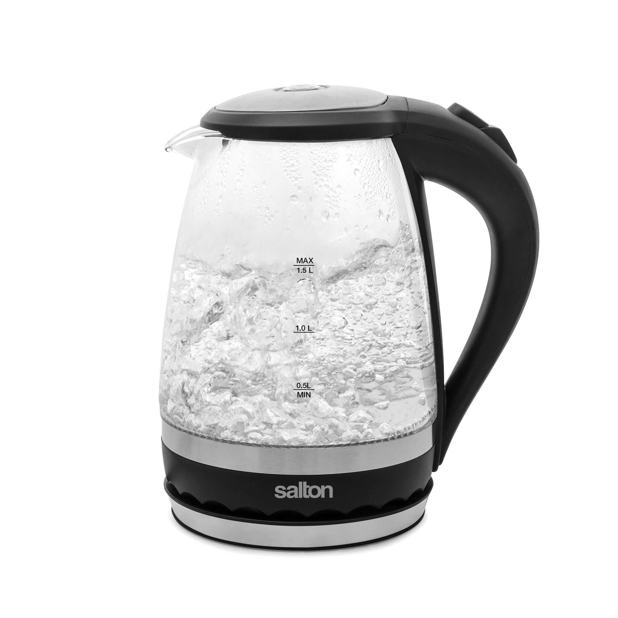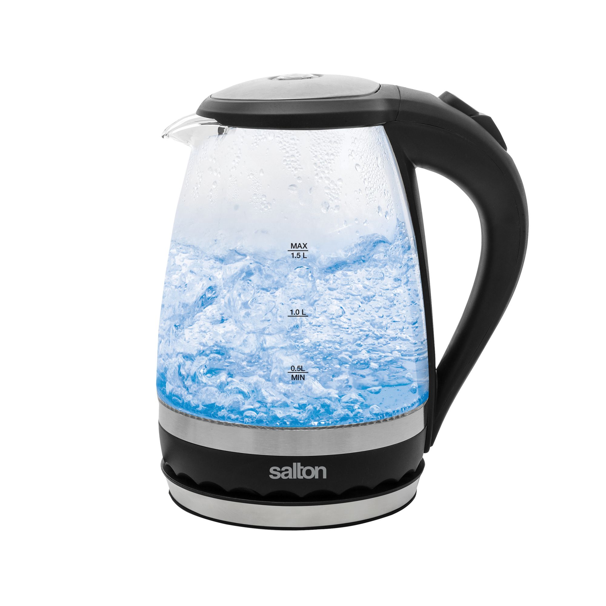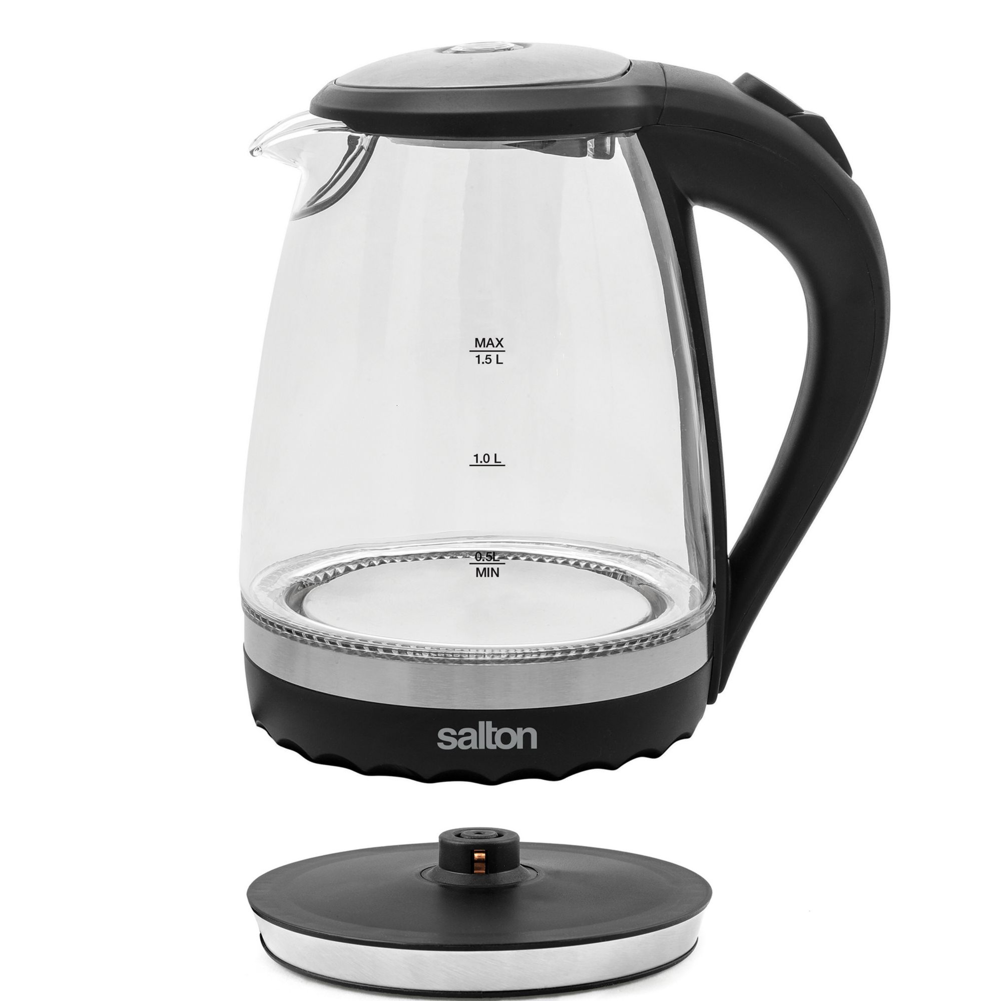 Add a little light to your water with a vibrant blue illumination. The Salton Cordless Electric Glass Kettle is the perfect small-space solution at a compact 1.5 Liter capacity. Elegantly crafted of thermal shock resistant glass and brushed stainless steel makes this kettle the safest and most economical way to boil water. The hinged lid and concealed heating element permit fast and easy cleaning while the convenient water level markings on both sides of the kettle and 360° base allow for easy right or left hand use. The handy cord wrap will eliminate clutter from your counter and the sleek design will illuminate the look of your kitchen.