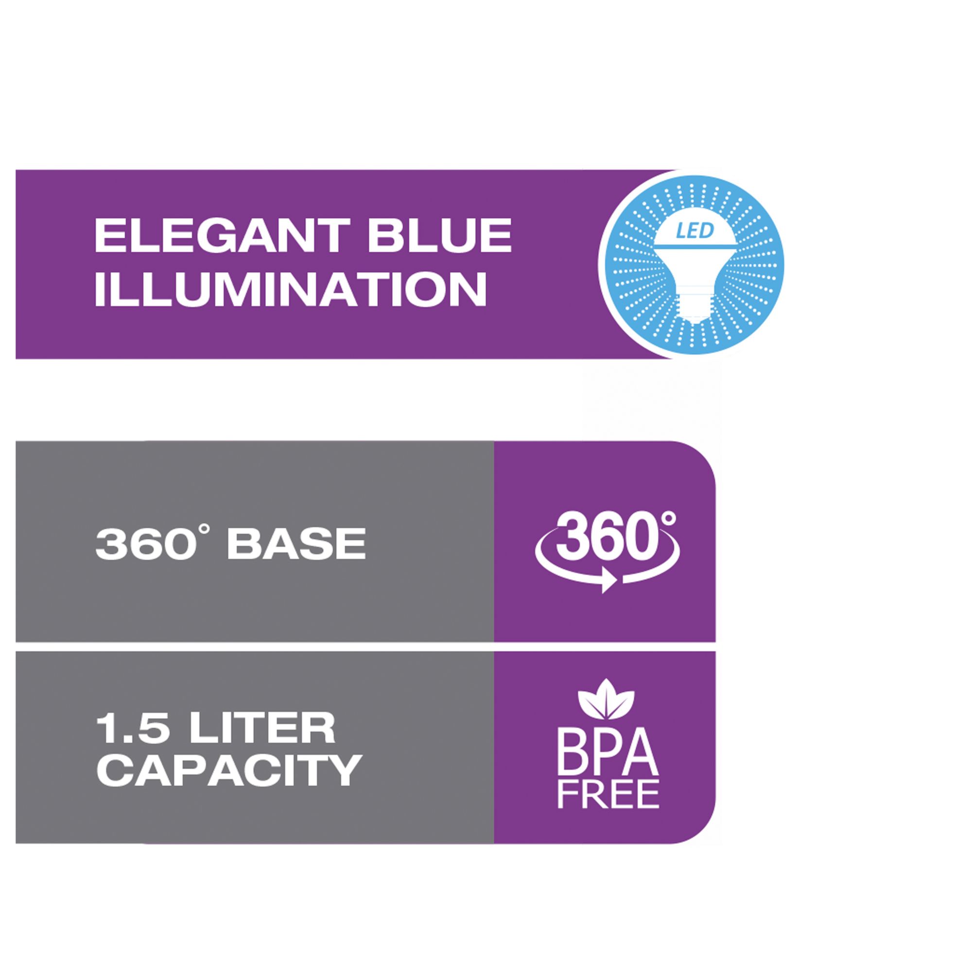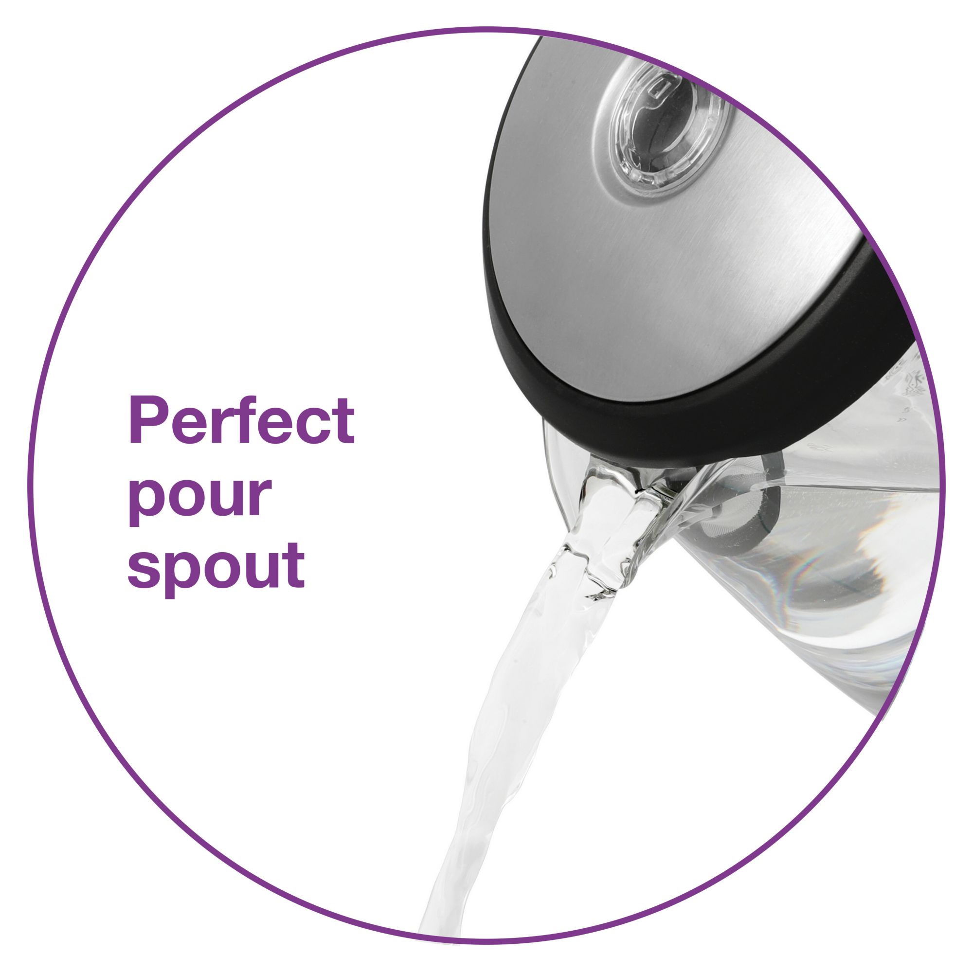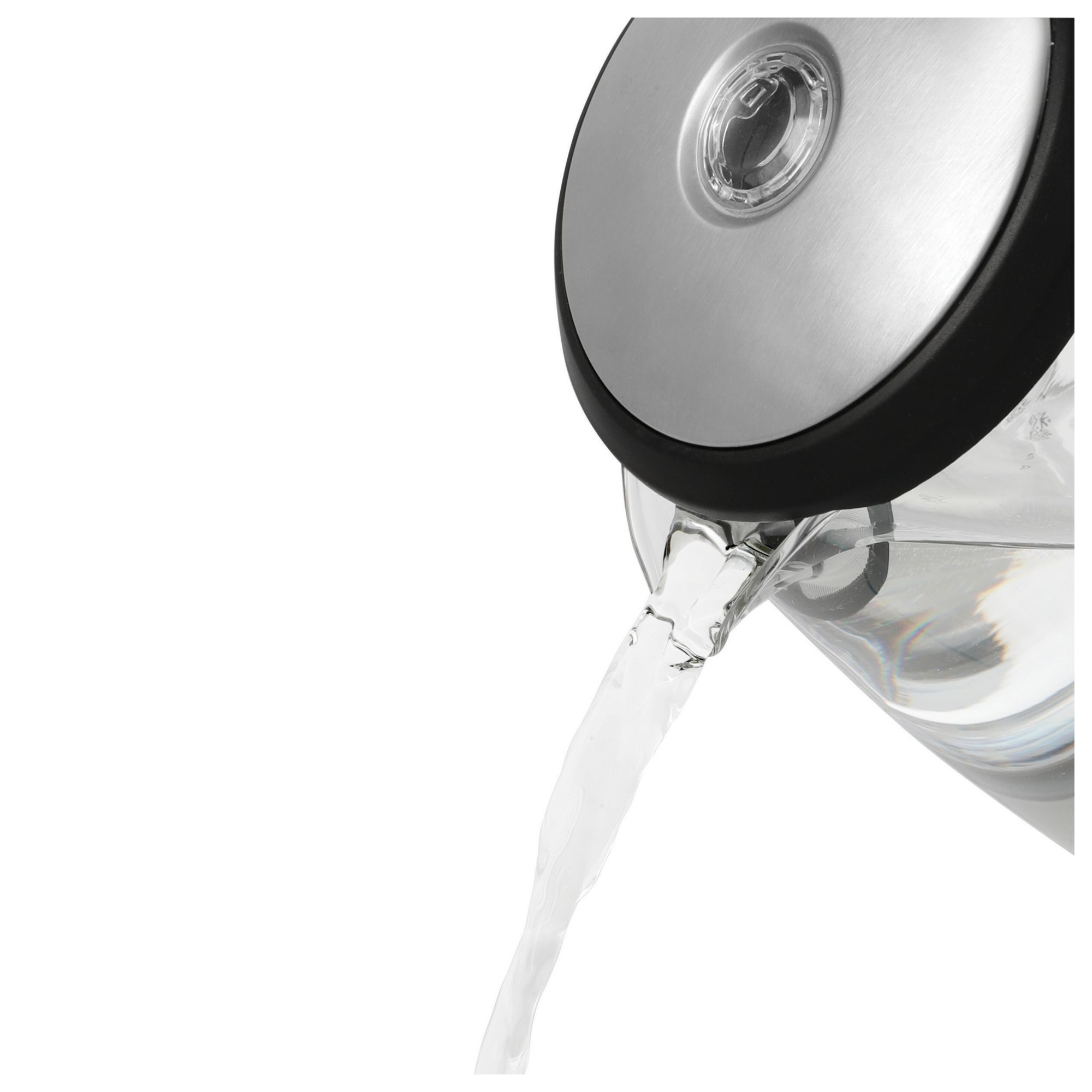 Compact 1.6 quart capacity Elegant blue LED illumination Aquascreen® Filter and hinged lid Perfect pour spout Elegantly crafted of thermal shock resistant glass and brushed stainless steel Concealed element for fast and easy cleaning Kettle can be placed in any direction on 360º base Handy cord wrap eliminates counter clutter Water level markings on both sides of the kettle Includes one electric glass kettle
