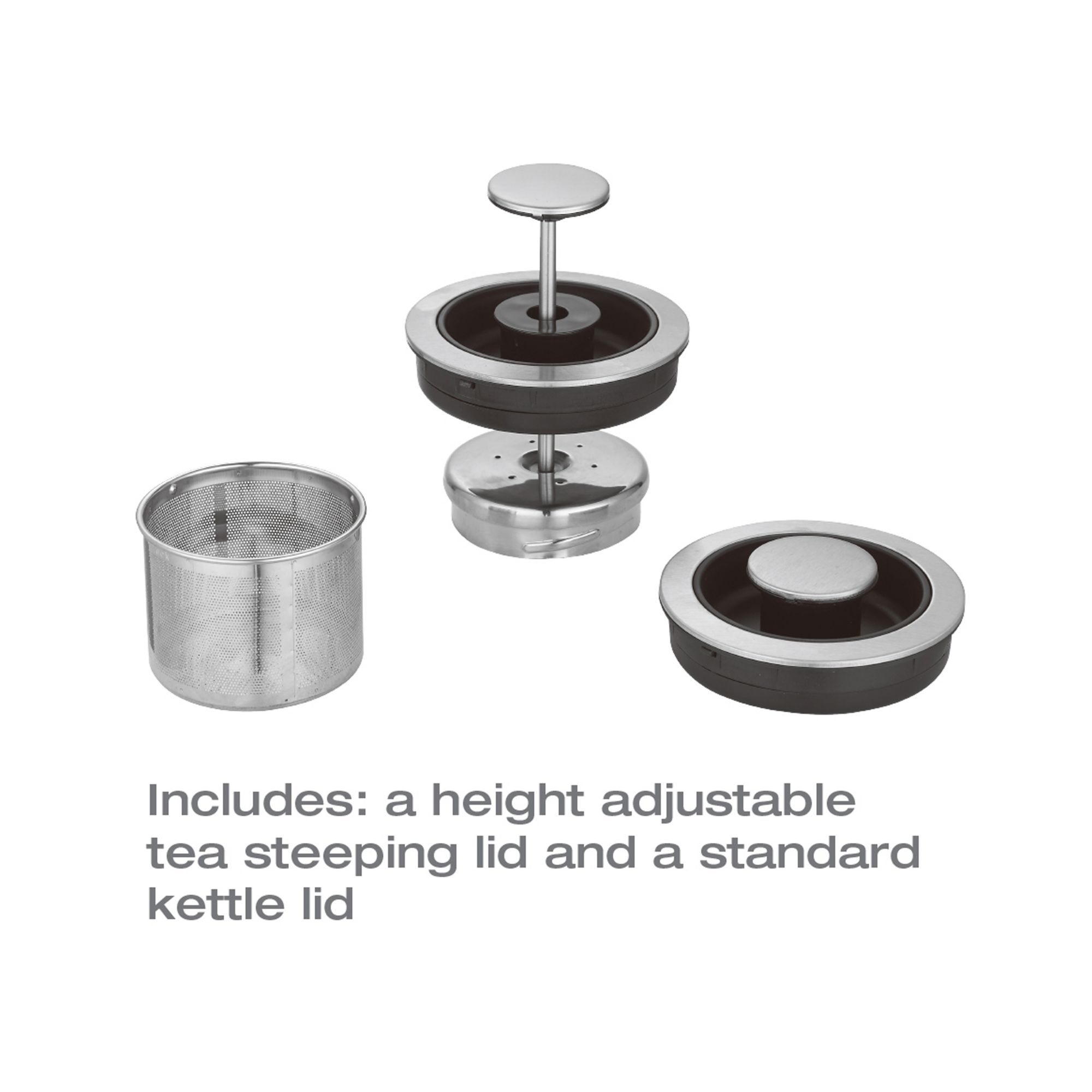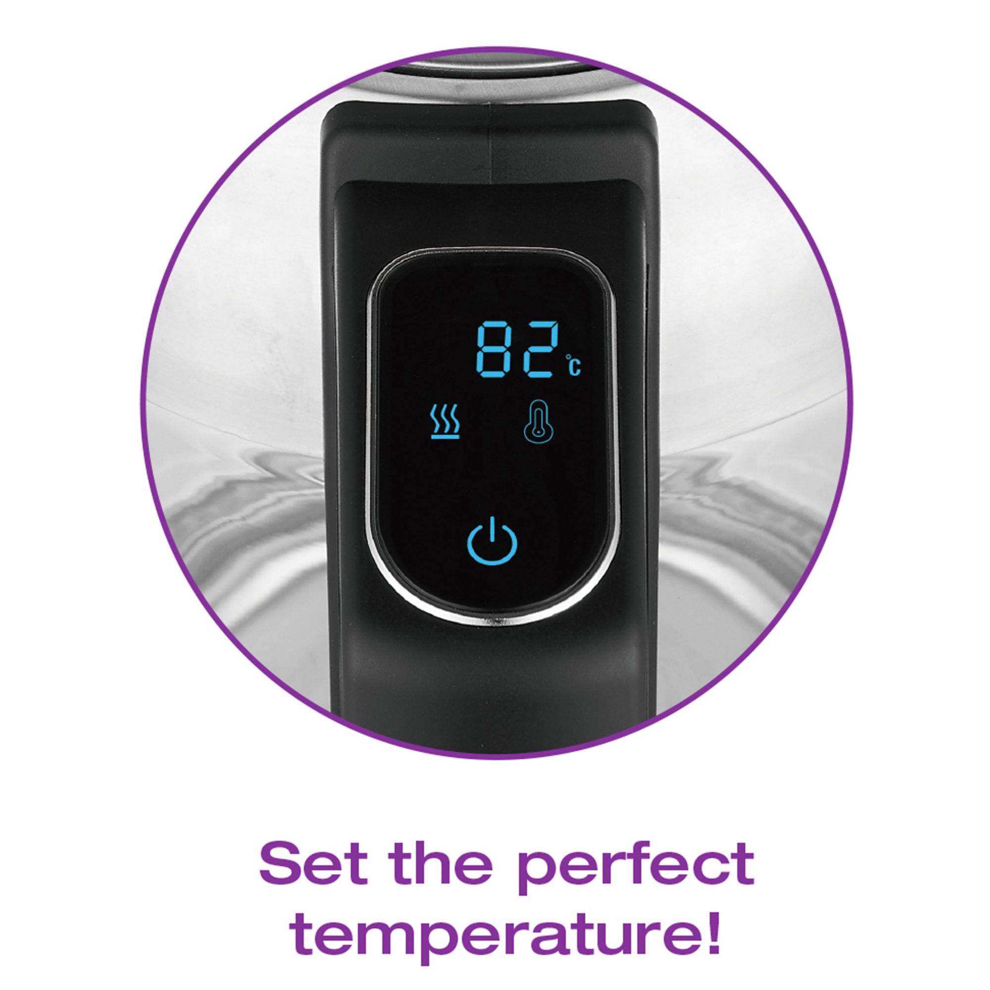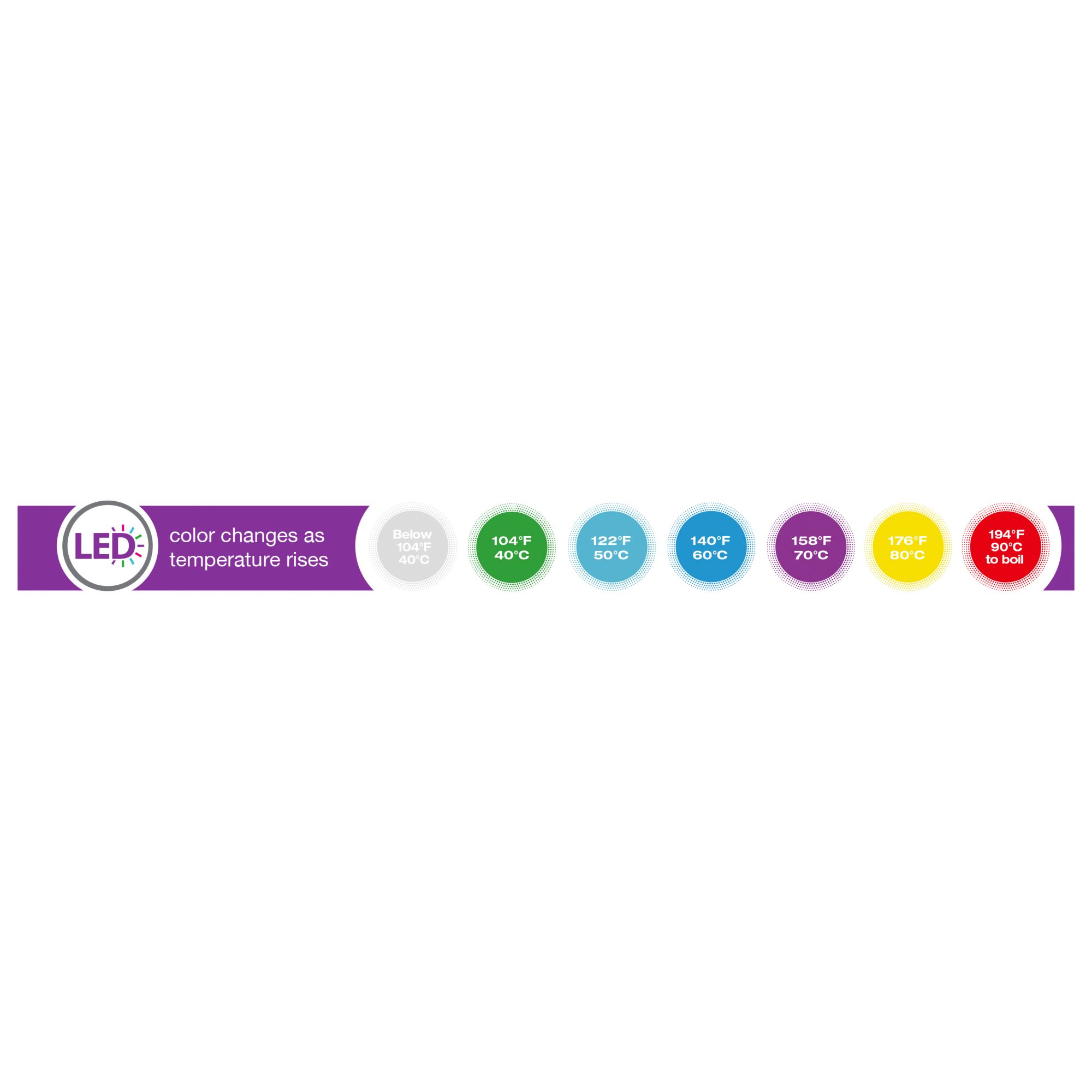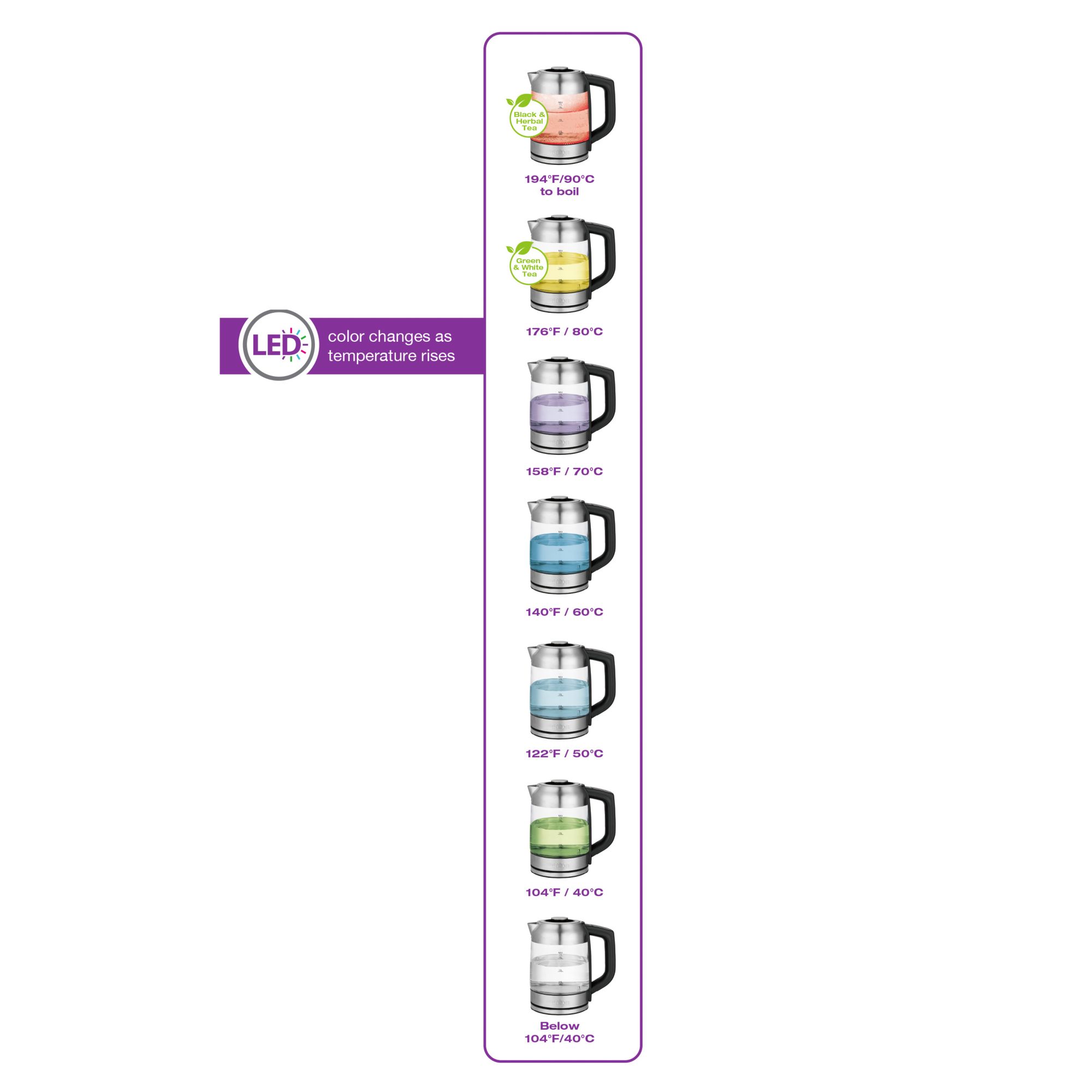 LED color changes as temperature rises 360° swivel base with cord storage BONUS TEA STEEPER! Stainless steel tea infuser for loose or bagged tea Height adjustable tea steeping lid and basket Seven preset temperature settings: 104°F (40°C), 122°F (50°C), 140°F (60°C), 158°F (70°C), 176°F (80°C), 194°F (90°C), 212°F (100°C) Keep warm function: Maintains water at set temperature for 2 hours Display can show Farenheit (°F) or Celsius (°C) degrees Fingerprint resistant stainless steel finish 3 level automatic safety system ensures safe operation 1. Automatically switches off when set termperature is reached 2. Kettle shuts off if plugged in dry 3. Kettle shuts off when lifted off the power base Includes tea steeper & kettle