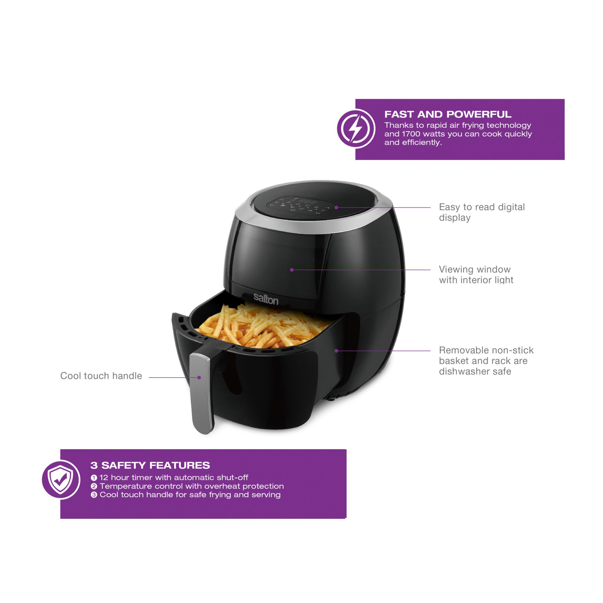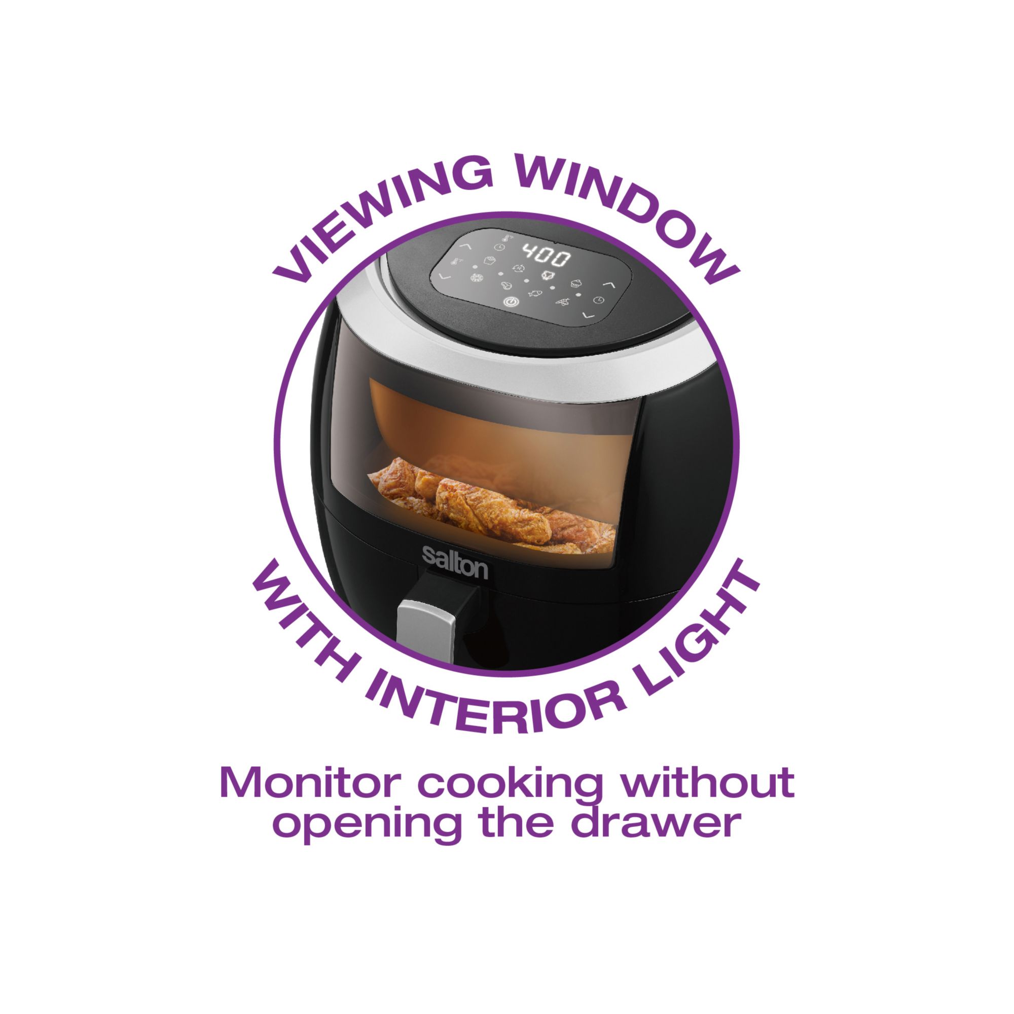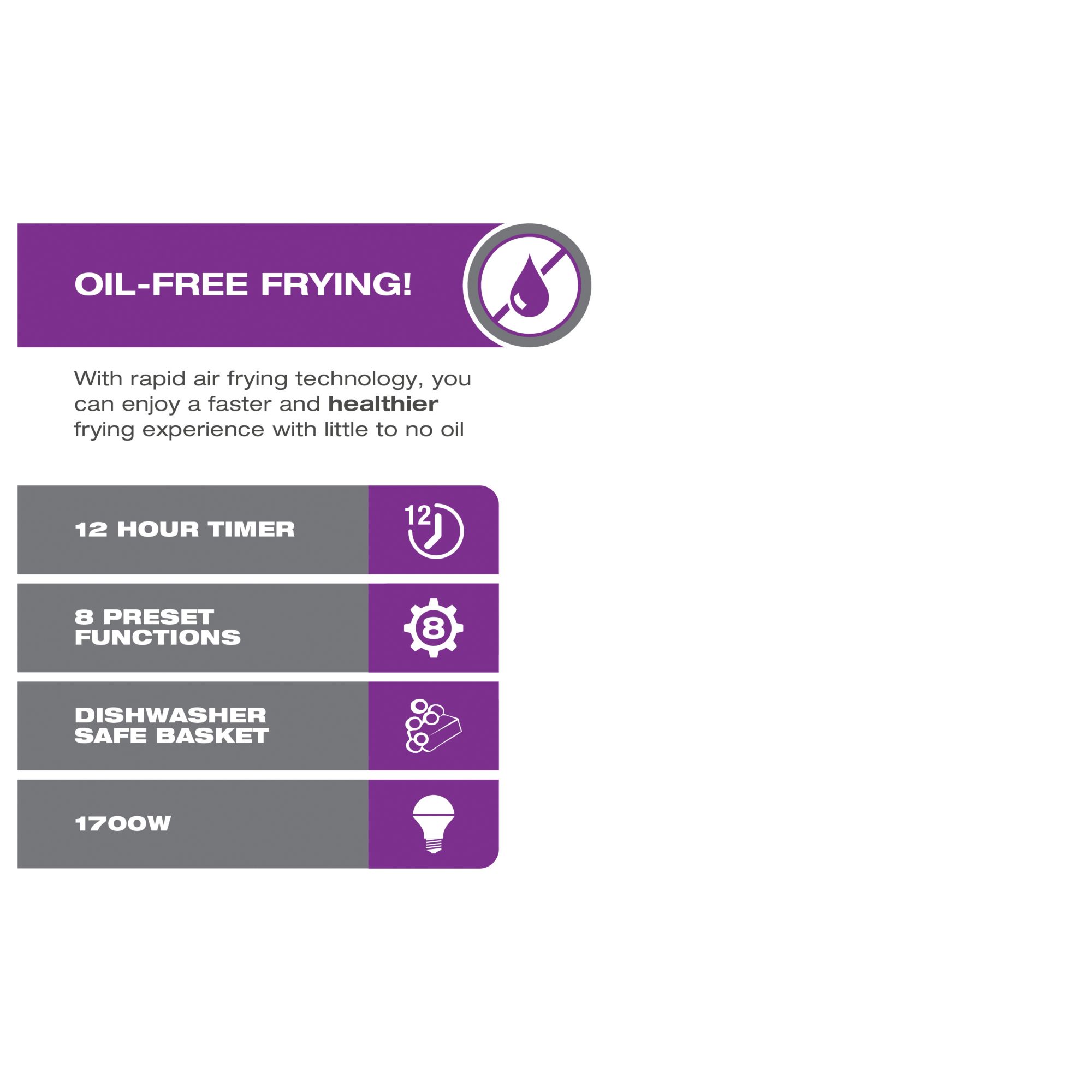 Viewing Window with Interior Light - Monitor cooking without opening the drawer Oil-Free Frying! - With rapid air frying technology, you can enjoy a faster and healthier frying experience with little to no oil 24 Hour Timer - Adjustable timer up to 24 hours Dishwasher Safe Drawer Pan - Non-stick drawer with removable non-stick rack are both dishwasher safe 1700W Adjustable temperature (120 - 400F) 8 Preset Functions - Fries Reheat Chicken Bake Dehydrate Steak Fish Vegetables Easy to read digital display Includes one air fryer