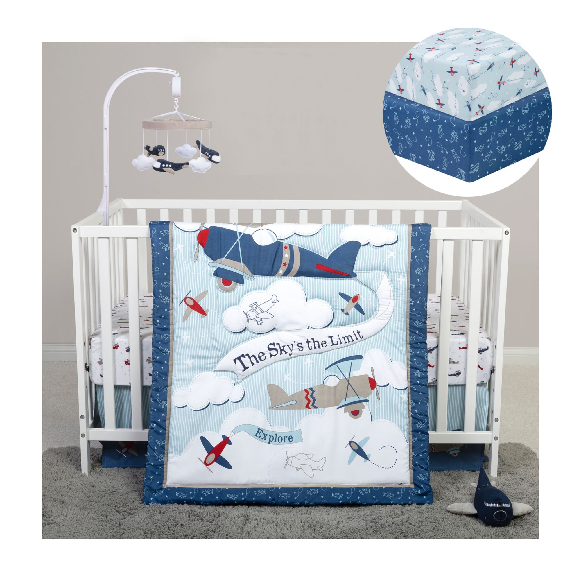 Three coordinating fitted crib sheets fit a standard crib mattress 28"L x 52"W with 8"L deep pockets and are fully elasticized for a secure fit. Sheets feature a blue, red, and gray plane scatter print, a sky-writing print trailing vintage airplanes with "Adventure", "Dream", and "Explore" on a sky-blue background, and a hand-drawn vintage airplane on navy print.