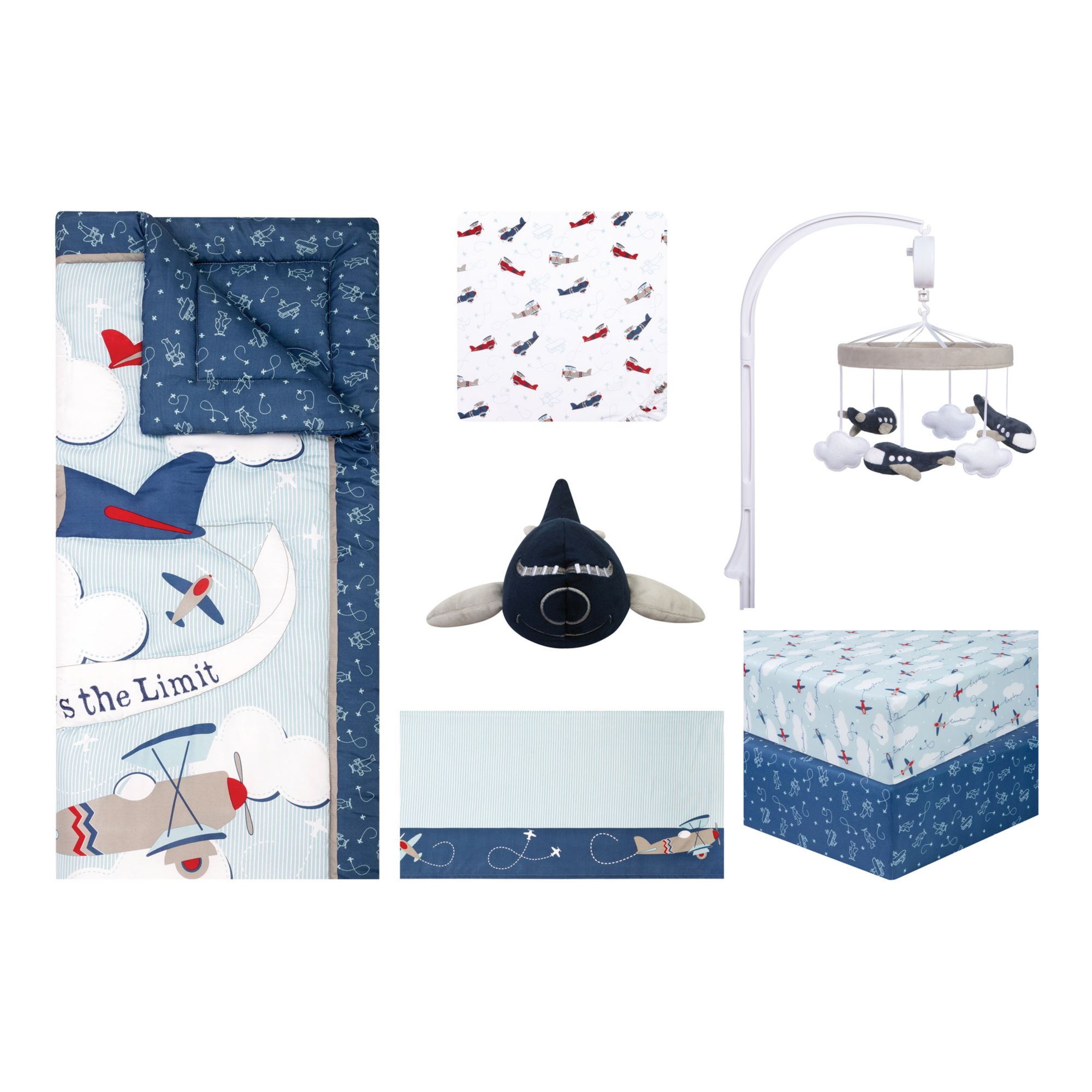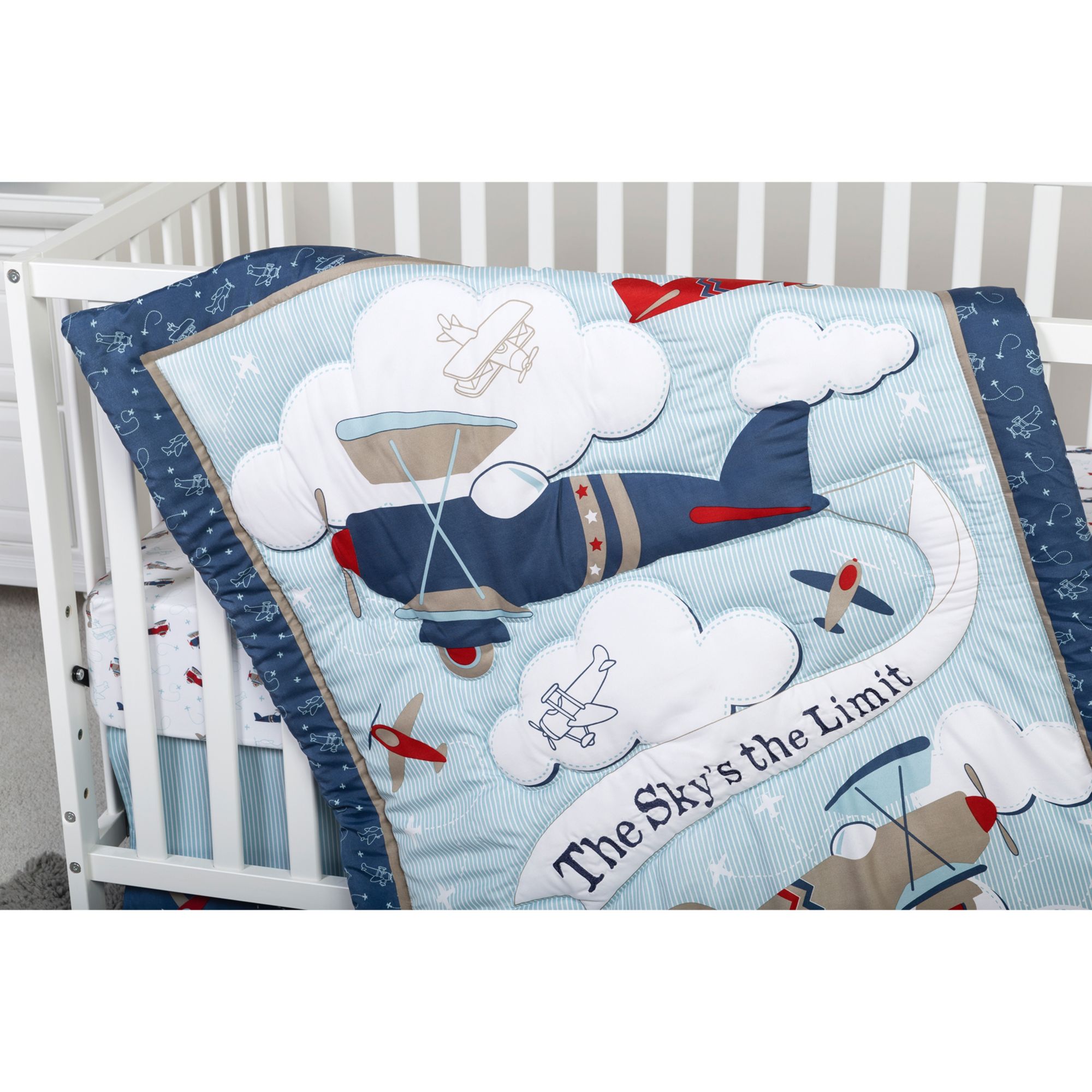 The sky’s the limit for your little one with the Adventure Awaits 7 Pc.Crib Bedding Set by Sammy and Lou. Vintage airplanes soar through the fluffy white clouds. The navy blue, light blue, red, and the gray color palette is perfect for your little explorer.