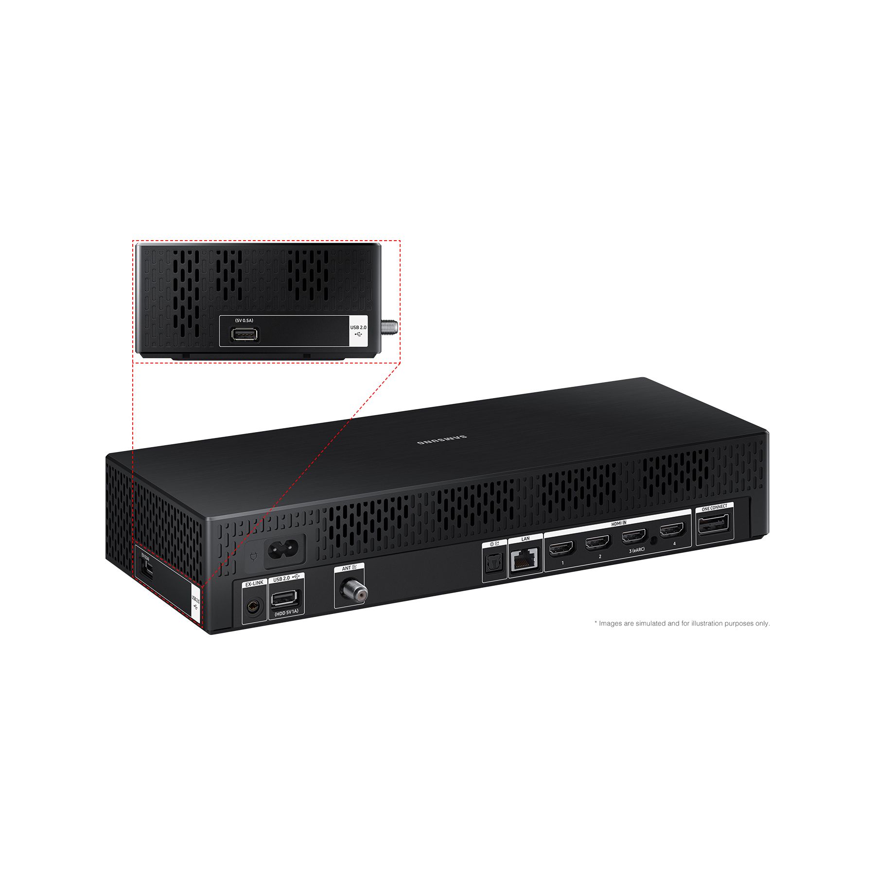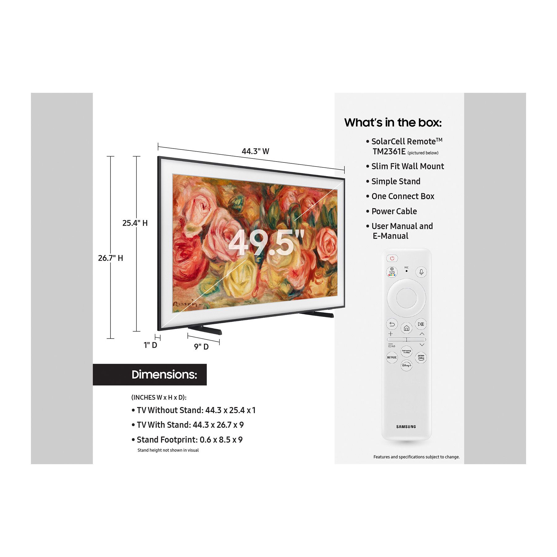 Includes SolarCell remote TM2361E, slim fit wall mount, simple stand, one connect box, power cable, user manual and e-Manual