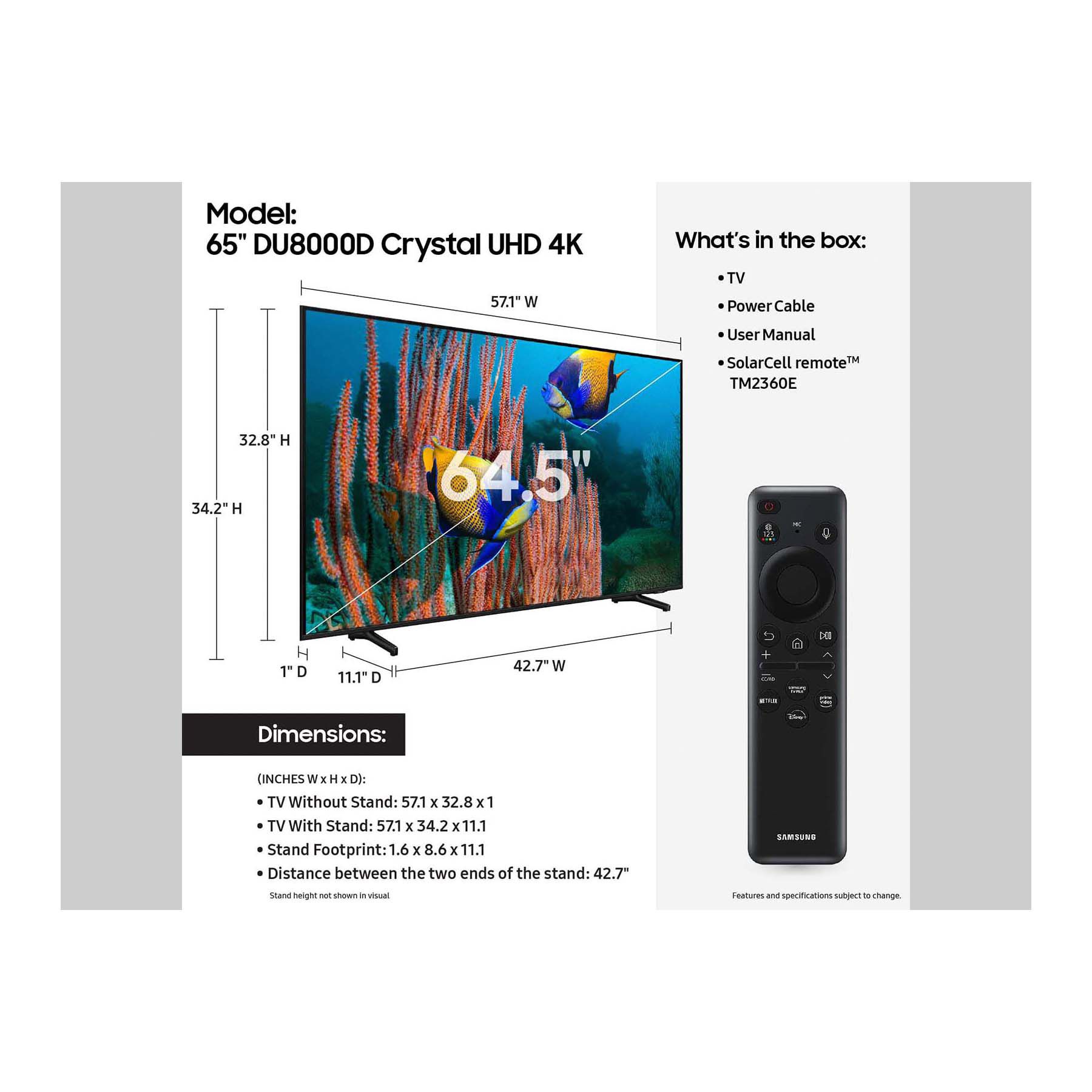 Includes TV, power cord, user manual, SolarCell remote, TM2360E