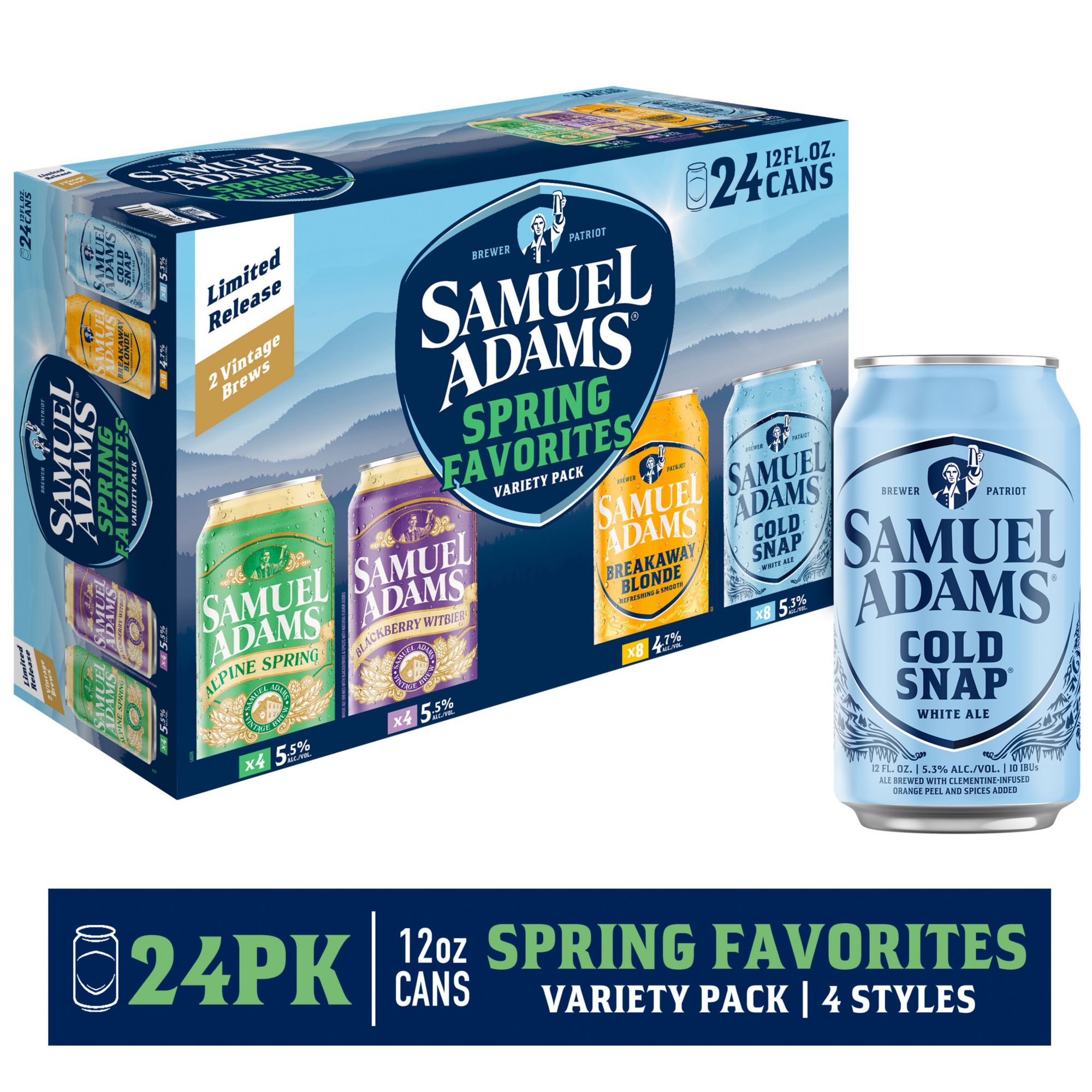 Variety 24 pack, eight 12 fluid ounce cans each of Cold Snap and Breakaway Blonde and four cans each of Alpine Spring and Blackberry Witbier