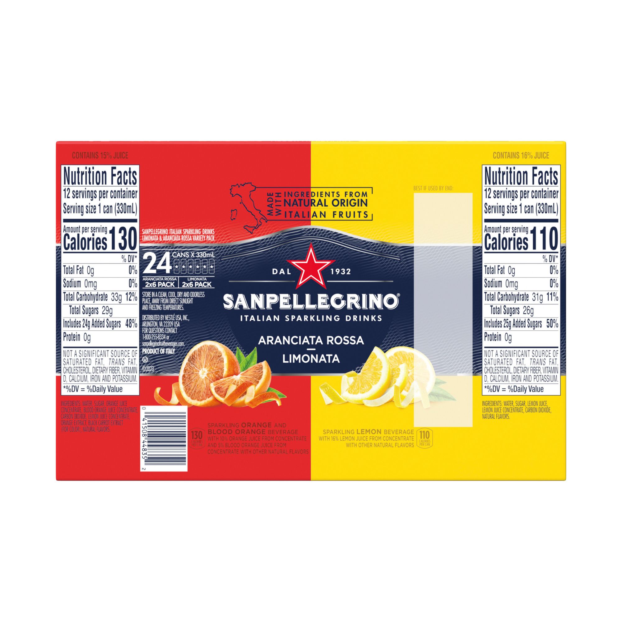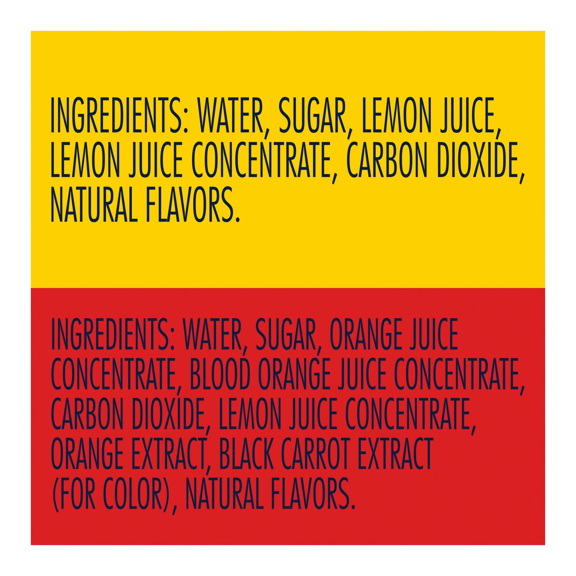 Ingredients: San Pellegrino Blood Orange: Water, Sugar, Orange Juice Concentrate, Carbon Dioxide, Lemon Juice Concentrate, Orange Extract, Natural Flavors ; San Pellegrino Lemonade: Water, Sugar, Lemon Juice, Lemon Juice from Concentrate, Carbon Dioxide, Natural Flavors.