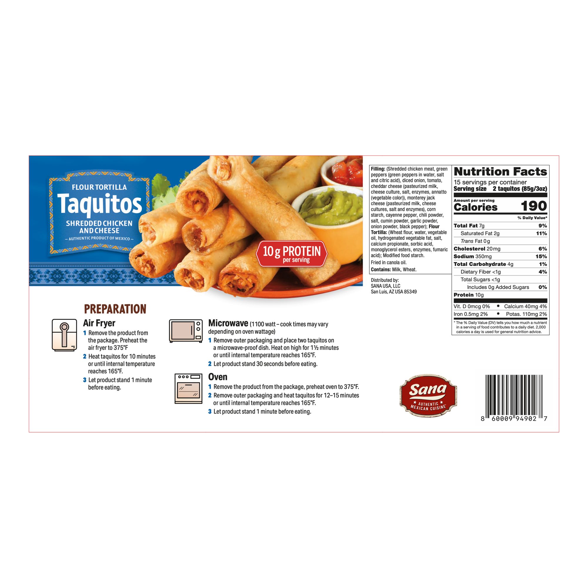Sana's authentic Mexican taquitos are made with real shredded seasoned white meat chicken, with natural cheddar and Monterey Jack cheeses, and vegetables. The filling is hand rolled in a flour tortilla then lightly fried to perfection in canola oil for just the right flavor and crunch. Sana's chicken and cheese taquito makes a flavorful, fun, on-trend addition to your entree menu or as an on the go snack. These taquitos are filled with fragrantly spiced shredded chicken wrapped in a crispy flour tortilla and have 10 grams of protein/serving.