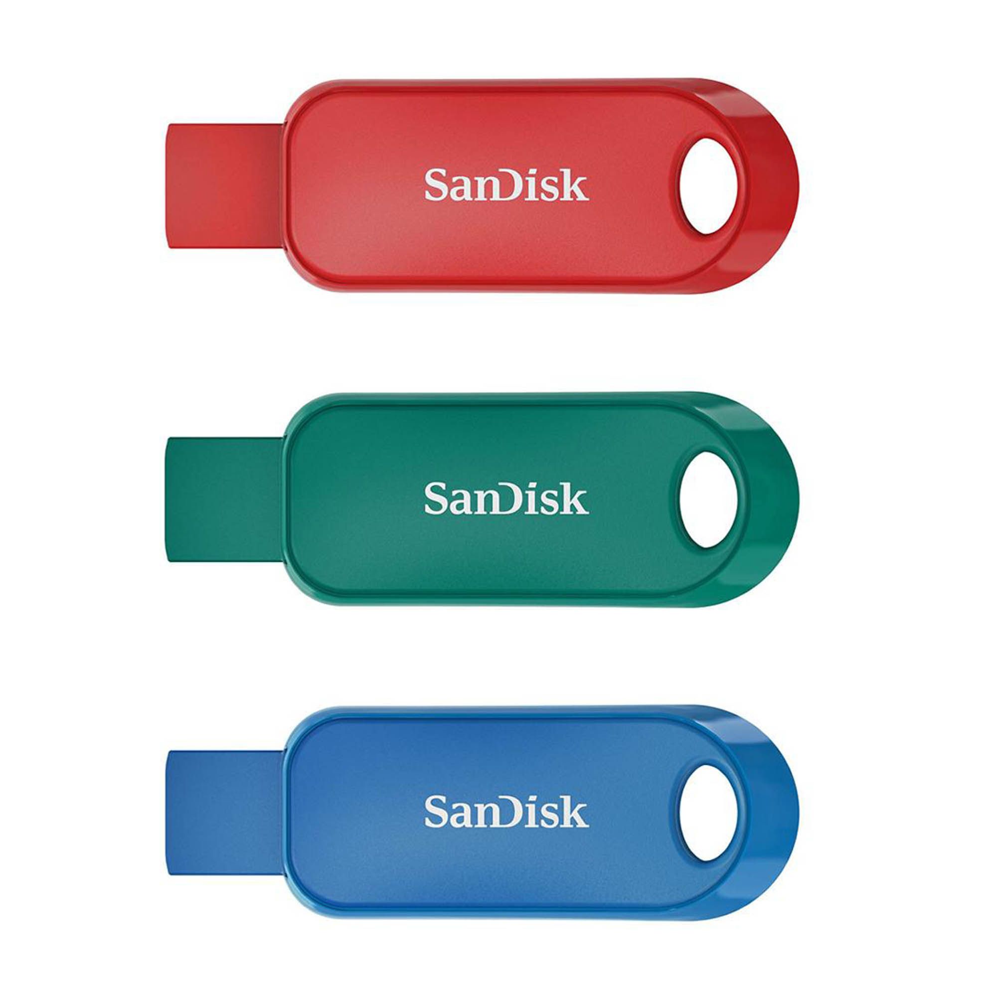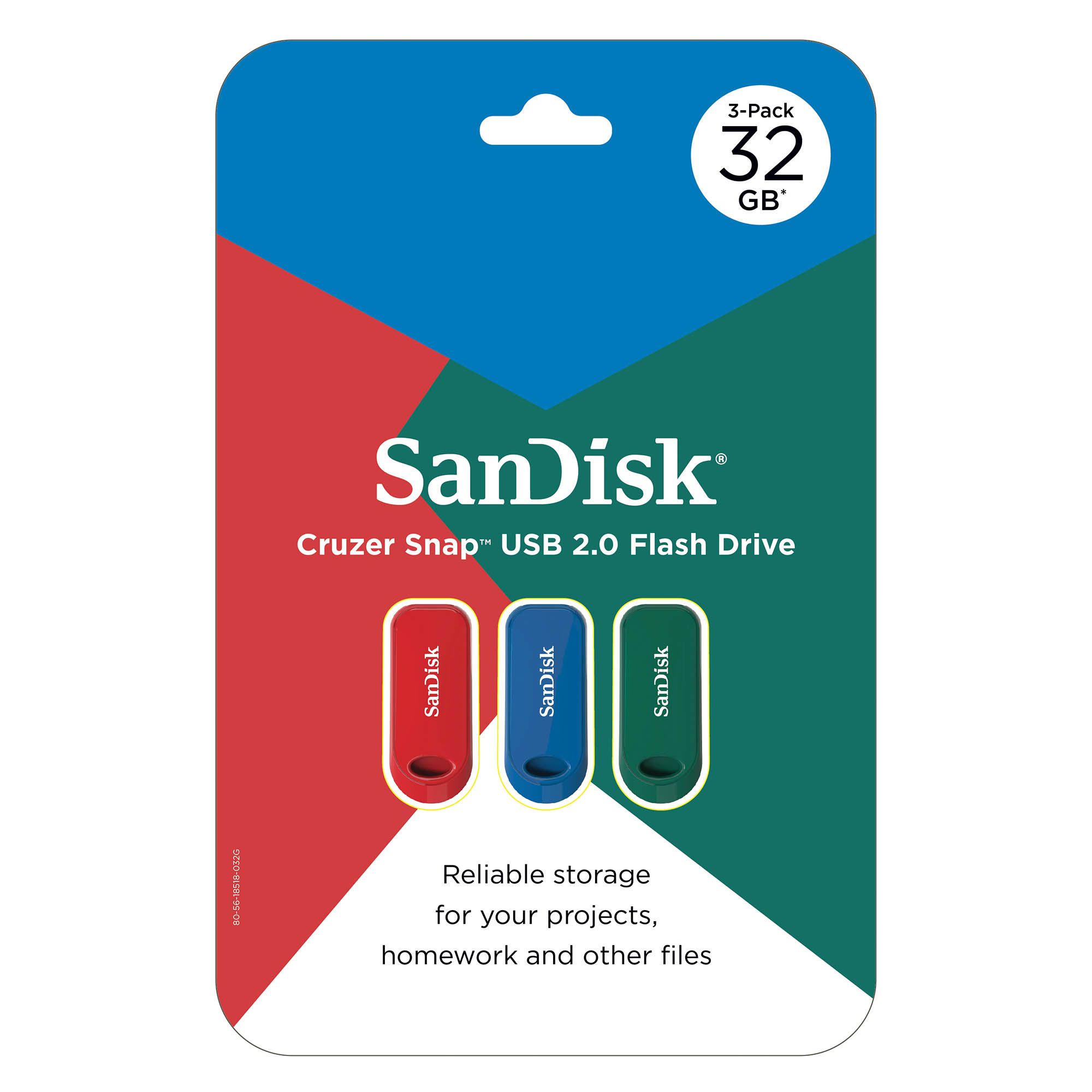 These SanDisk 32GB Cruzer Snap Flash Drives are a simple and portable storage device with enough space to carry your photos, songs, and other files. Their retractable design helps keep the USB connector safe from dirt and damage, while the included password-protection software helps keep your private files secure. These flash drives come in an assorted color three-pack for all of your file storage needs.