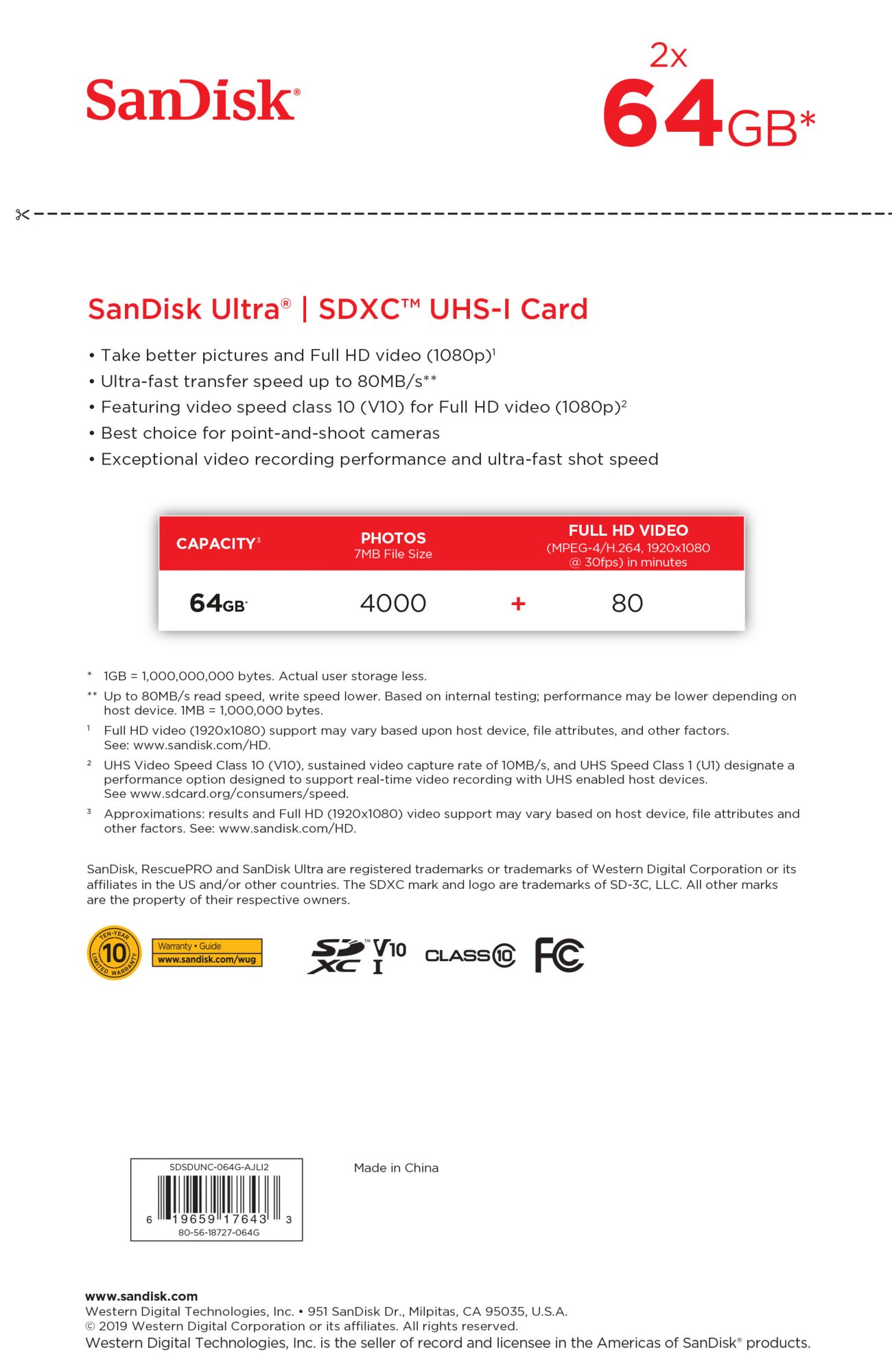 Max. read speed: 80 MB/s Min. write speed: 10 MB/s Class 10 / UHS-I Great for compact-to-midrange point-and-shoot digital cameras and camcorders Twice as fast as ordinary SDHC cards, allowing you to take pictures and transfer files quickly Exceptional video recording performance with Class 10 rating for Full HD video (1080p) Compatibility: SDHC-I/SDXC-I devices Waterproof, temperature-proof, X-ray proof, magnet-proof, shockproof 10-year limited warranty Includes (2) SanDisk 64GB SDXC Class 10 memory cards Warranty: 10 years