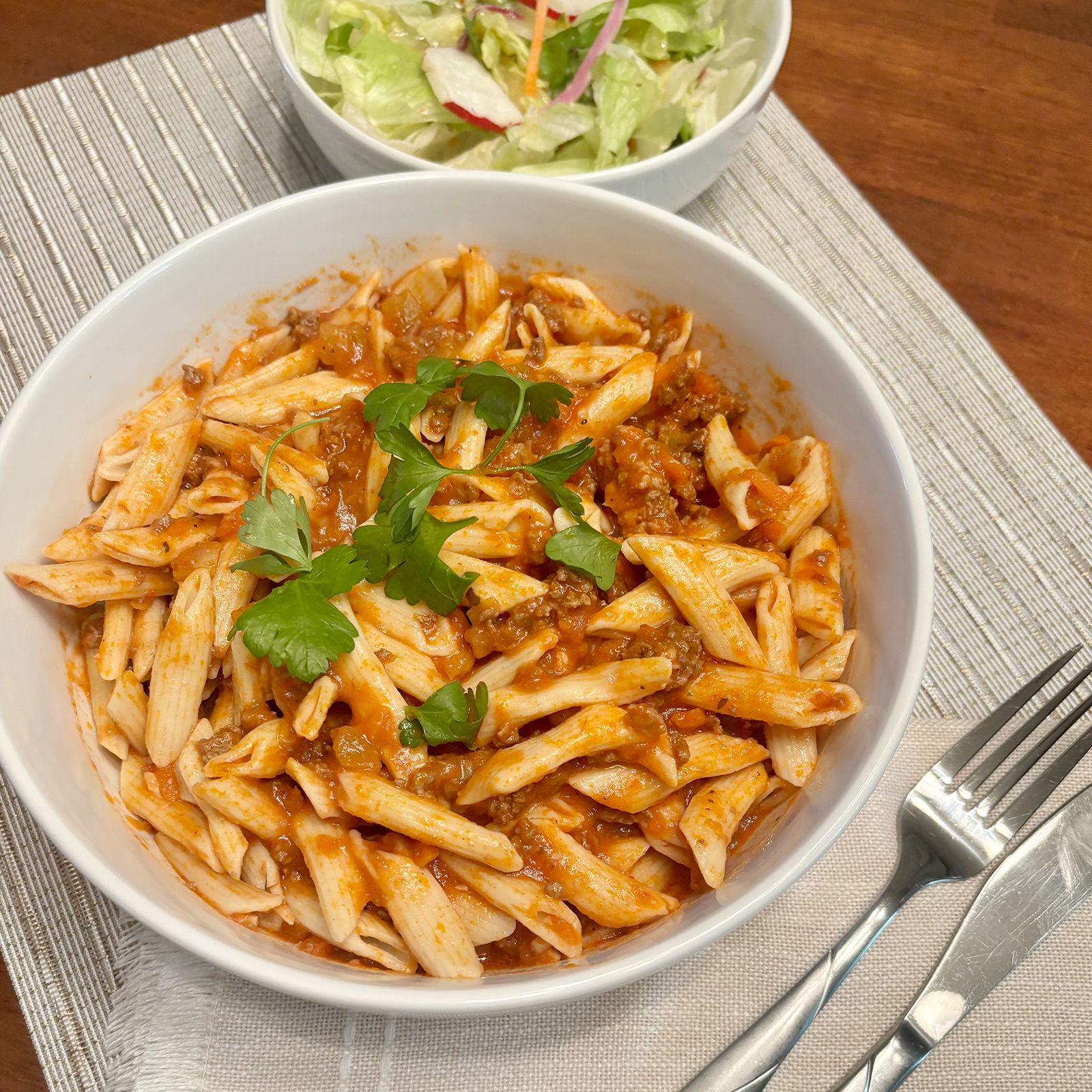 This ready-to-eat authentic Bolognese sauce delivers rich flavor by simmering slow-cooked ground beef and pork with vine-ripened tomatoes, a hint of Burgundy wine, and classic Italian spices. The Bolognese meat sauce is carefully added to al dente penne to create a full Italian meal ready to heat and eat. A classic pairing for rich bolognese and penne pasta includes garlic bread, a fresh green salad, or roasted vegetables. These sides complement the hearty meat sauce without overpowering it. Enjoy!