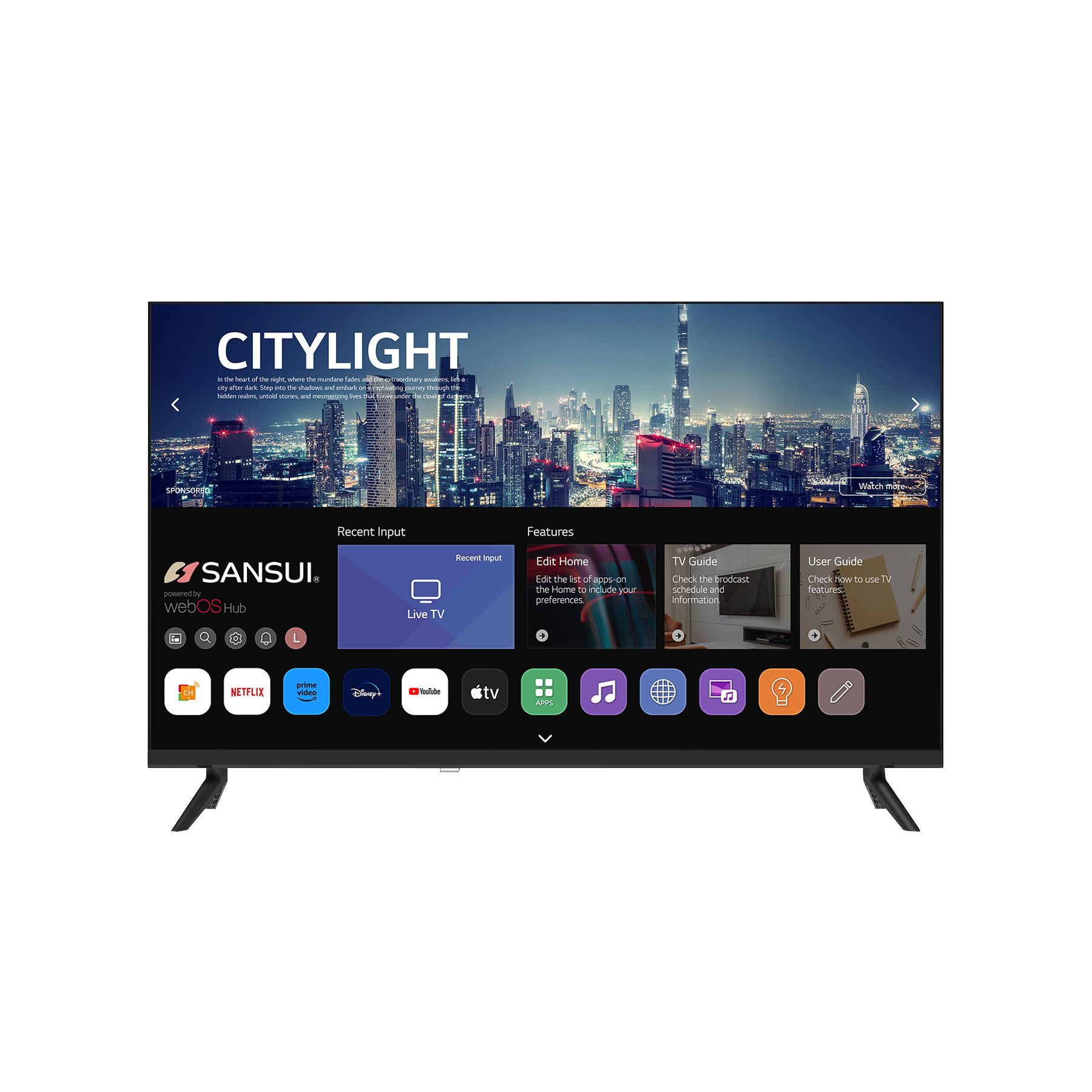Includes Sansui 50" 4K UHD LED TV (S50VAUW), Sansui remote control, 2 AAA batteries, 2 metal stands with screws, AC power cord, user manual
