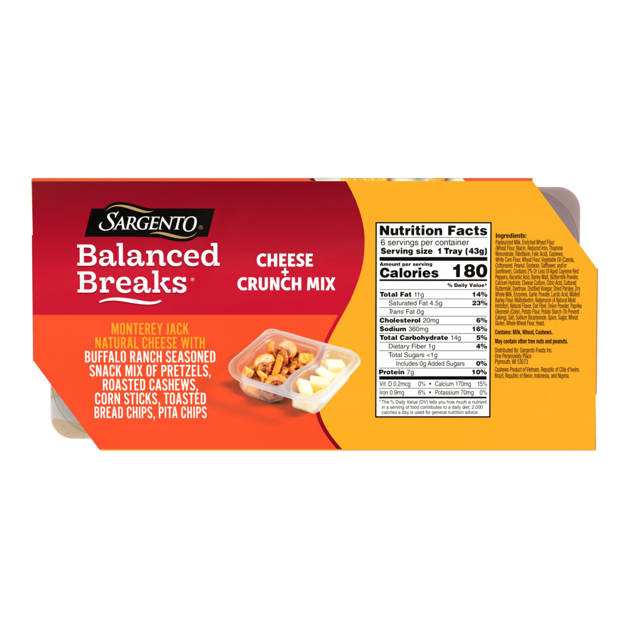 Sargento Balanced Breaks Cheese + Crunch Mix Monterey Jack Cheese and Buffalo Ranch Seasoned Snack Mix comes with 6 single-serve, individually wrapped snack for those who crave flavor on-the-go.