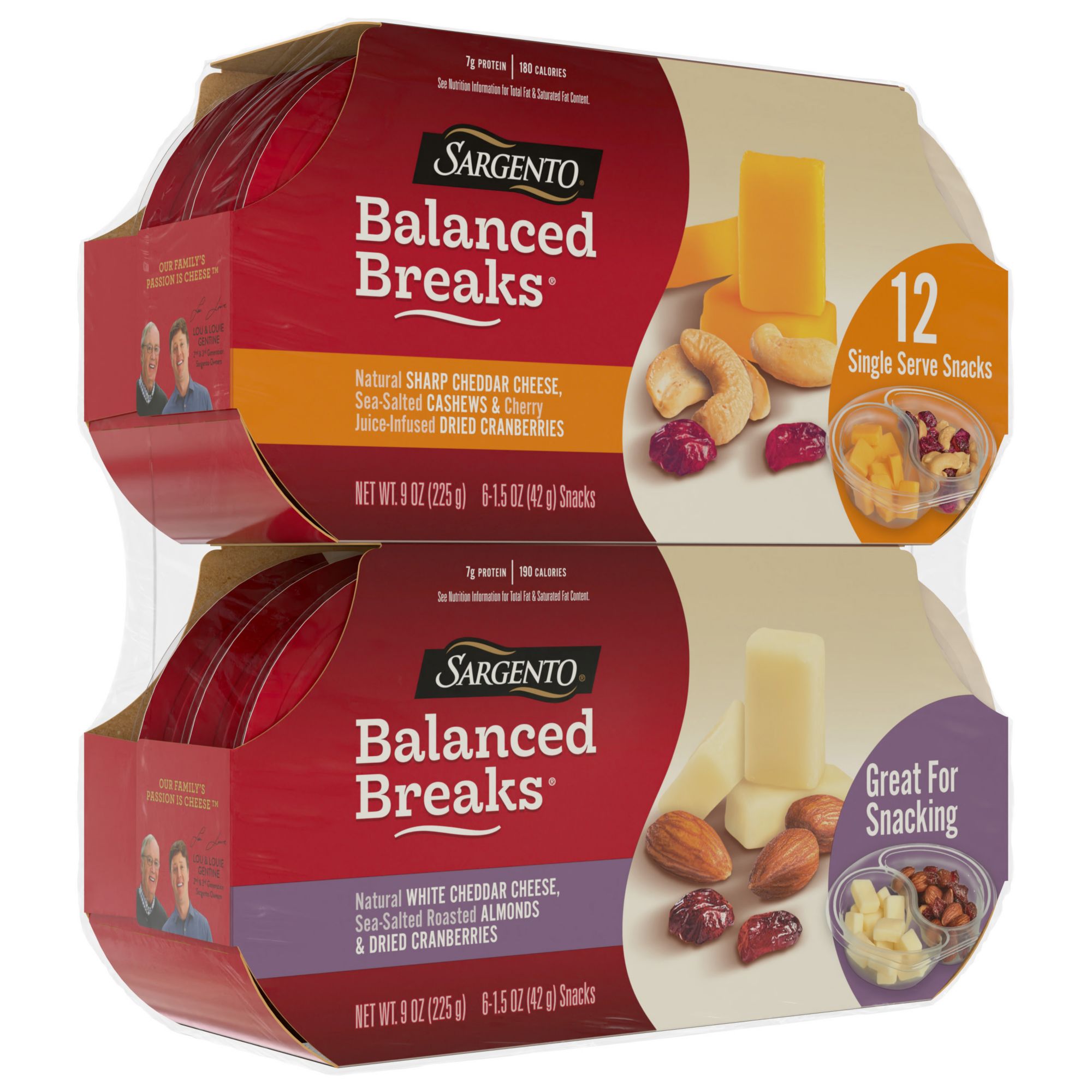 Sargento variety pack balanced breaks white cheddar cheese with almonds, cran, sharp cheddar cheese with cashews and cran Sargento balanced breaks natural sharp cheddar cheese, sea-salted cashews and cherry juice-infused dried cranberries
