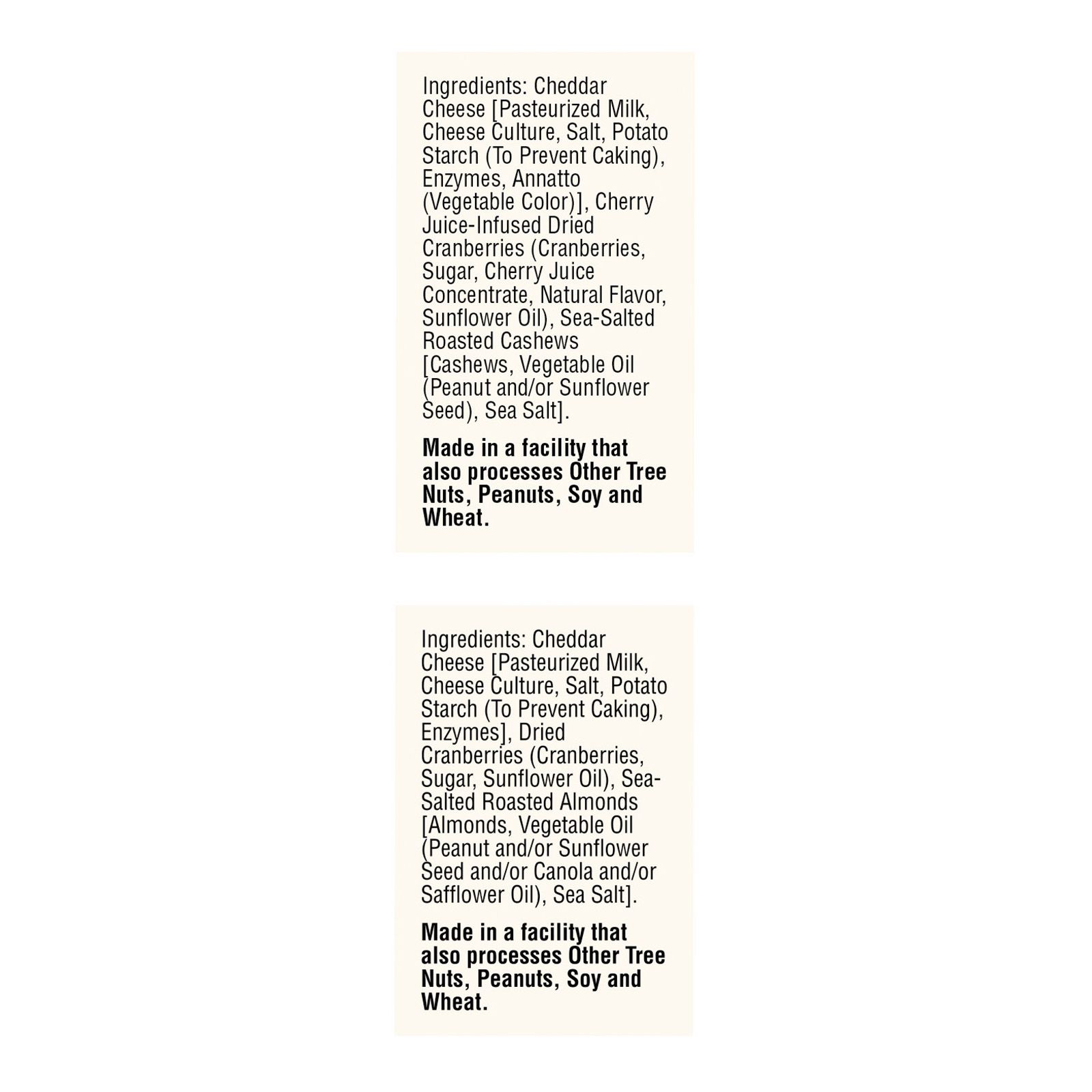 Ingredients:Sargento Variety Pack Balanced Breaks White Cheddar Cheese With Almonds, Cran, Sharp Cheddar Cheese With Cashews and Cran: Natural White Cheddar Cheese, Sea-salted Roasted Almonds and Dried Cranberries; Natural Sharp Cheddar Cheese, Sea-salted Cashews and Cherry Juice-infused Dried Cranberries Sargento Balanced Breaks Natural Sharp Cheddar Cheese, Sea-salted Cashews and Cherry Juice-infused Dried Cranberries: Natural Sharp Cheddar Cheese, Sea-salted Cashews and Cherry Juice-infused Dried Cranberries.