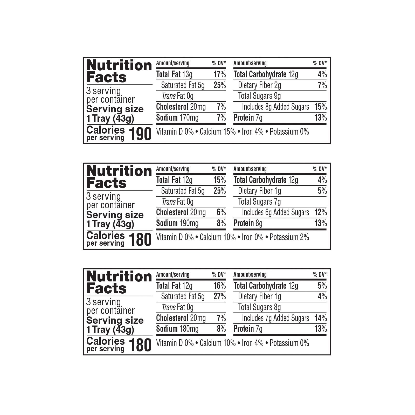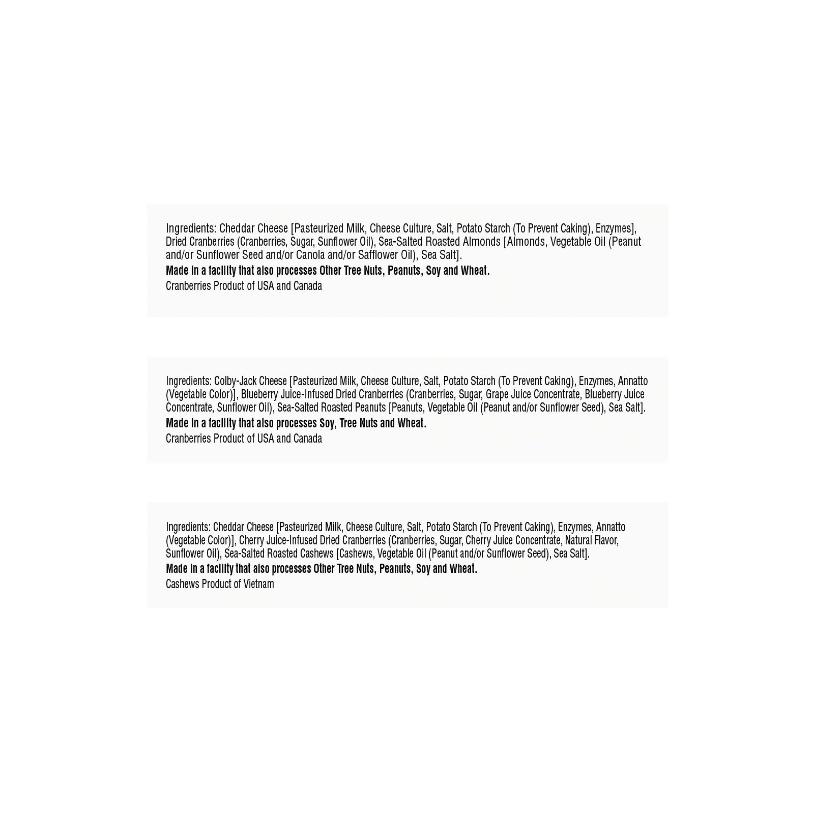 Each tray contains cheese, nuts and sweet dried fruits for a wholesome, tasty snack Every serving offers 7g of protein and contains less than 200 calories Comes with 3 types of trays: White cheddar, almonds and cranberries; sharp cheddar, cashews and cranberries; white cheddar, cashews and raisins Includes 9 snack trays; 3 of each type