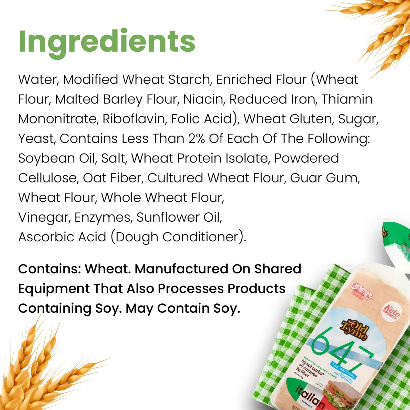 Ingredients: Water, Modified Wheat Starch, Enriched Flour (Wheat Flour, Malted Barley Flour, Niacin, Reduced Iron, Thiamin Mononitrate, Riboflavin, Folic Acid), Wheat Gluten, Sugar, Yeast, Contains Less than 2% of Each of the Following: Soybean Oil, Salt, Wheat Protein Isolate, Powdered Cellulose, Oat Fiber, Cultured Wheat Flour, Guar Gum, Wheat Flour, Whole Wheat Flour, Vinegar, Enzymes, Sunflower Oil, Ascorbic Acid (Dough Conditioner).