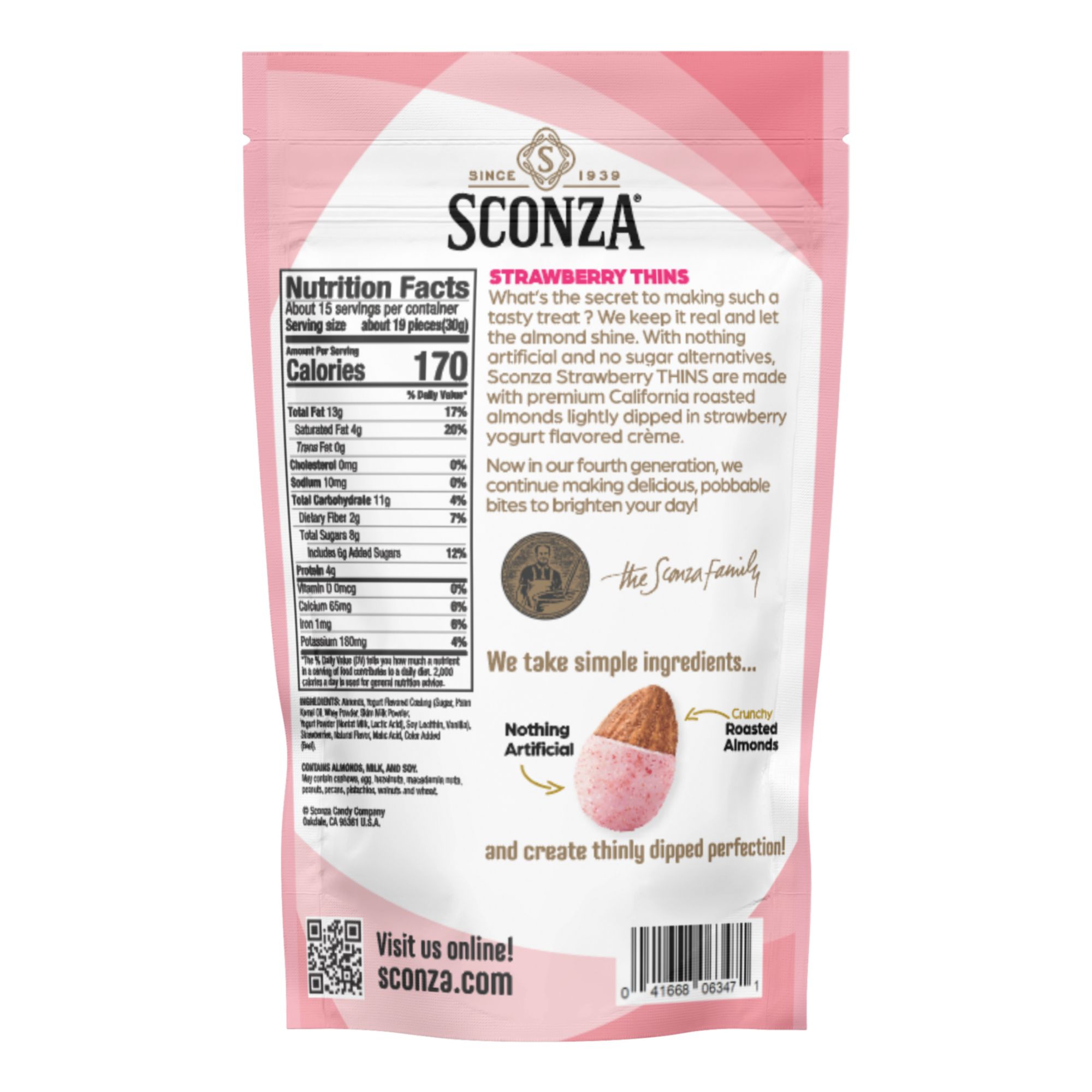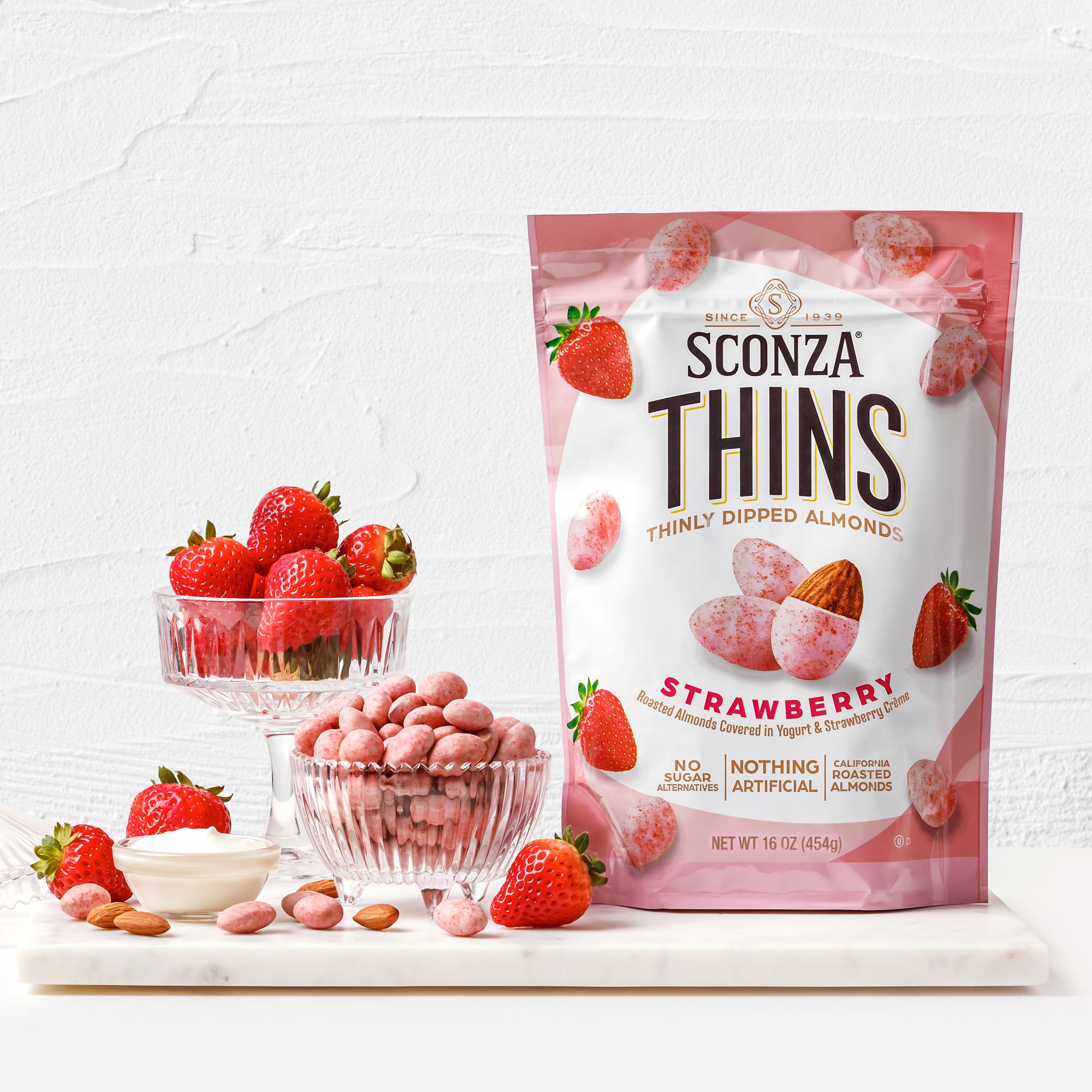 Includes Sconza Strawberry Thinly Dipped Almonds, 16 oz.
