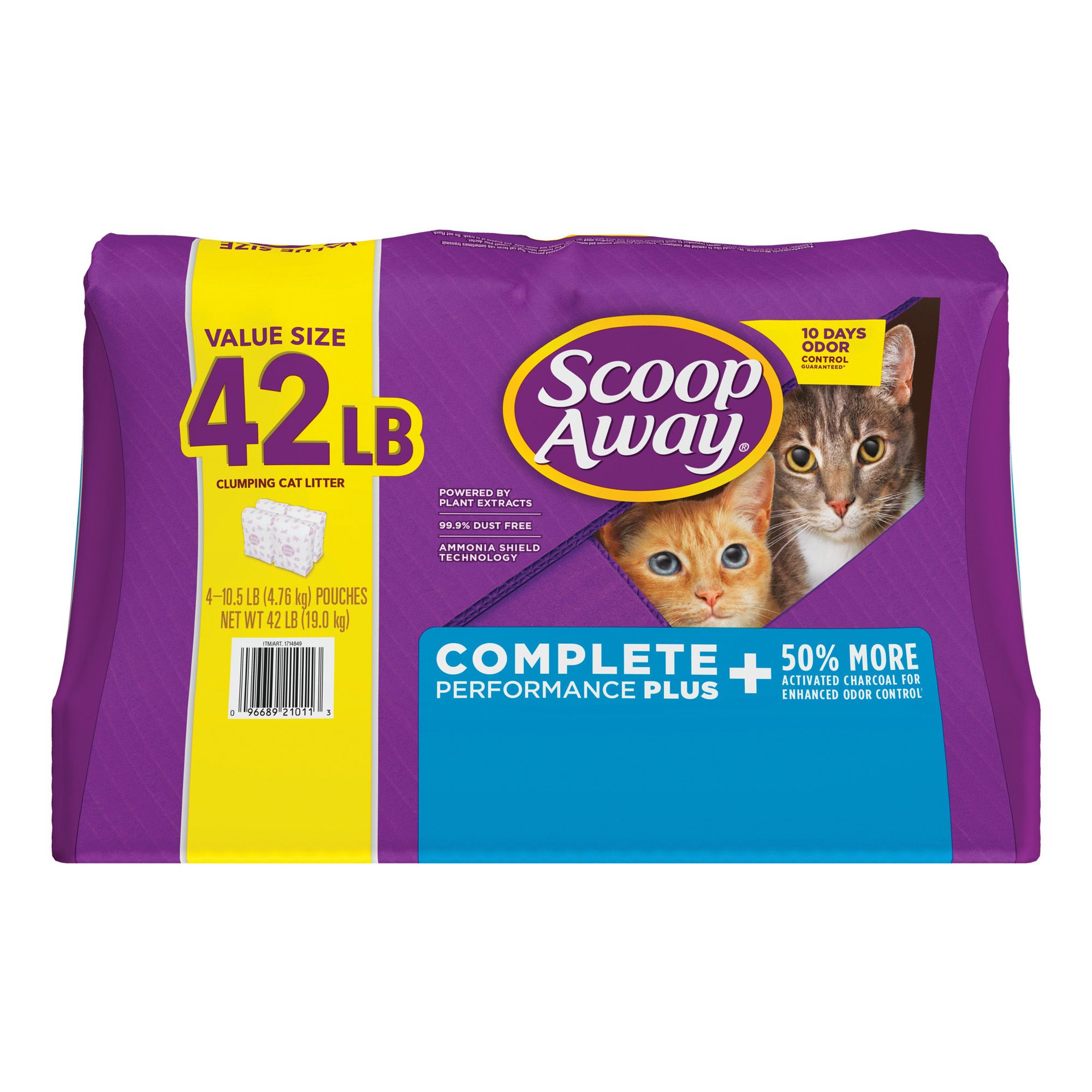CLUMPING LITTER: Four 10.5 lb. pouches of Scoop Away Complete Performance Plus Clumping Cat Litter, a scented cat litter with 50% more activated charcoal* 50% MORE ACTIVATED CHARCOAL: Cat and kitten litter destroys litter box smells with a formula that contains 50% more activated charcoal for enhanced odor control* 10 DAYS OF ODOR CONTROL: Plant extracts in this cat litter clumping formula help eliminate the strongest litter box odors and guarantee 10 days of odor control* ULTRA-STRONG CLUMPS: Cat litter Scoop Away Complete Performance forms easy-to-scoop, virtually no-crumble clumps that simplify litter box maintenance FRESH, CLEAN SMELL: Cat litter scented with a paw-activated fresh scent that's released each time your cat uses the litter box, keeping the area smelling clean and inviting Includes 4 pouches with 10.5 lb. each