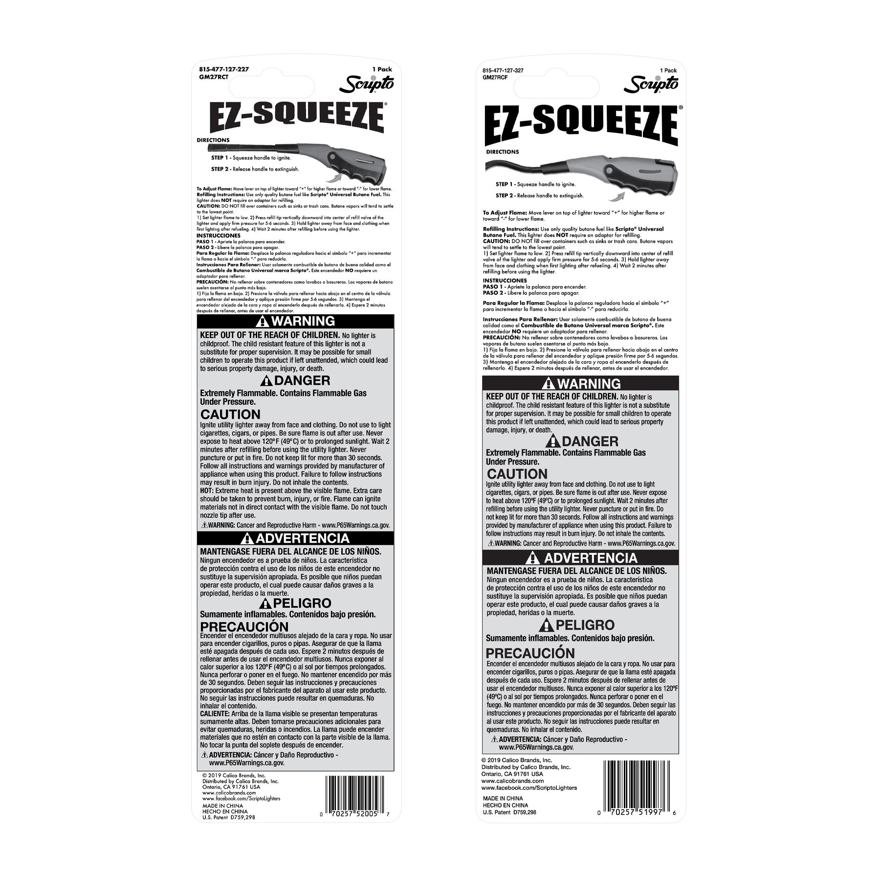The EZ squeeze torch utility lighter and EZ squeeze flex utility lighters are built with Scripto’s dedication to quality and safety. They have an adult-friendly squeeze mechanism. The items are refillable. The EZ squeeze torch lights and stay lit in windy conditions The EZ squeeze flex contains a flexible nozzle for easier access to barbecue grills, pilot lights, candles, fireplaces, and more.