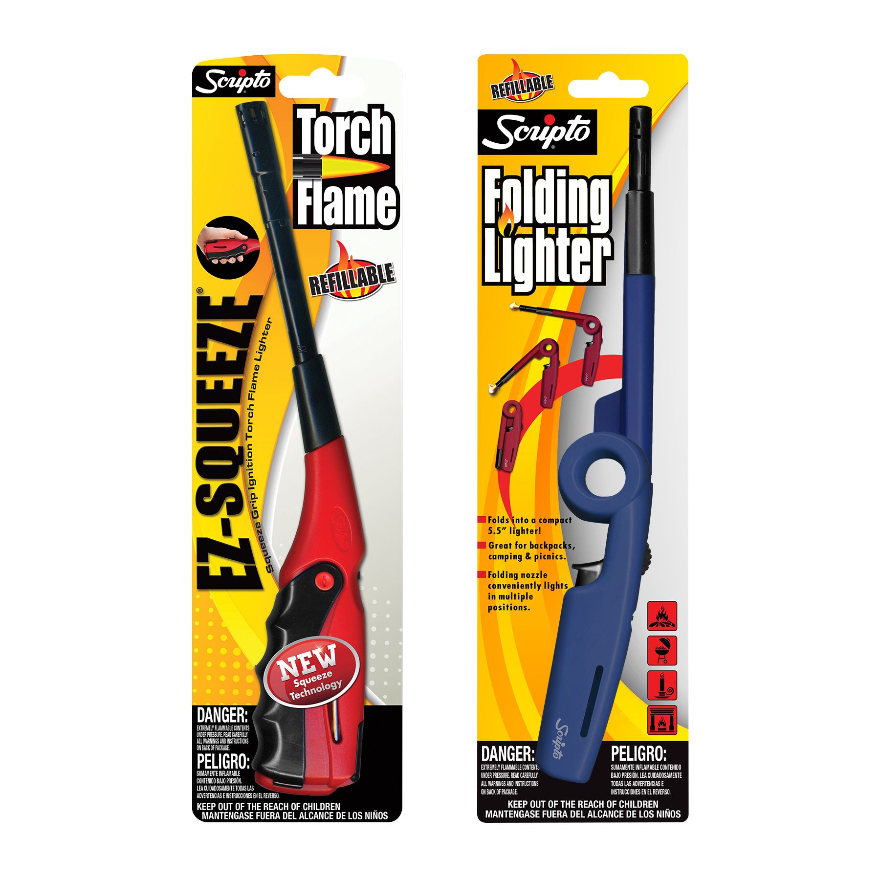The EZ Squeeze Torch utility lighter and folding utility lighter both are built with Scripto's dedication to quality and safety. The folding lighter folds into compact 5.5" for easy storage. It lights in multiple positions. The EZ Squeze torch lights stay lit in windy conditions and have an adult-friendly squeeze mechanism. The items are refillable.
