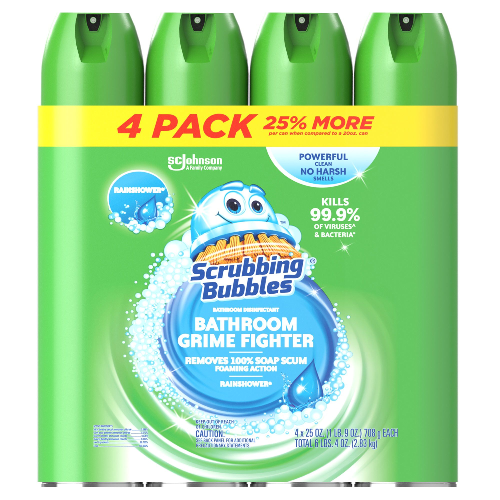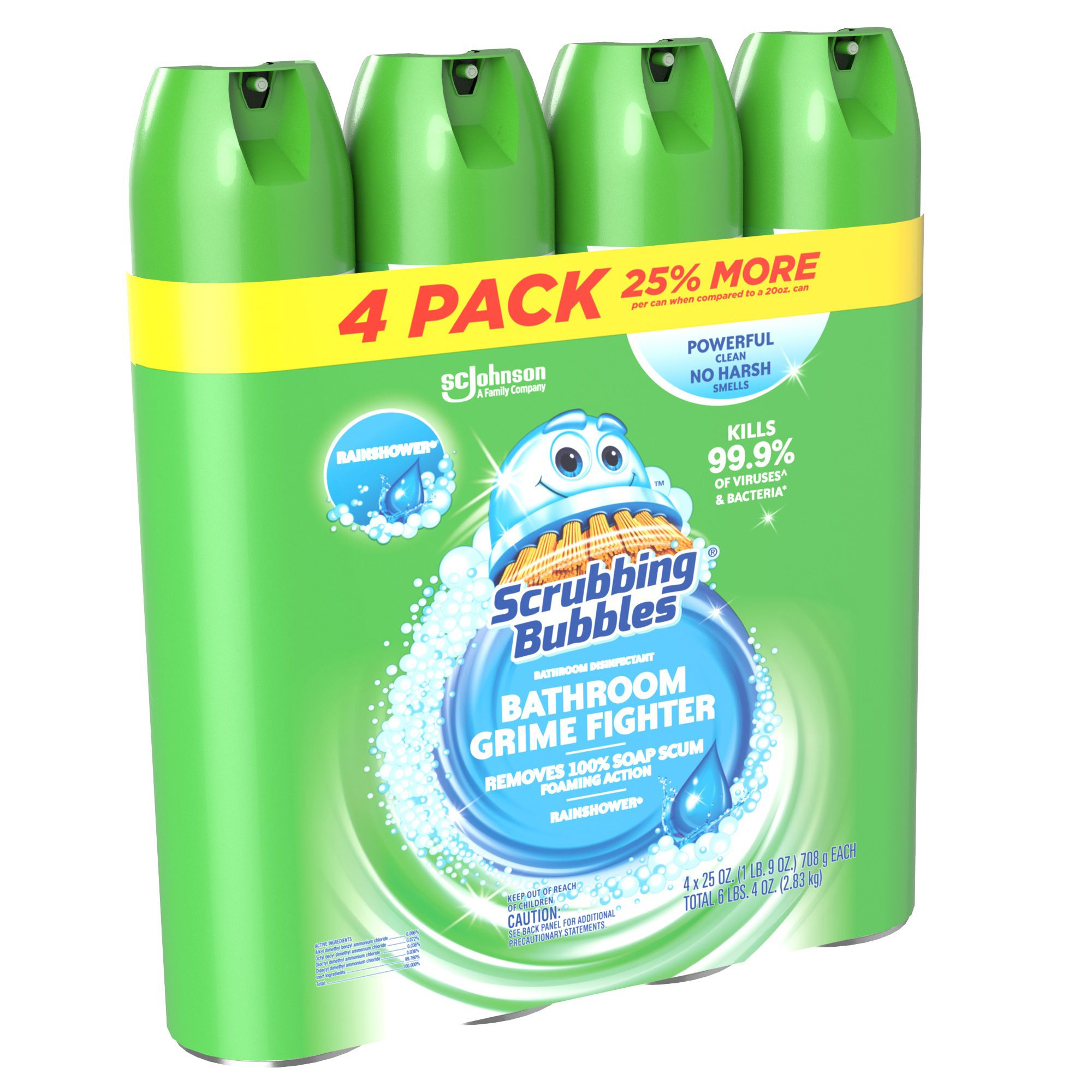 To kill 99% of common bacteria in your bathroom with a fresh, clean scent, use Scrubbing Bubbles bathroom cleaner. It's ideal for tubs, bathroom sinks, showers, shower doors, and more. Included are four 25-oz. cans of Scrubbing Bubbles Bathroom Cleaner.