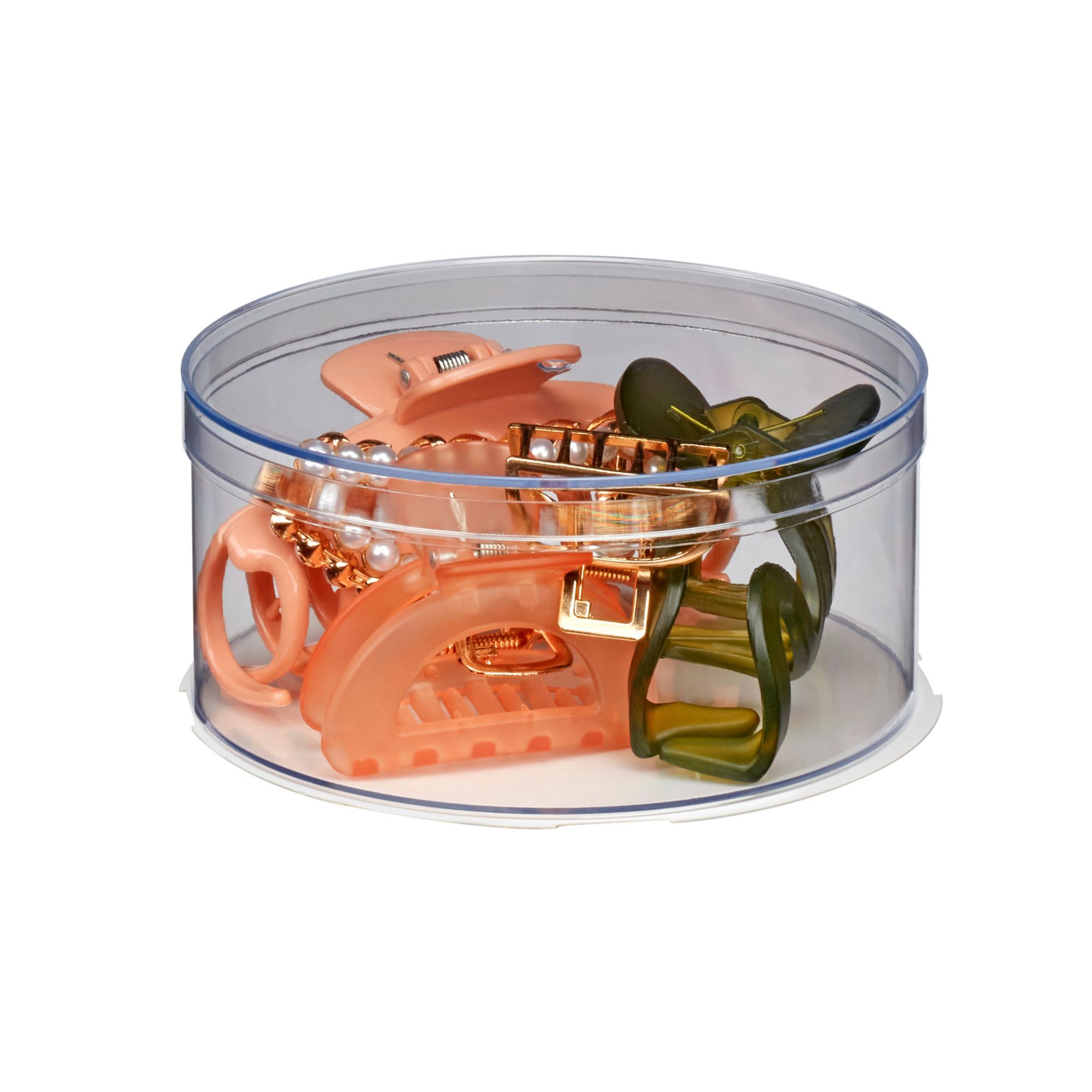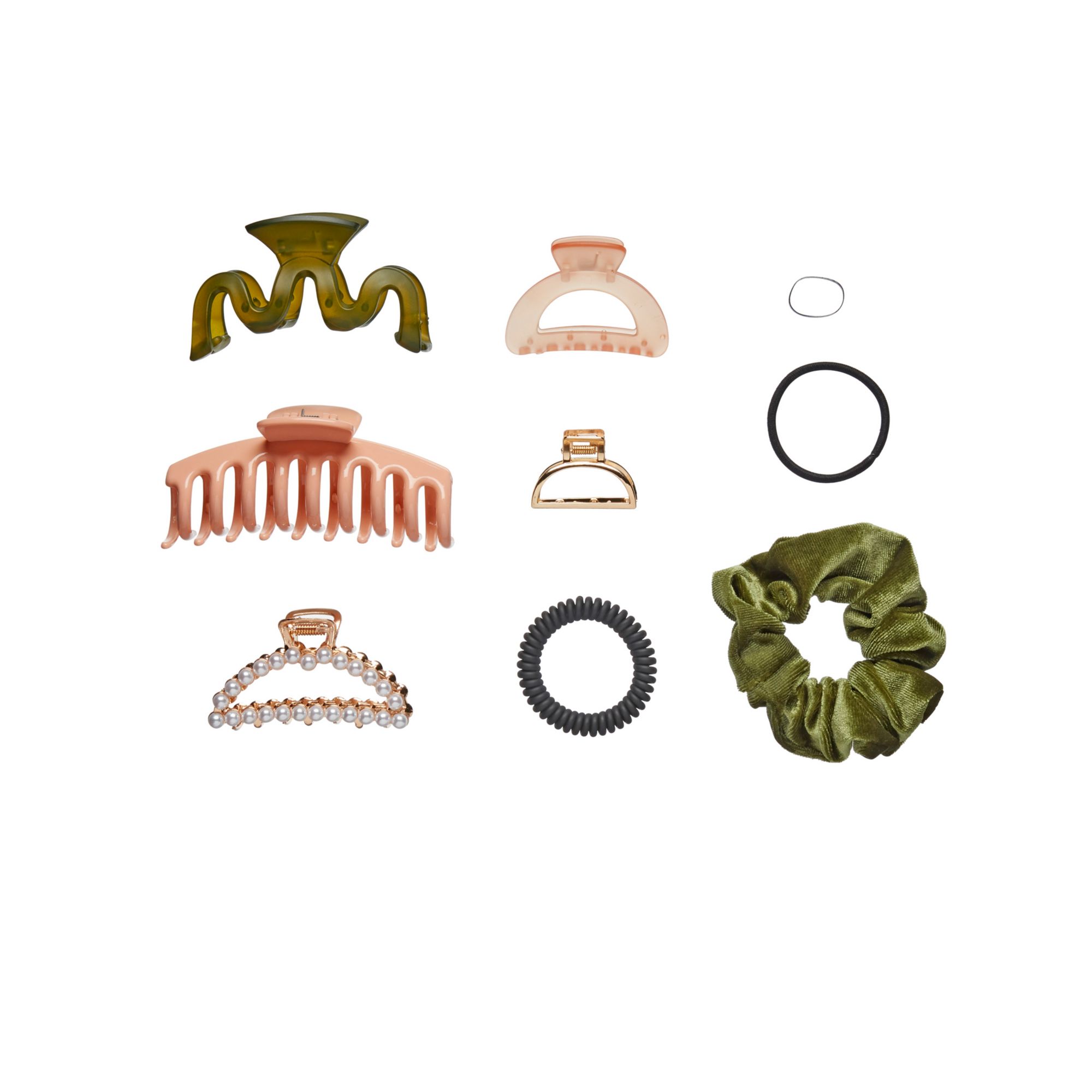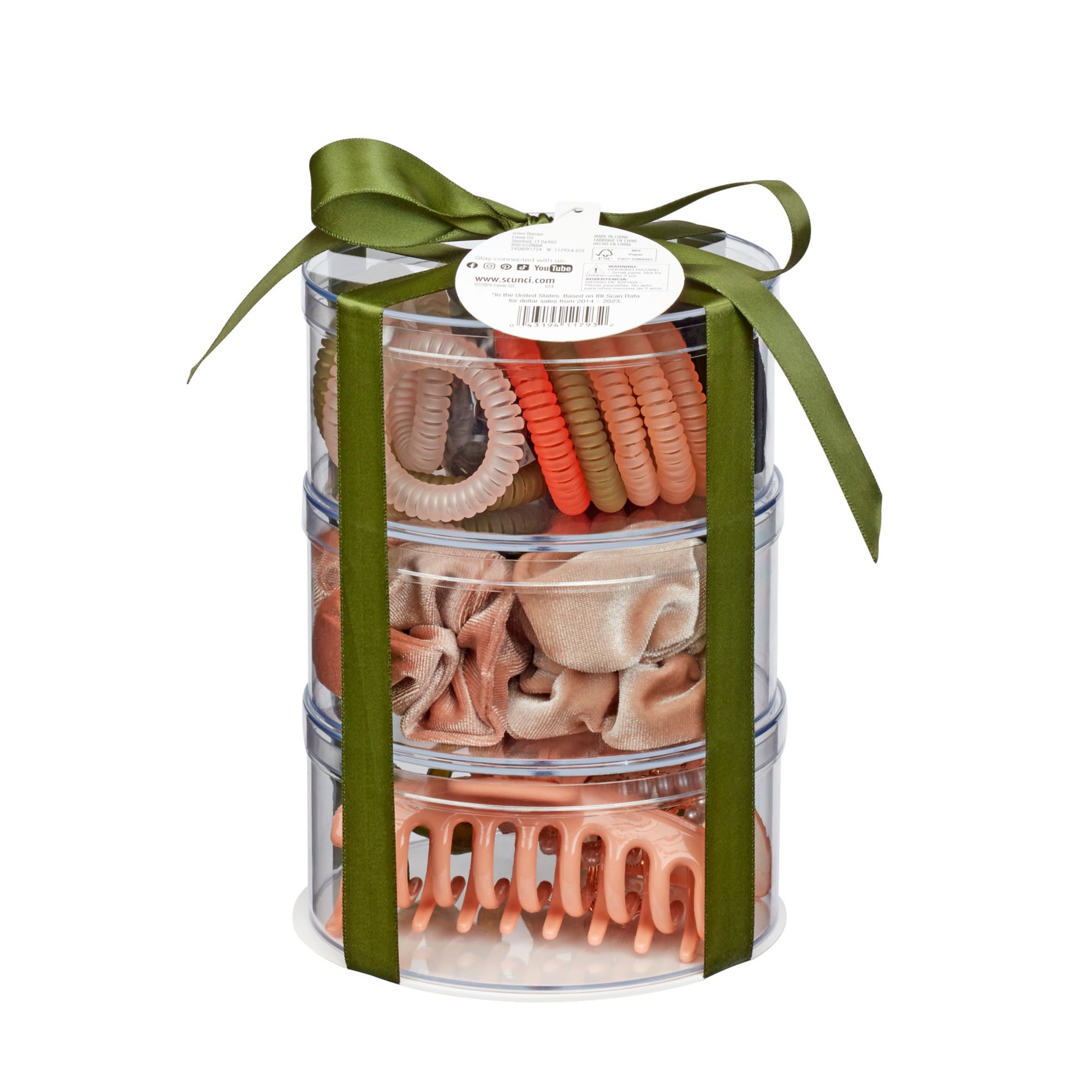Discover infinite styling possibilities with this versatile 93-piece accessory set. Three stackable storage cylinders hold 15 spiral hair ties, 15 black elastic hair tie elastics, 5 velvet scrunchies, and 5 chic claw clips, ensuring you're always ready to create great looks. This stunning collection features gentle-on-hair plastic spirals ties, classic no-damage elastic hair ties, and 50 mini black polybands that are ideal for every hair type with a secure hold that keeps hairstyles in place all day. Embrace versatility with a spectrum of dark, natural colors — black, dark green, orange, pink, and cream — plus an eclectic mix of claw clip shapes and styles: from elegant faux pearl-covered to bold gold-tone. Whether you’re going for sleek sophistication or playful charm, this set has you covered, ensuring your locks always dazzle with effortless style. Your hair will thank you for the upgrade!