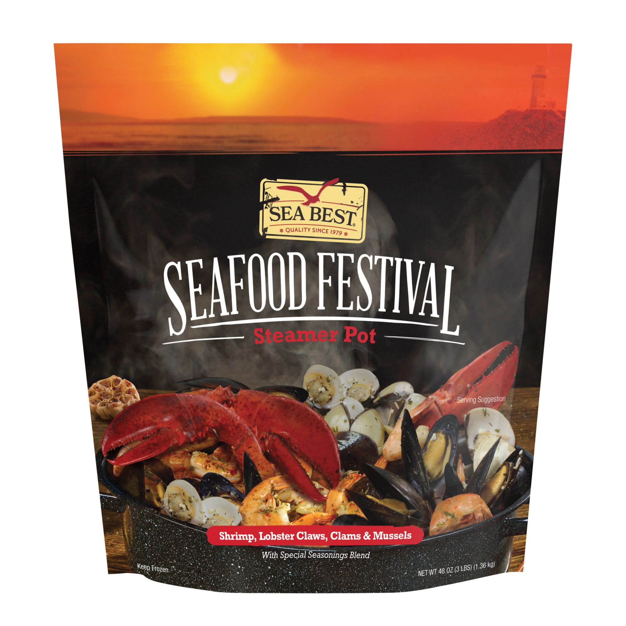 Sea Best Seafood Festival Steamer Pot with special seasonings blend brings a simple solution to enjoying seafood, with a convenient all-in-one bag of favorites. A select combination of Shrimp, Lobster Claws, Clams and Mussels delivers all of the best tastes from the sea. With an easy one-pot preparation, seafood lovers can celebrate the new convenience of great seafood.