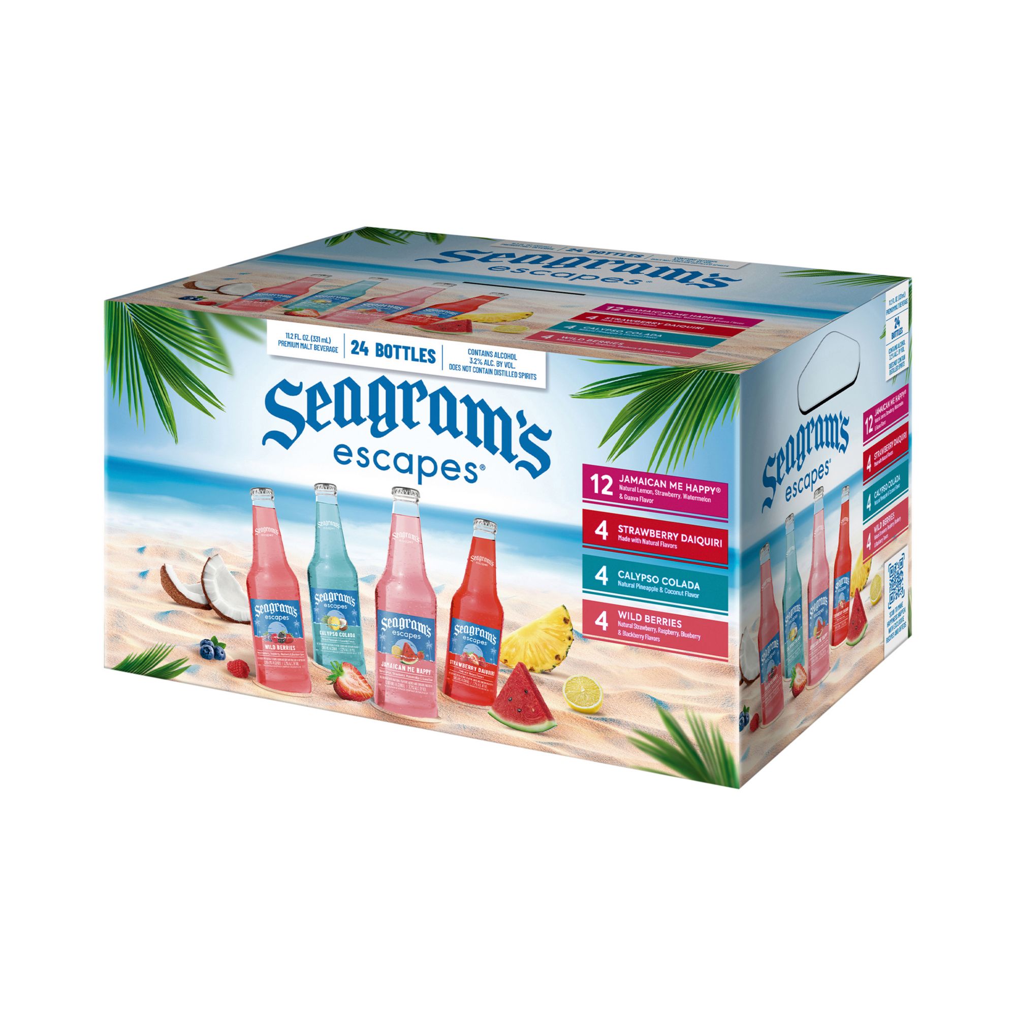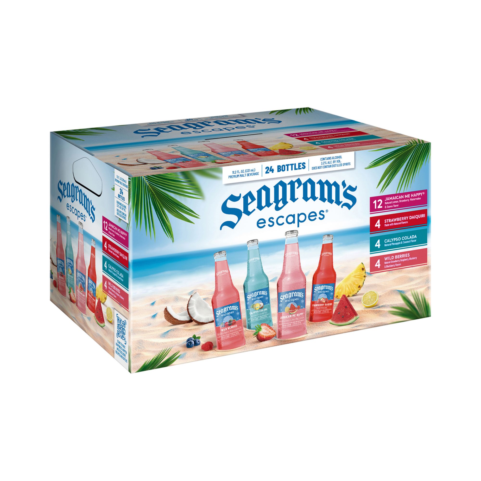Seagrams Variety Coolers includes 12 bottles of Jamaican Me Happy: lemon, strawberry, watermelon and guava flavors. The pack includes 4 bottles of Strawberry Daiquiri. The pack includes 4 bottles of Calypso Colada: pineapple and coconut flavors. The pack includes 4 bottles of Wild Berries: strawberry, raspberry, blueberry and blackberry flavors. Now with more Jamaican Me Happy. Malt beverage (beer in TX). seagramsescapes.com. 3.2% alc. by vol.