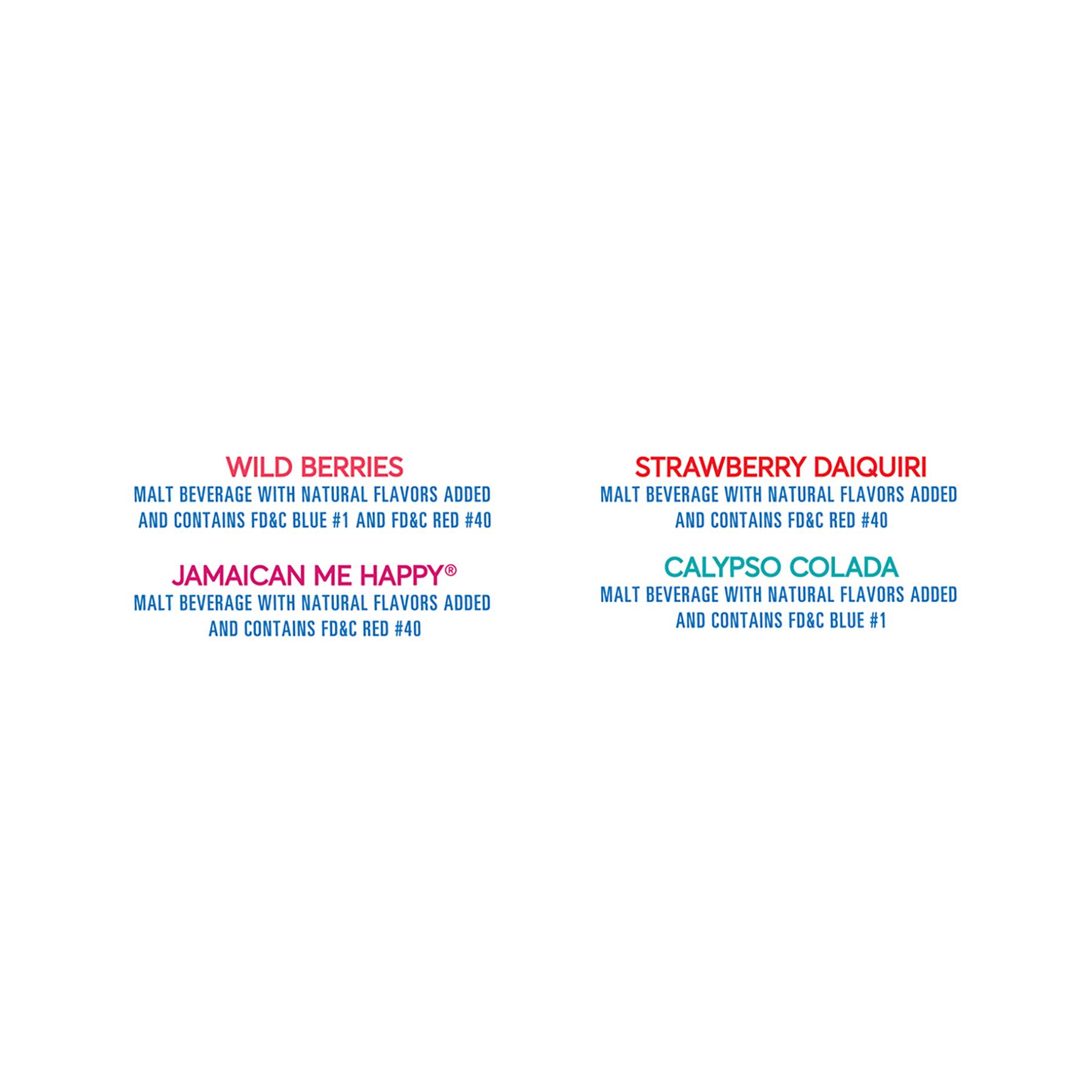 Ingredients: Wild Berries: Malt Beverage with Natural Flavor & Contains FD&C Blue 1, FD&C Red 40. Strawberry Daiquiri: Malt Beverage with Natural Strawberry Flavor & Other Natural Flavors & Contains FD&C Red 40. Jamaican Me Happy: Malt Beverage with Natural Flavors Added & Contains FD&C Red 40. Calypso Colada: Malt Beverage with Natural Flavors & Contains FD&C Blue 1.