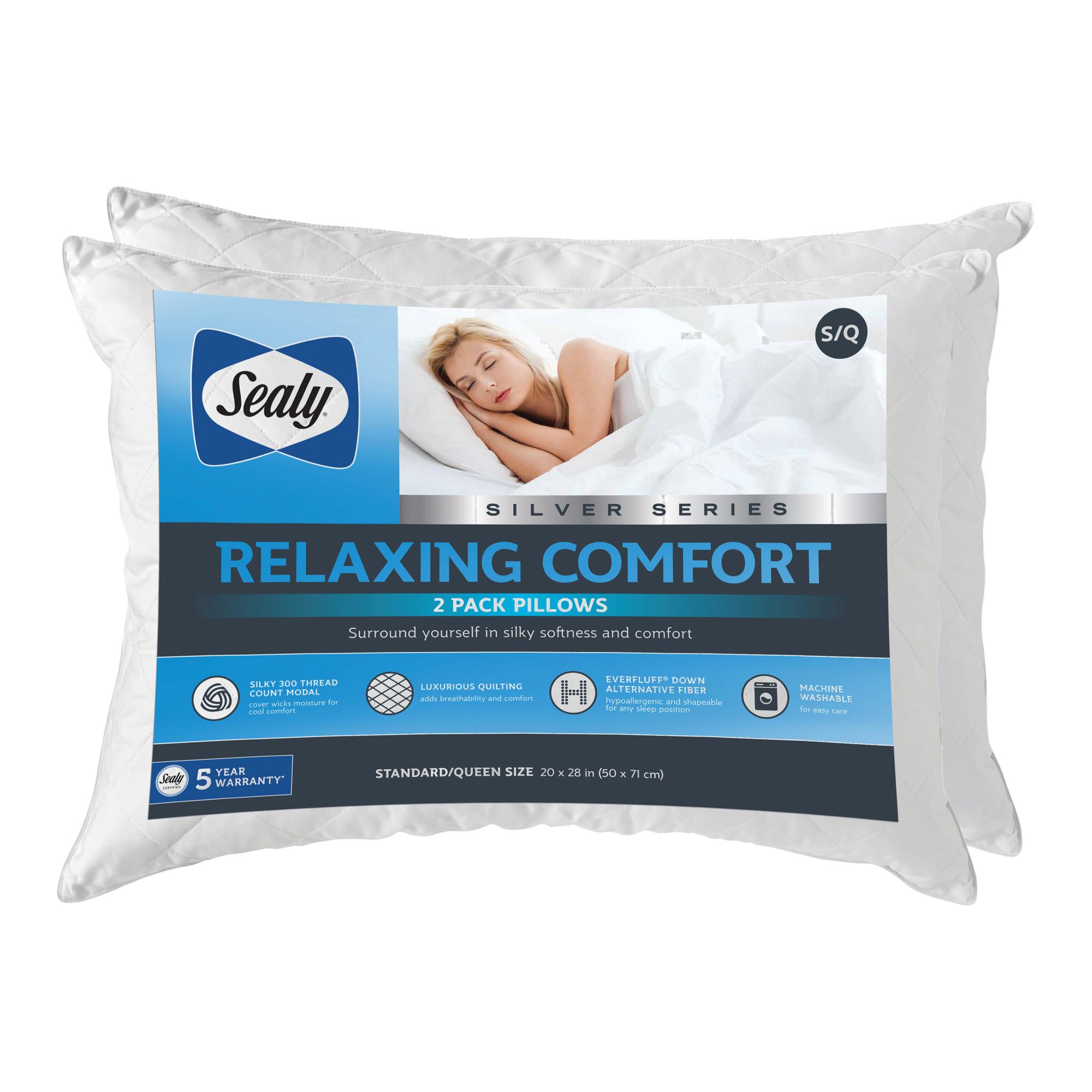 Surround yourself in silky softness and comfort with the Sealy Silver Series Relaxing Comfort Pillow. The silky 300-thread count modal fabric cover wicks moisture for cool comfort while you sleep. The luxurious quilting adds breathability comfort. The EVERFLUFF Down Alternative Fiber is hypoallergenic and shapeable for any sleep position. These pillows are machine washable for easy care and continued use.