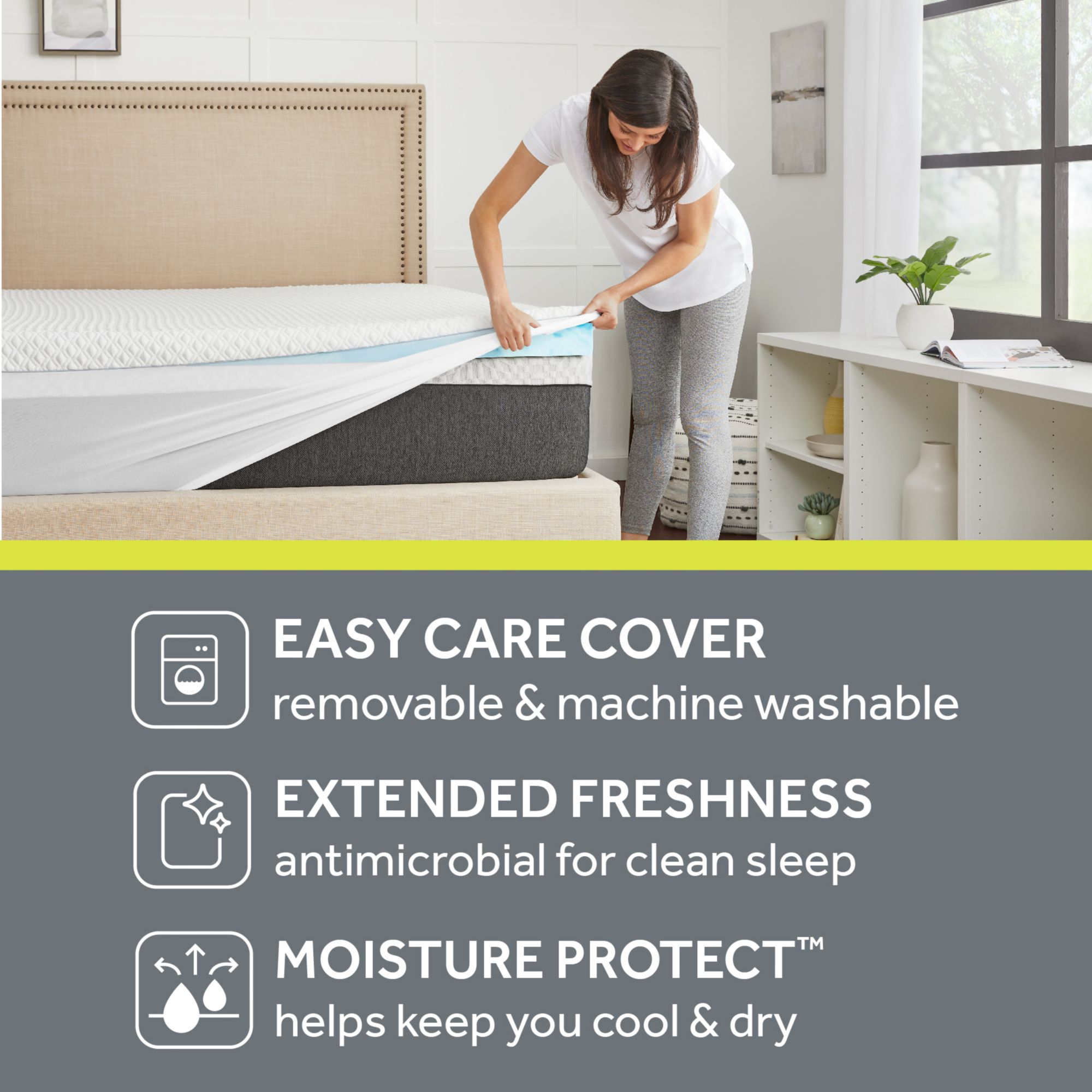Antimicrobial fibers in the cover help protect the topper against common allergens