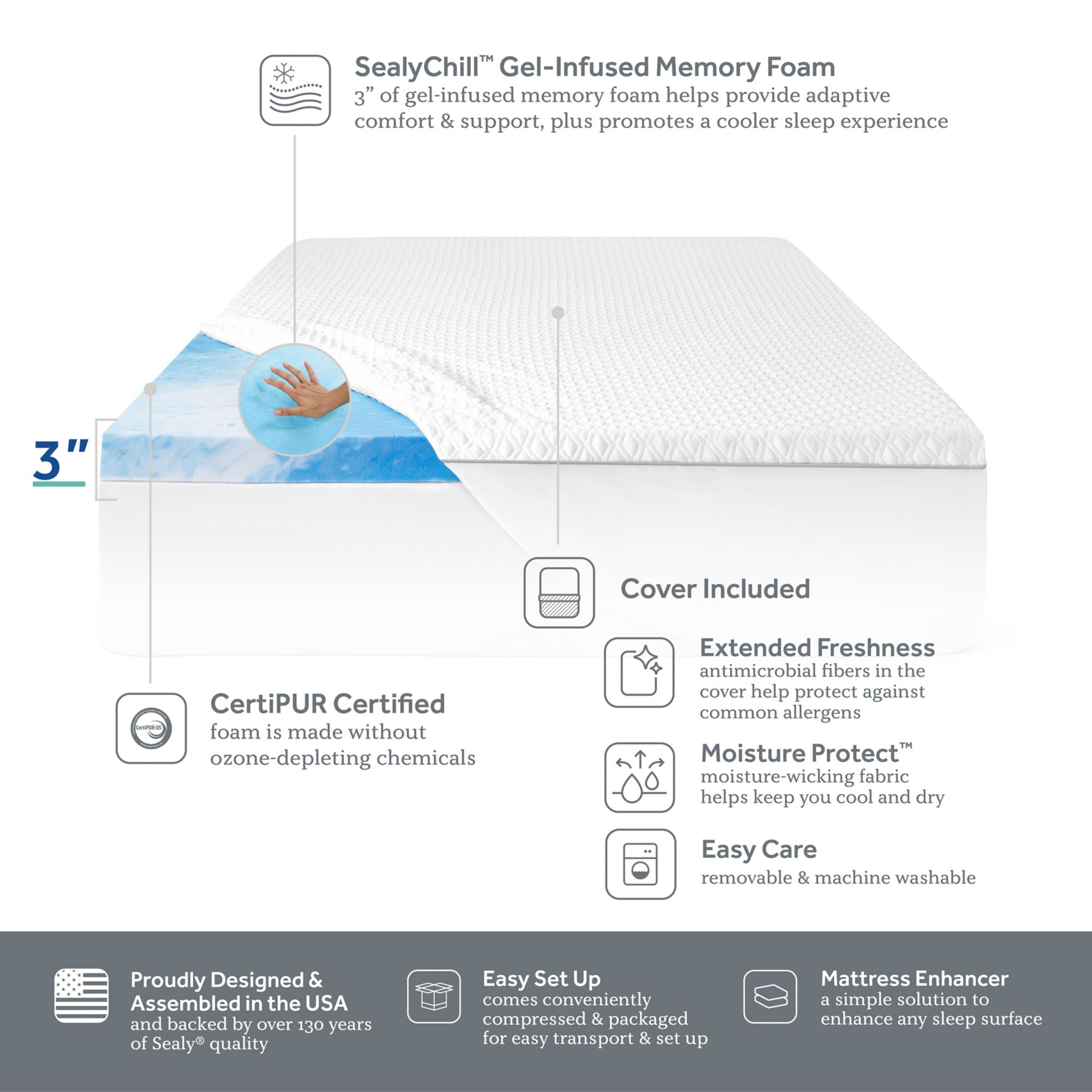 Revitalize your mattress with a 3-inch layer of plush comfort. A mattress topper with 3-inch of depth can aid in restoring a worn-down mattress and helps cradle and support your body more than thinner topper options. This innovative topper features SealyChill Gel-Infused Memory Foam – a combination of gel and conforming memory foam which helps provide adaptive comfort and support. Plus, gel-infusion promotes a cooler sleep experience. Paired with an included antimicrobial and moisture-wicking cover for cool and clean benefits, this topper serves as a simple, yet effective sleep solution.