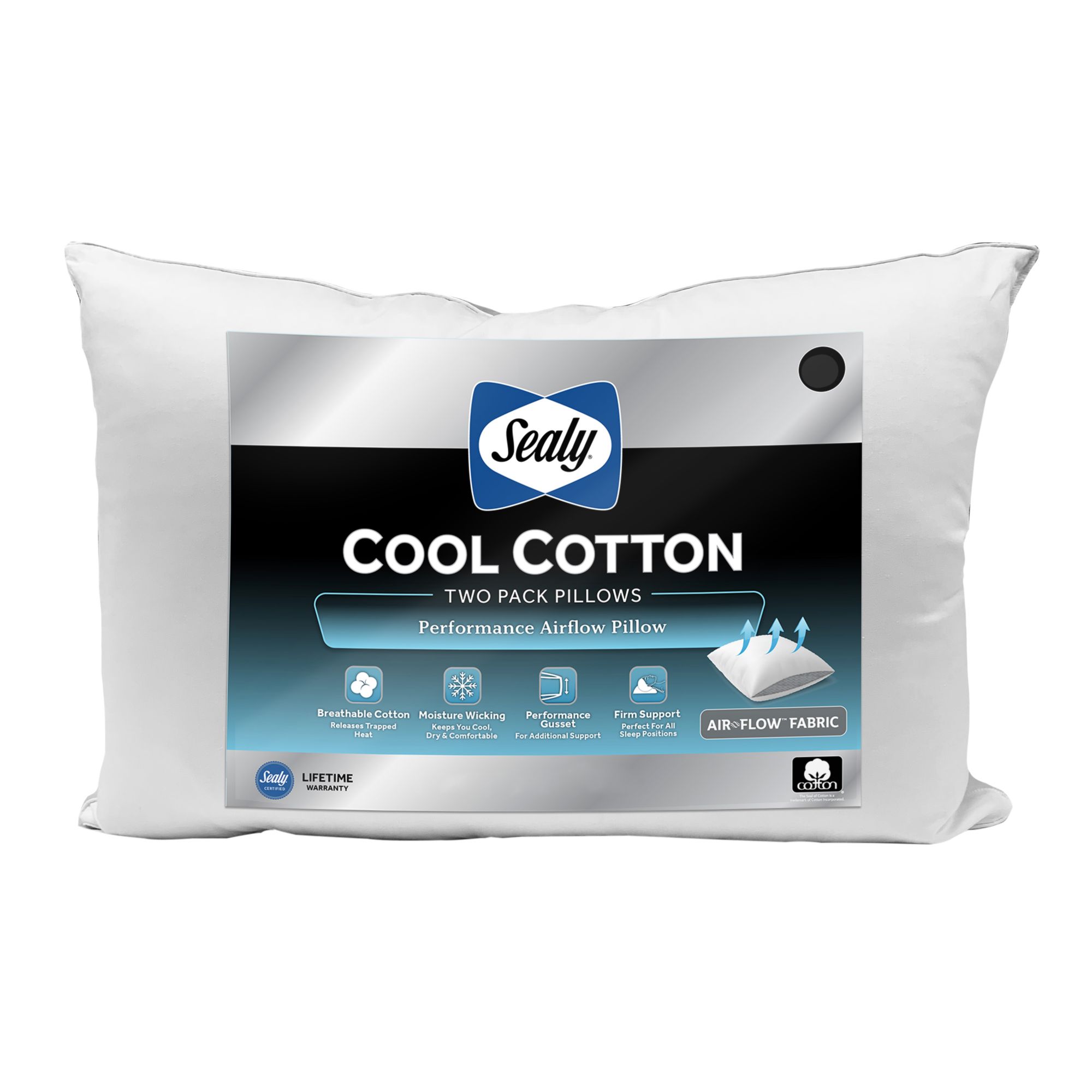 Includes 2 standard/queen size pillows 100% breathable cotton Moisture wicking AirFlow fabric Performance gussett for additional support Machine washable Sealy Certified Lifetime Warranty
