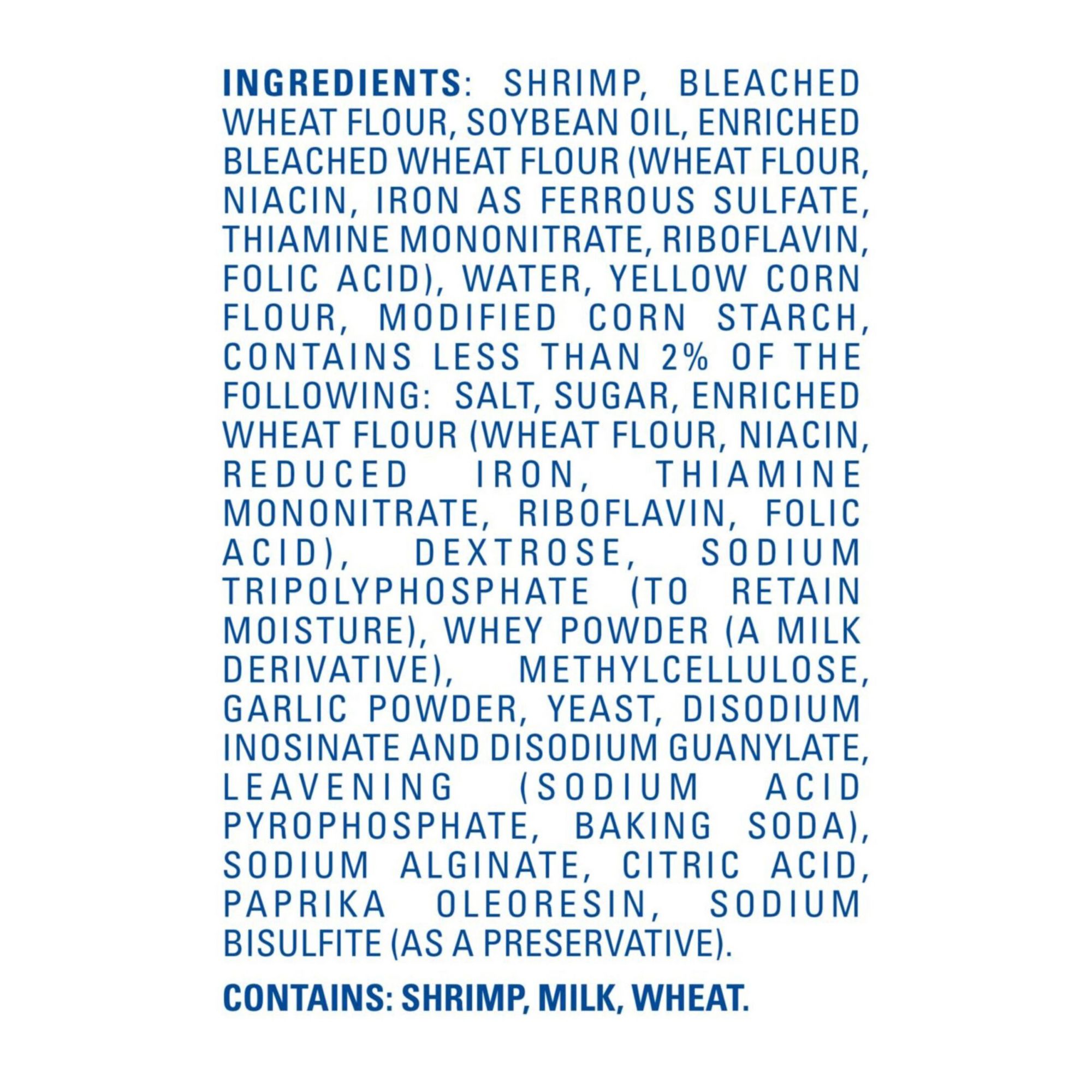 Ingredients: Shrimp, Bleached Wheat Flour, Soybean Oil, Enriched Bleached Wheat Flour (Wheat Flour, Niacin, Iron As Ferrous Sulfate, Thiamine Mononitrate, Riboflavin, Folic Acid), Water, Yellow Corn Flour, Modified Corn Starch, Contains Less Than 2% Of The Following: Salt, Sugar, Enriched Wheat Flour (Wheat Flour, Niacin, Reduced Iron, Thiamine Mononitrate, Riboflavin, Folic Acid), Dextrose, Sodium Tripolyphosphate (To Retain Moisture), Whey Powder (A Milk Derivative), Methylcellulose, Garlic Powder, Yeast, Disodium Inosinate And Disodium Guanylate, Leavening (Sodium Acid Pyrophosphate, Baking Soda), Sodium Alginate, Citric Acid, Paprika Oleoresin, Sodium Bisulfite (As A Preservative).