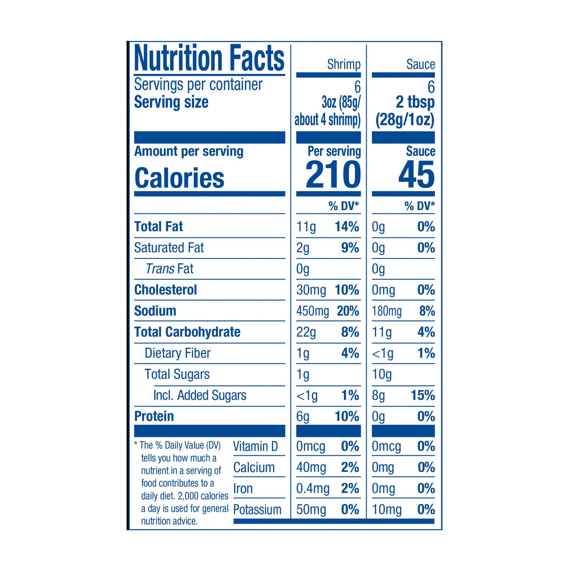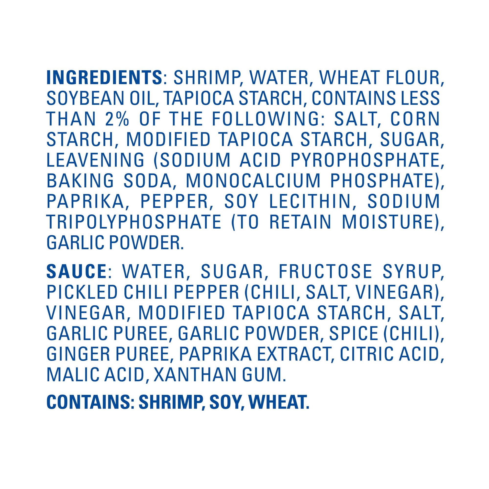 Ingredients: Shrimp, Water, Wheat Flour, Soybean Oil, Tapioca Starch, Contains Less Than 2% Of The Following: Salt, Corn Starch, Modified Tapioca Starch, Sugar, Leavening (Sodium Acid Pyrophosphate, Baking Soda, Monocalcium Phosphate), Paprika, Pepper, Soy Lecithin, Sodium Tripolyphosphate (To Retain Moisture), Garlic Powder. Sauce: Water, Sugar, Fructose Syrup, Pickled Chili Pepper (Chili, Salt, Vinegar), Vinegar, Modified Tapioca Starch, Salt, Garlic Puree, Garlic Powder, Spice (Chili), Ginger Puree, Paprika Extract, Citric Acid, Malic Acid, Xanthan Gum. Contains: Shrimp, Soy, Wheat Derived From Bioengineering.