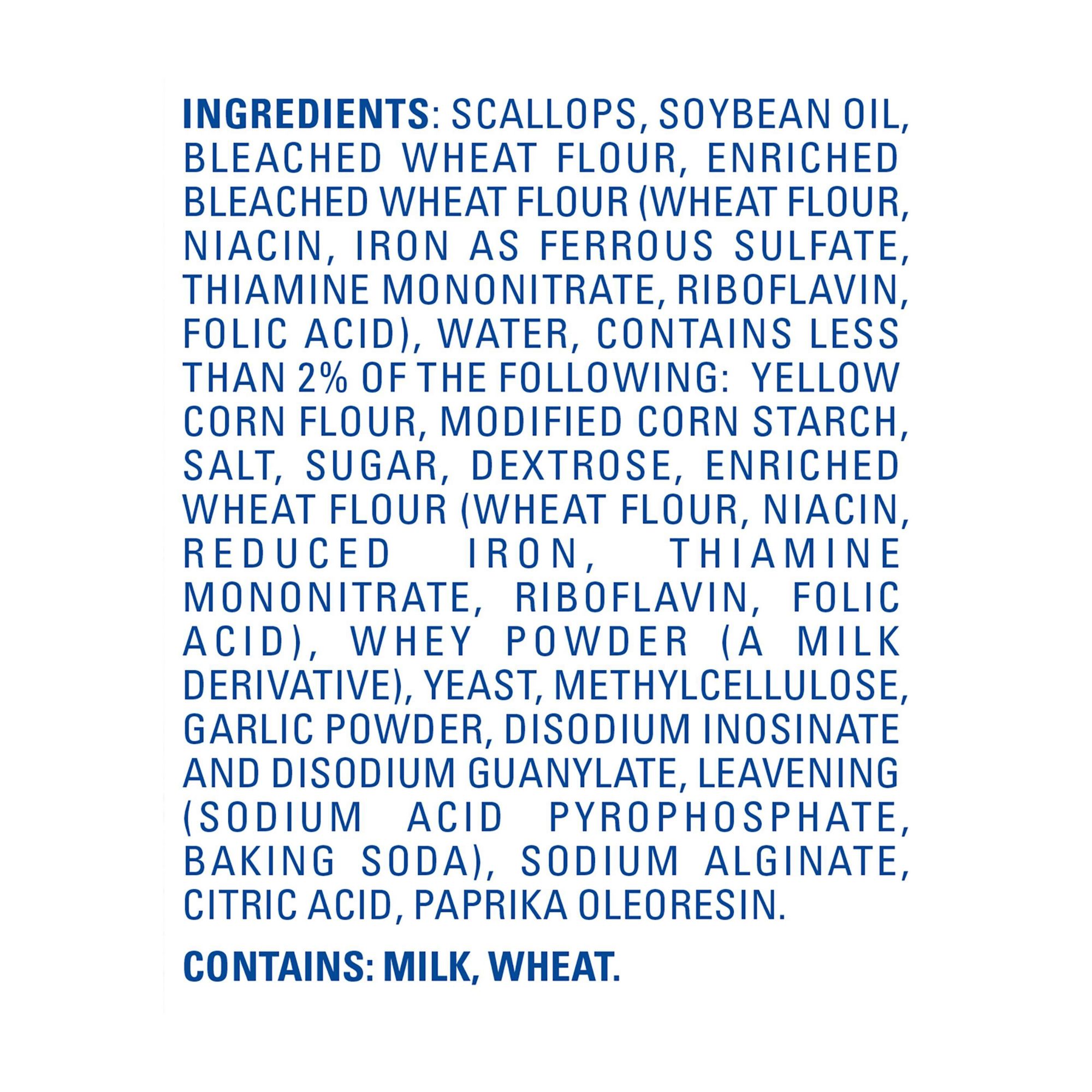 Ingredients: Scallops, Soybean Oil, Bleached Wheat Flour, Enriched Bleached Wheat Flour (Wheat Flour, Niacin, Iron As Ferrous Sulfate, Thiamine M Ononitrate, Riboflavin, Folic Acid), Water, Contains Less Than 2% Of The Following: Yellow Corn Flour, Modified Corn Starch, Salt, Sugar, Dextrose, Enriched Wheat Flour (Wheat Flour, Niacin, Reduced Iron, Thiamine Mononitrate, Riboflavin, Folic Acid), Whey Powder (A Milk Derivative), Yeast, Methylcellulose, Garlic Powder, Disodium Inosinate And Disodium Guanylate, Leavening (Sodium Acid Pyrophosphate, Baking Soda), Sodium Alginate, Citric Acid, Paprika Oleoresin.